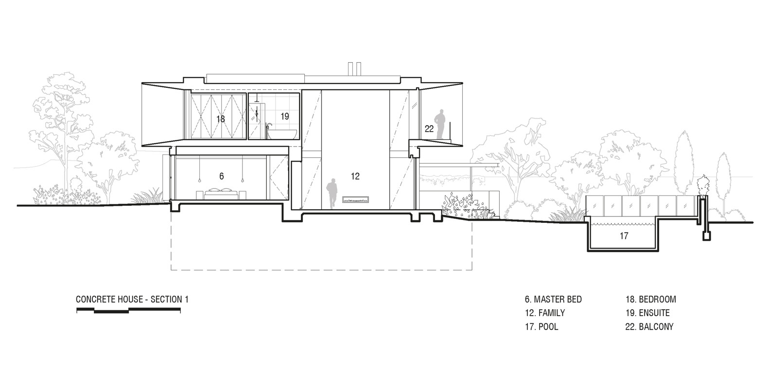 The tapered concrete form provides a lens to maximise views to both front (over the newly landscaped Rick Eckersley garden) and rear (toward the city) whilst east and west elevations are windowless and restrict sightlines to neighbours. At ground level the Kitchen and Master Bed on the east have views and access onto secluded garden breezeways. The rear elevation follows a similar story to the front albeit with an open ground plane and accentuated eave protection to both levels of the northern living spaces.