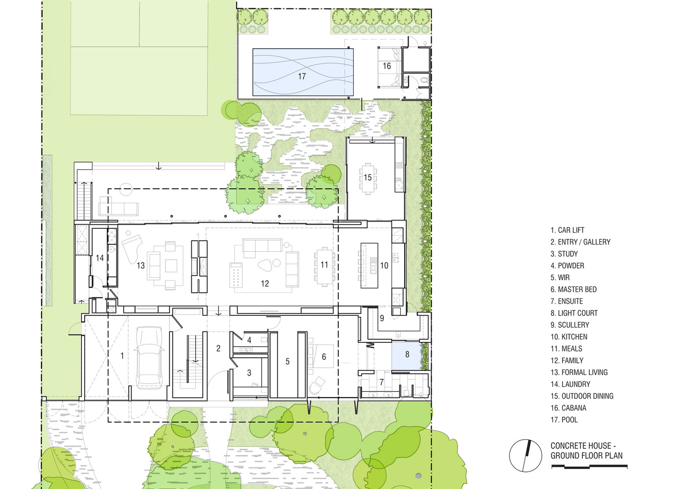 This site is north orientated and virtually square in dimension with a tennis court doglegged at the rear. It resides amongst a neighbourhood of sizeable blocks within an eclectic mix of mostly detached houses. The positioning of the building on the site was dictated by a 10m frontage set back. In order to gain maximum northern exposure and to maximise the rear POS an east-west band is positioned as far forward as possible offering the most responsive footprint.