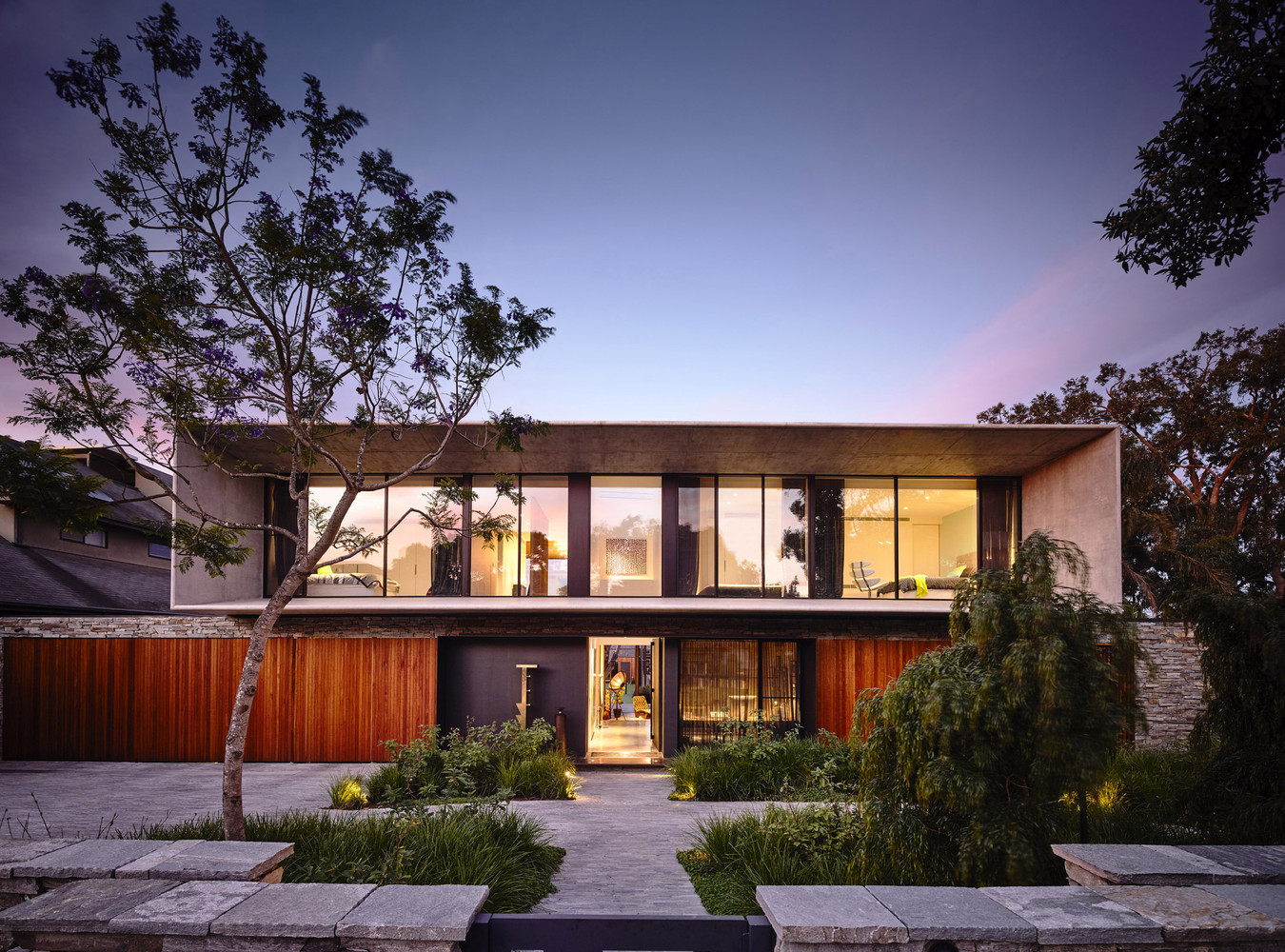 With nods to the desired mid century modernist brief thecompositional palette, along with use of the clients specially sourced stone on the exterior, is designed specific to client needs. Whilst there is significant scale in some spaces, the house is highly organised and space efficient, with clear zoning that supports both family life and individual privacy. Of particular satisfaction for us is that this house is designed specifically as a beautiful backdrop to this family’s life – blending art, landscape and natural comfort.