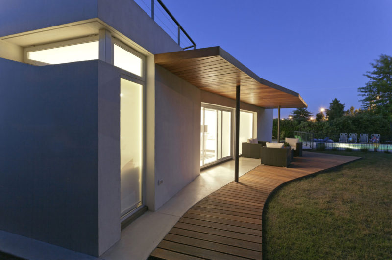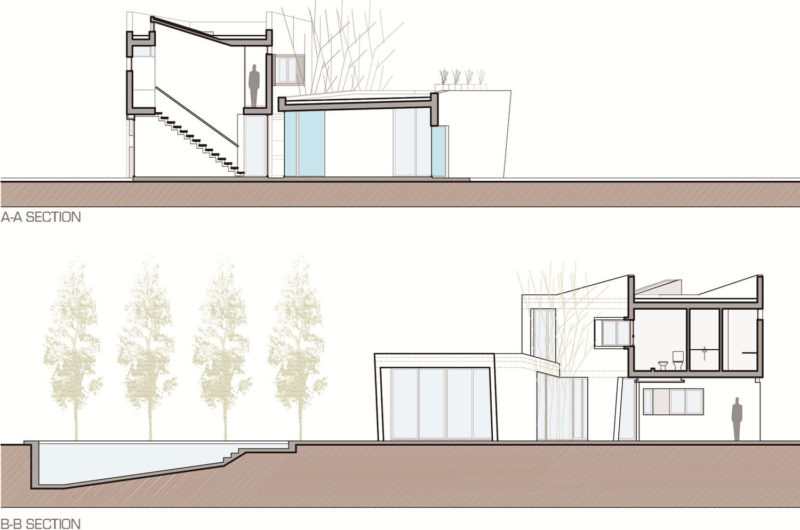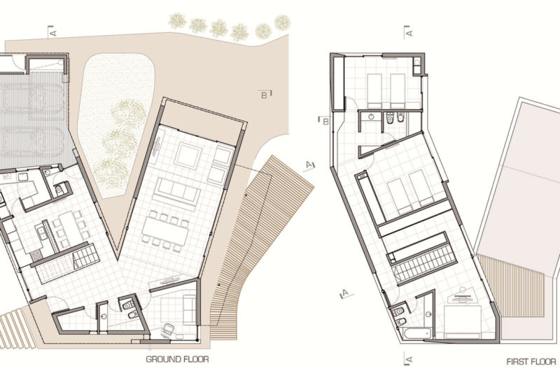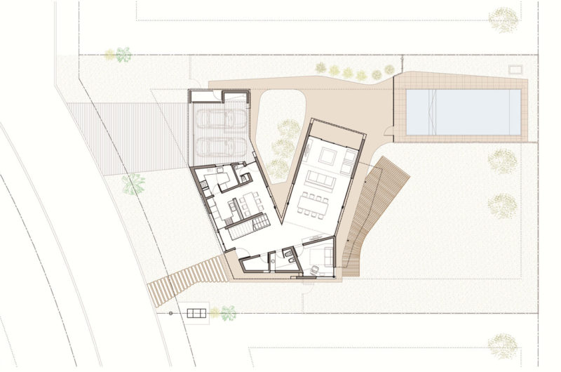 The pool area looks like a natural extension of the house, and it has a direct relationship with the two-car garage and storage area. The floor level includes the entrance, an entry hall, and the living-dining area, while the first floor holds two bedrooms on one side, and a suite on the other. The two levels of the house are connected by a contemporary staircase.