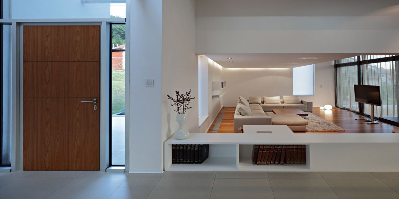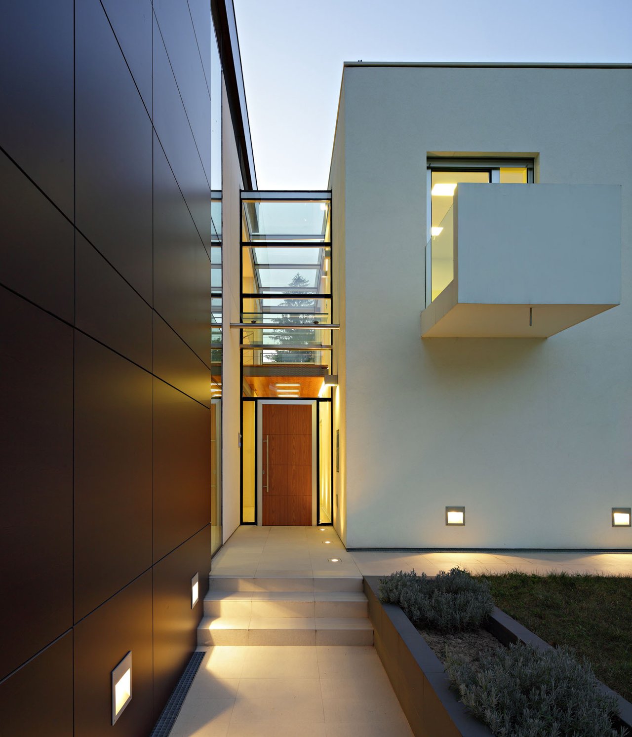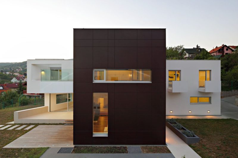 The J20 House located in Zagreb, Croatia was designed by DAR612 with the aim of creating a warm and welcoming place for a family. Placed on a gentle gradient, this residence consists of the superposition of a longitudinal wing with white finish and a perpendicular one coated in a dark wood layer. Its T-shaped form offers views from all sides and the two story-high entries separate the house into two segments connected by a wooden bridge.