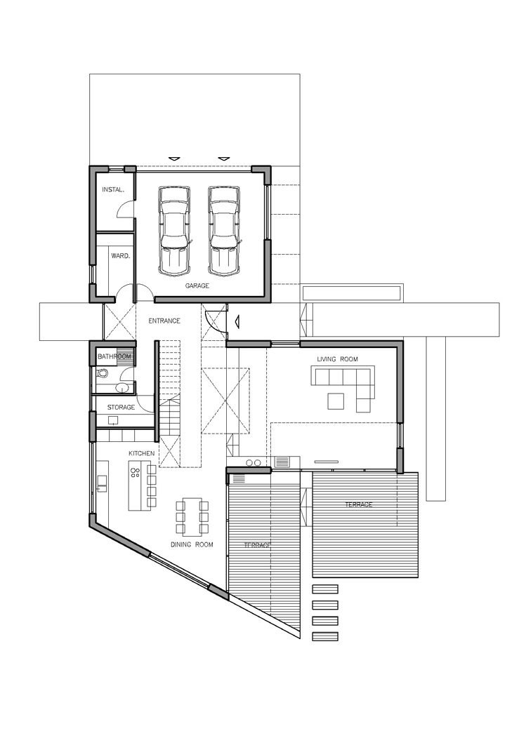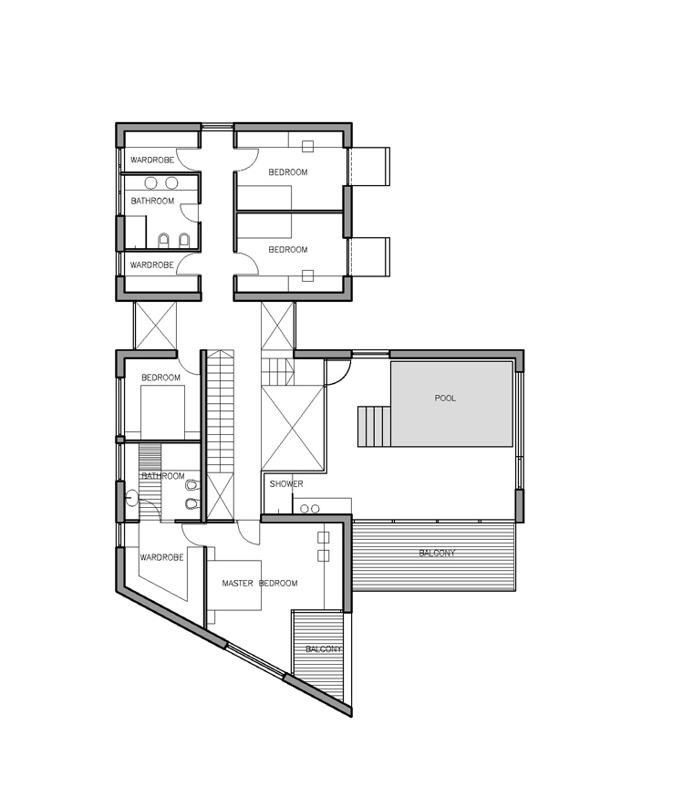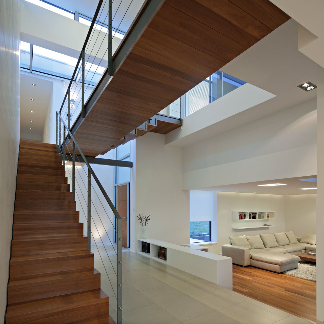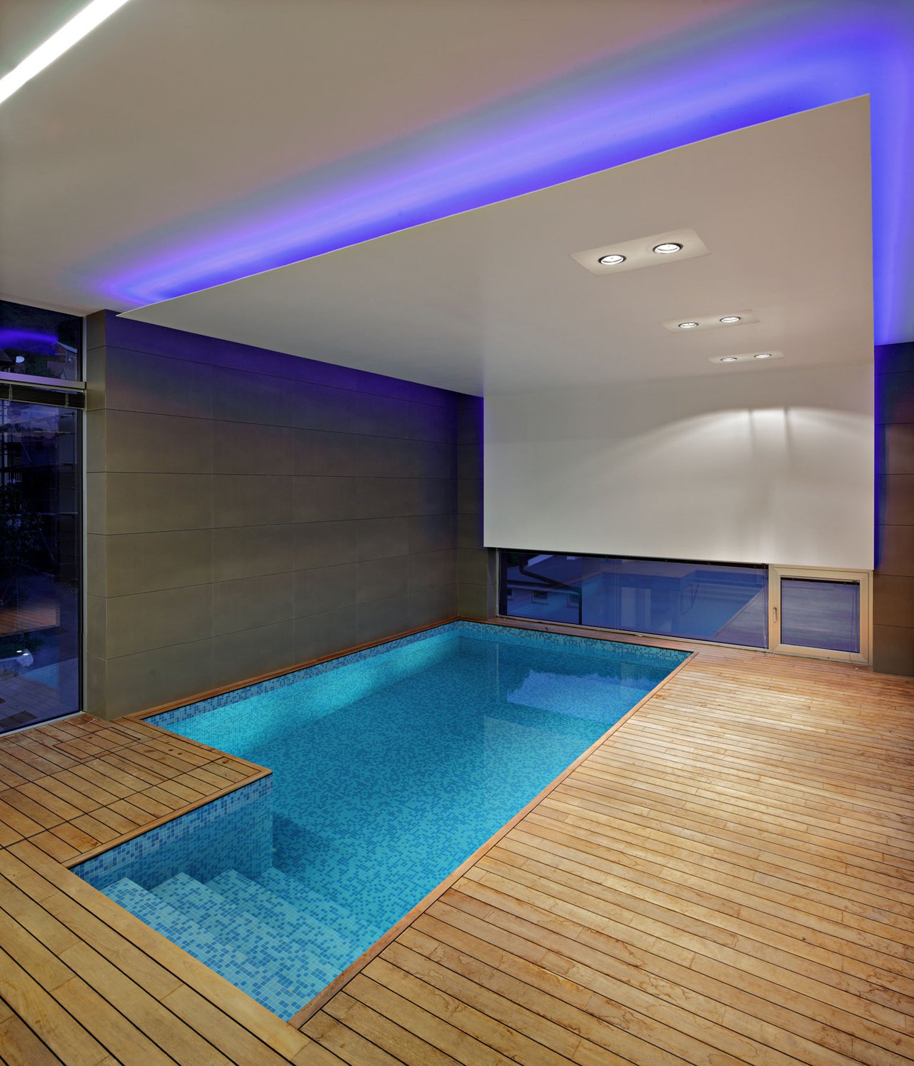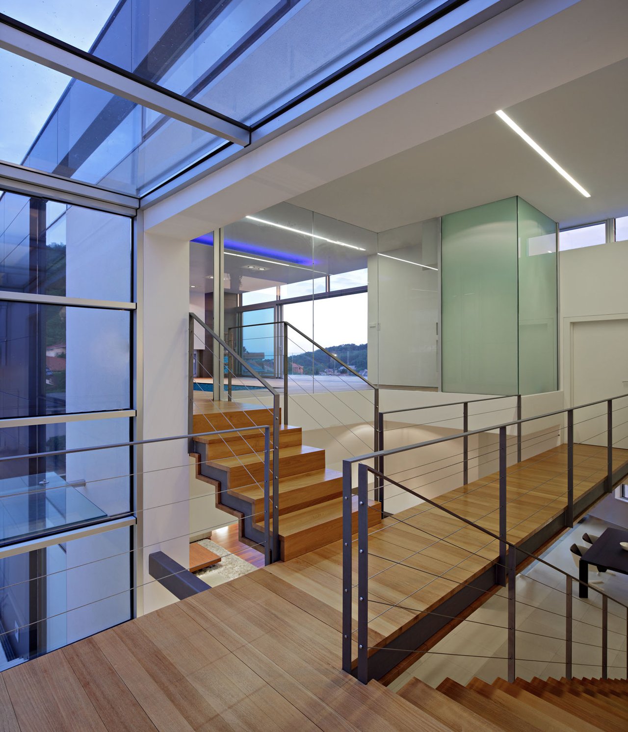 The pool is located above the living room and can be glimpsed for all around the house. The core of the residence is comprised of the stairs and the bridge that are designed as a steel structure with wooden paneling that gently unifies the interior.