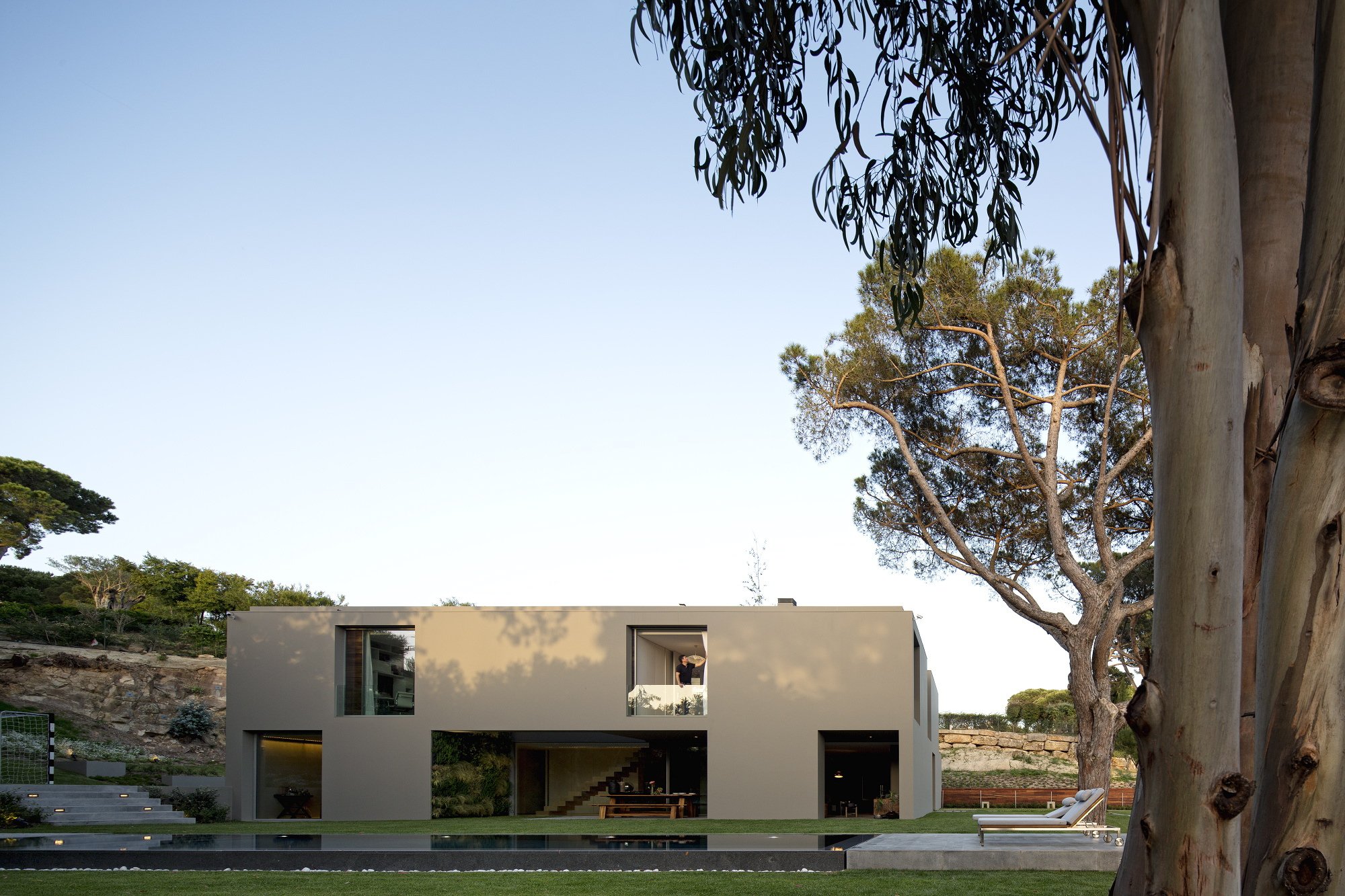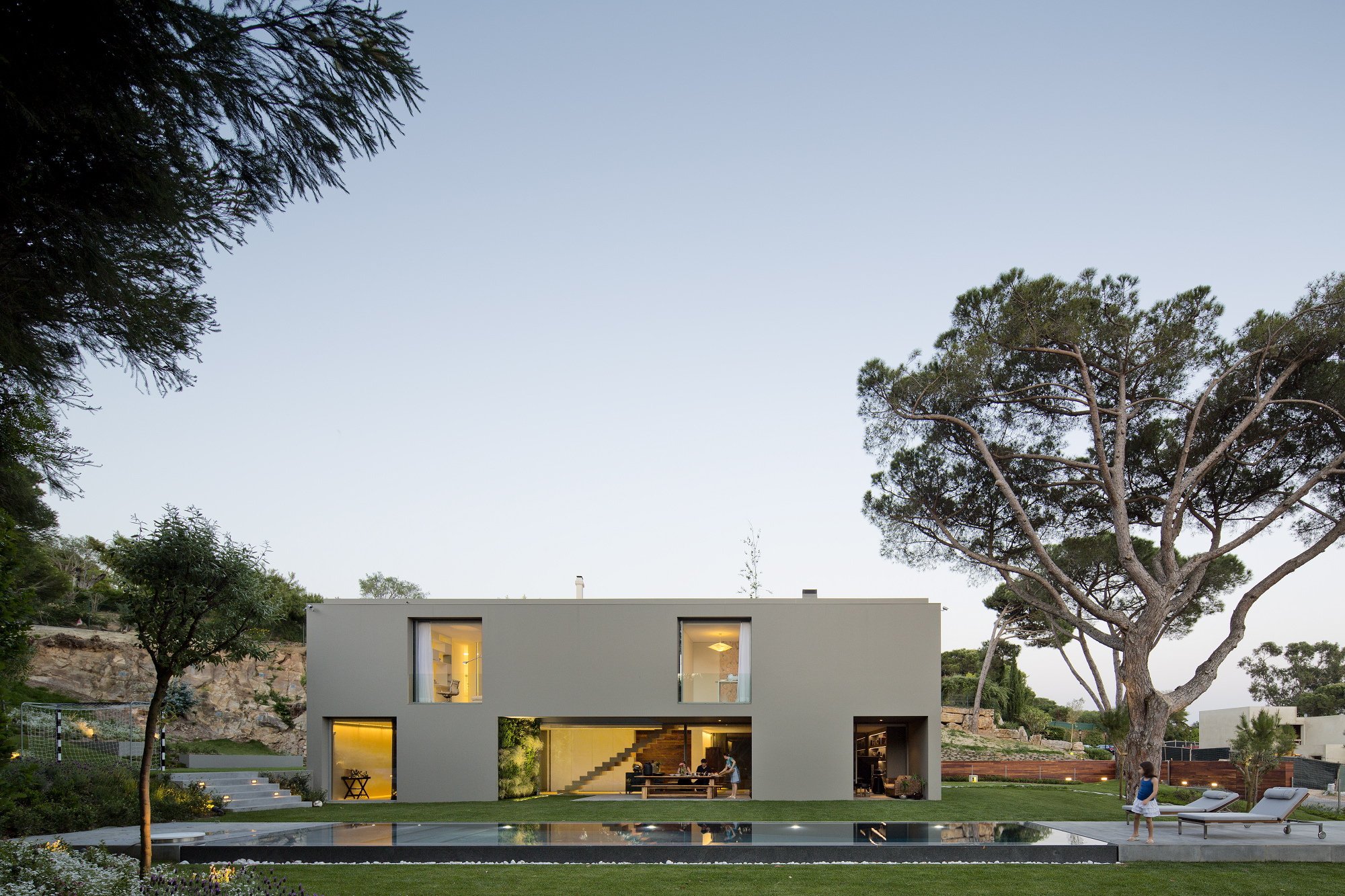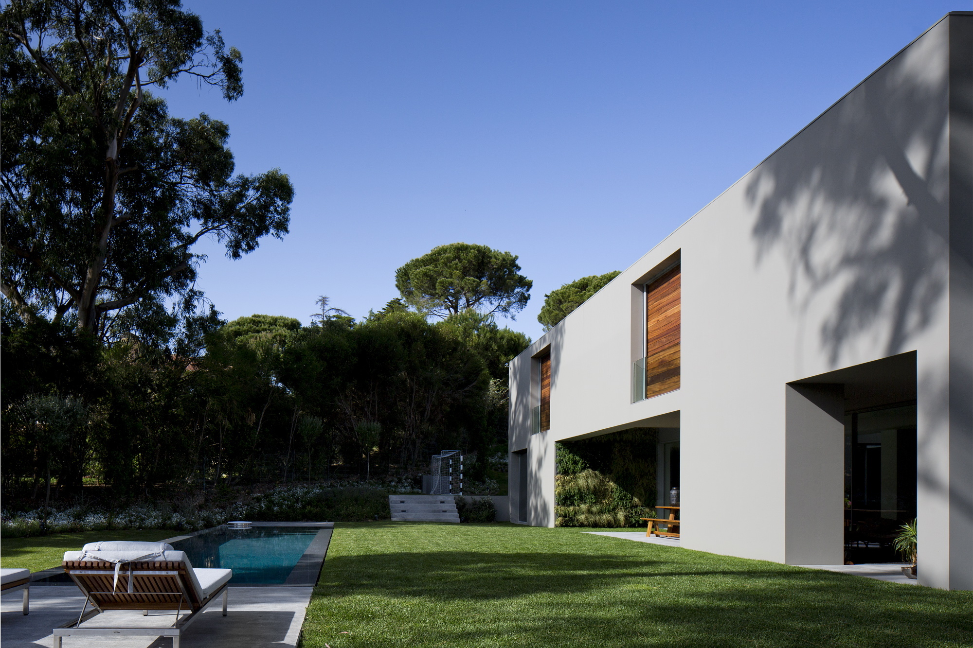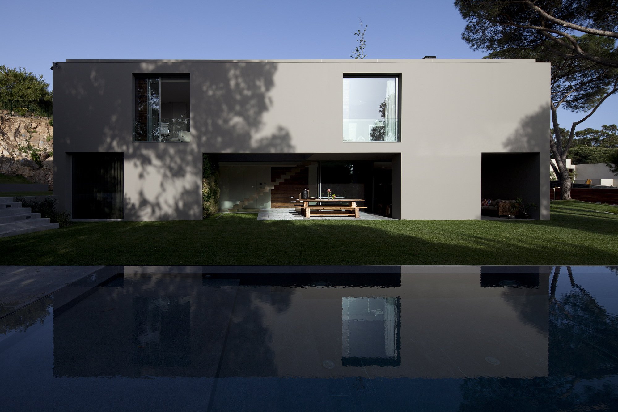 The 7,534-square foot residence that we’re about to describe is located in Quinta Patino, Estoril, Portugal and was designed by Frederico Valsassina Arquitectos in 2012. It boasts a clean, minimalistic exterior design as well as two floors above ground and a basement level. The basement features enough space for five cars and also comprises technical support areas. The parking spaces can be accessed via a ramp that is inserted parallel to the pedestrian entryway.