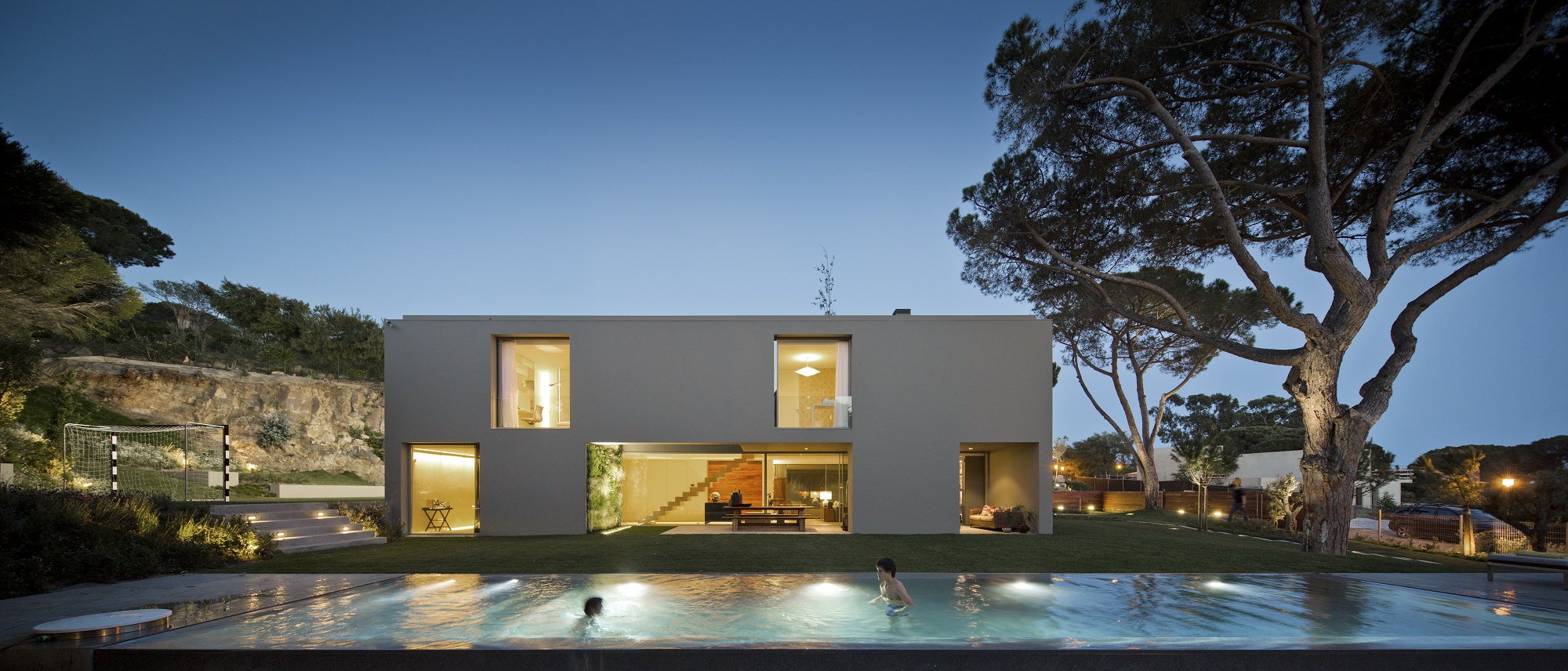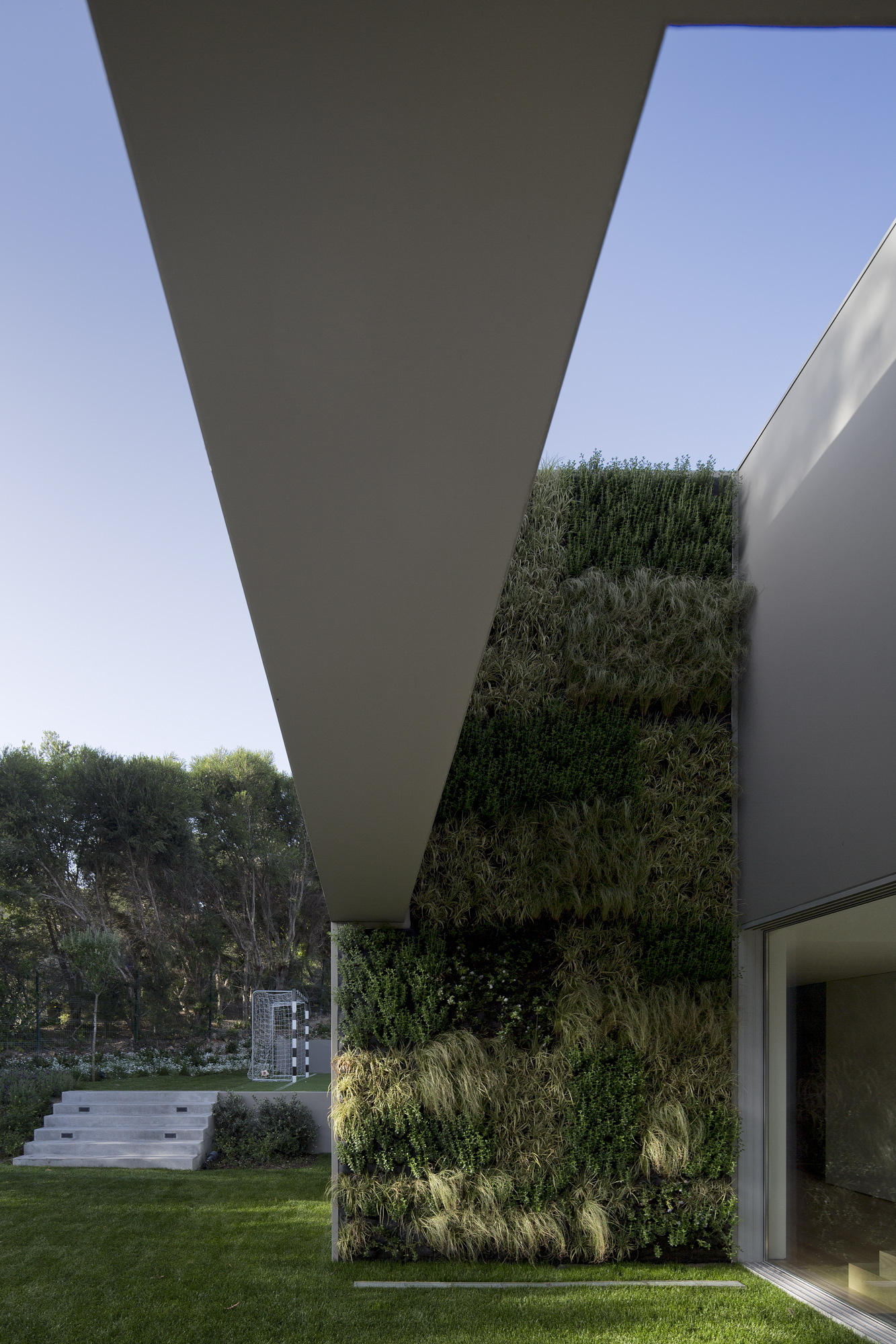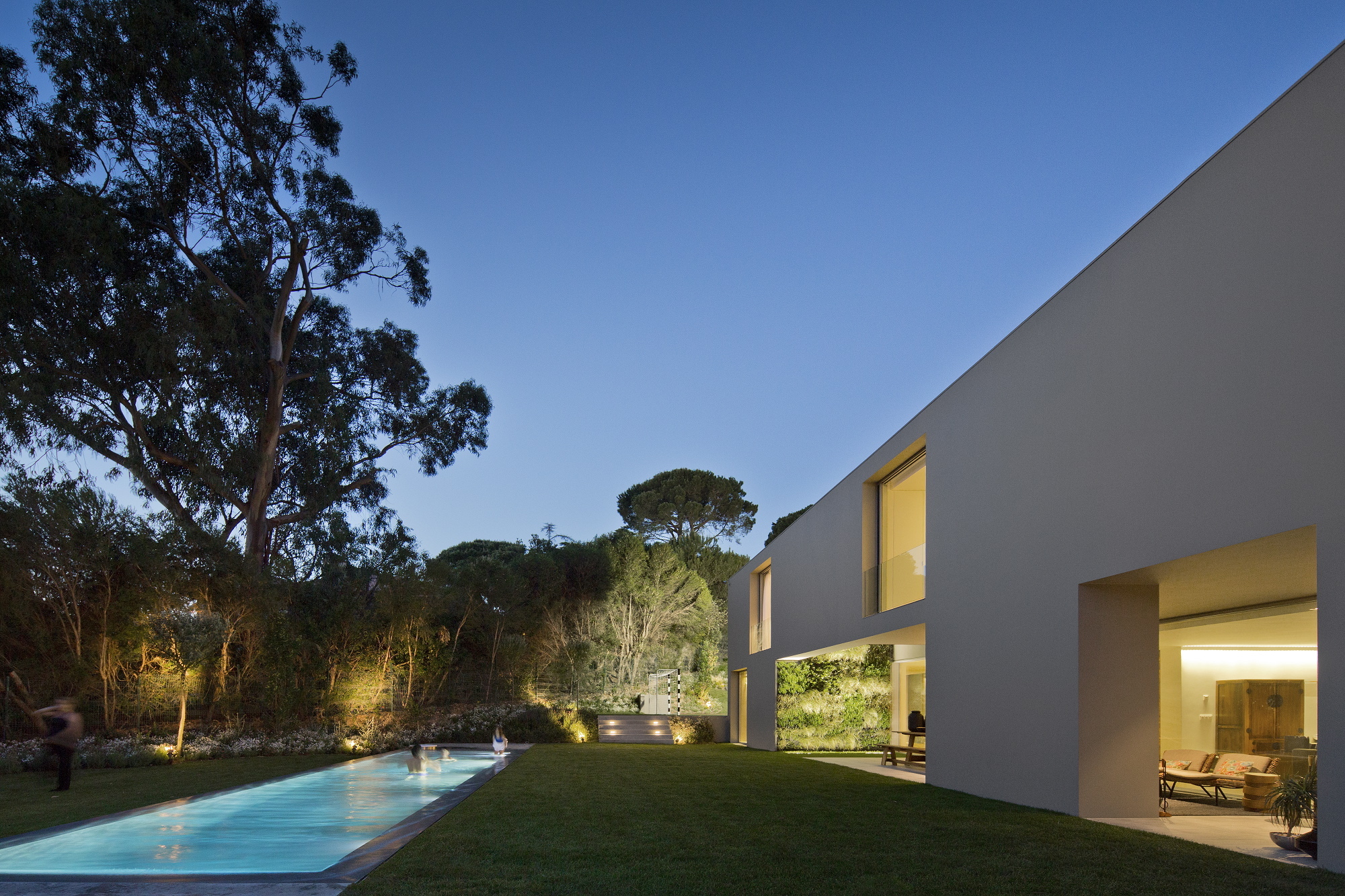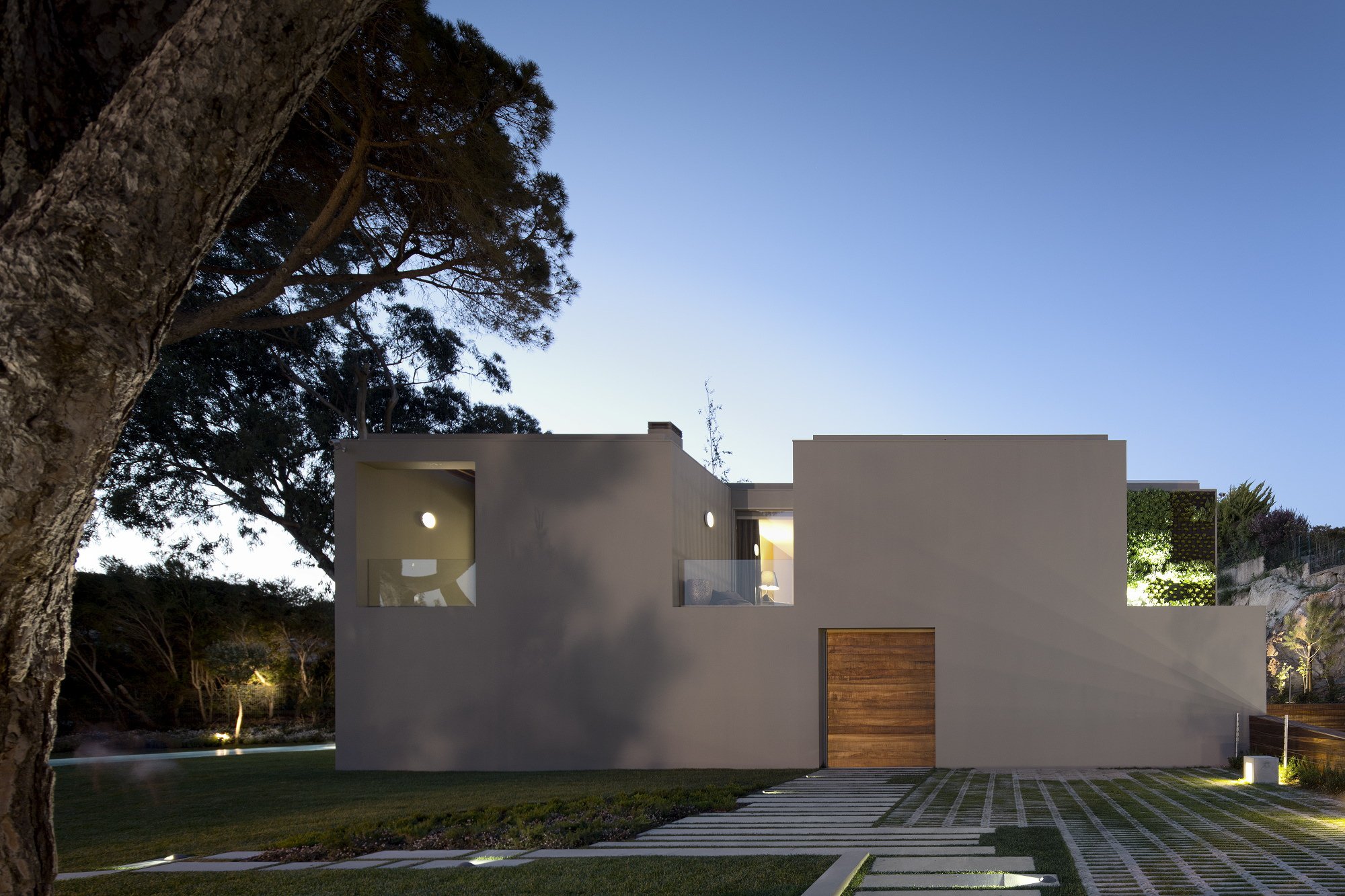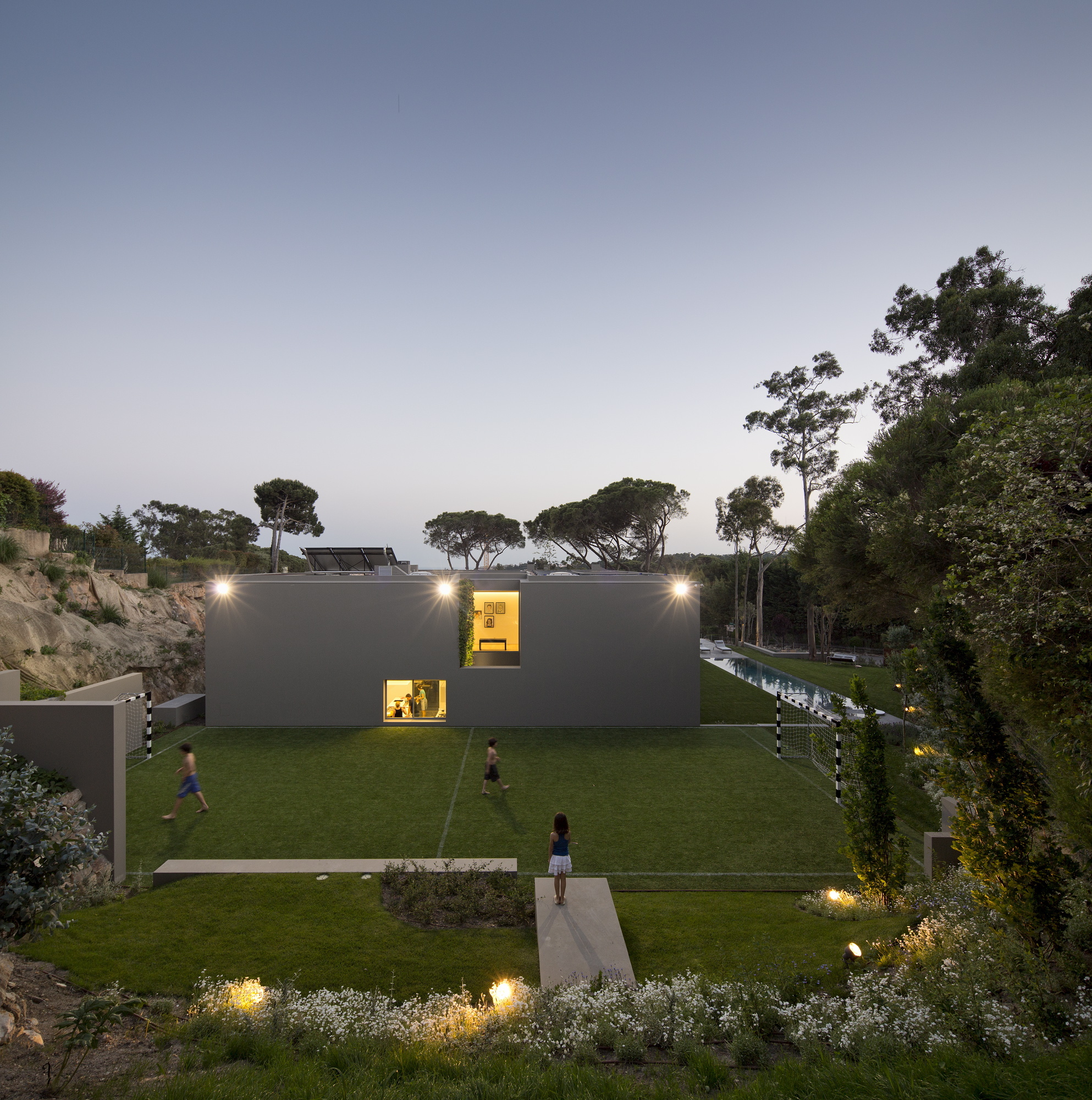 The 7,534-square foot residence that we’re about to describe is located in Quinta Patino, Estoril, Portugal and was designed by Frederico Valsassina Arquitectos in 2012. It boasts a clean, minimalistic exterior design as well as two floors above ground and a basement level. The basement features enough space for five cars and also comprises technical support areas. The parking spaces can be accessed via a ramp that is inserted parallel to the pedestrian entryway.