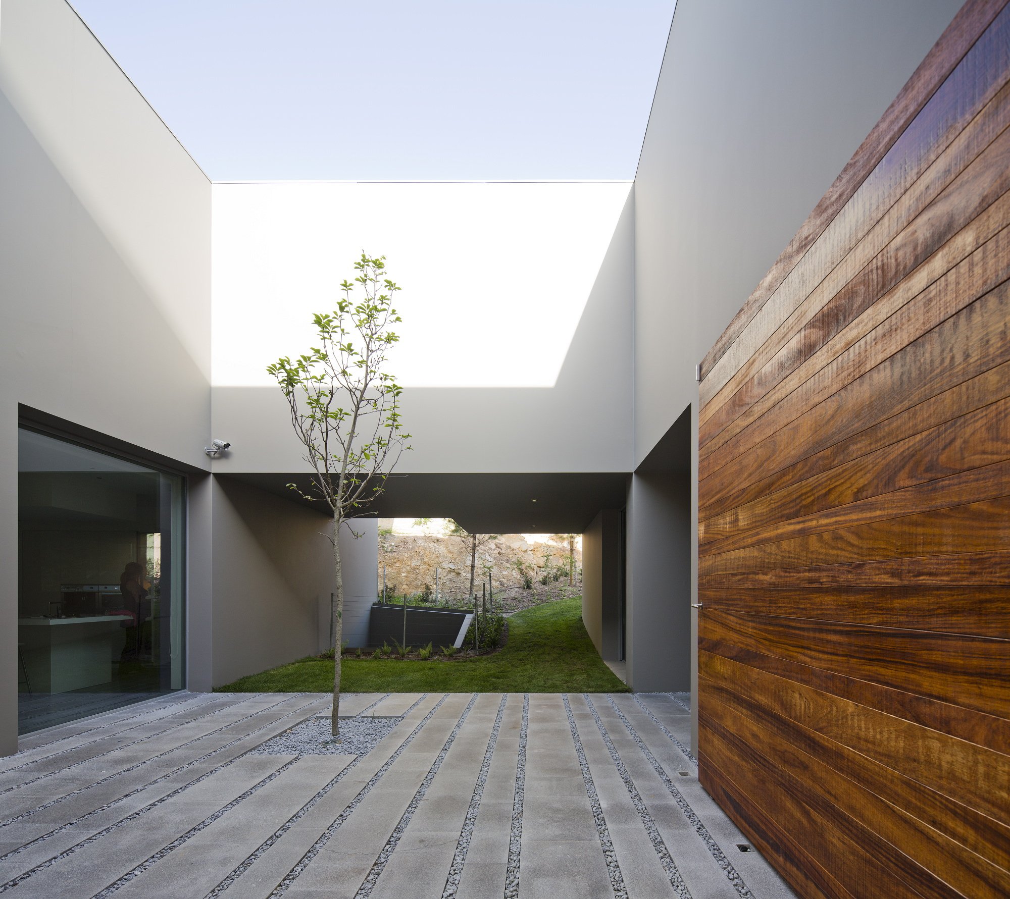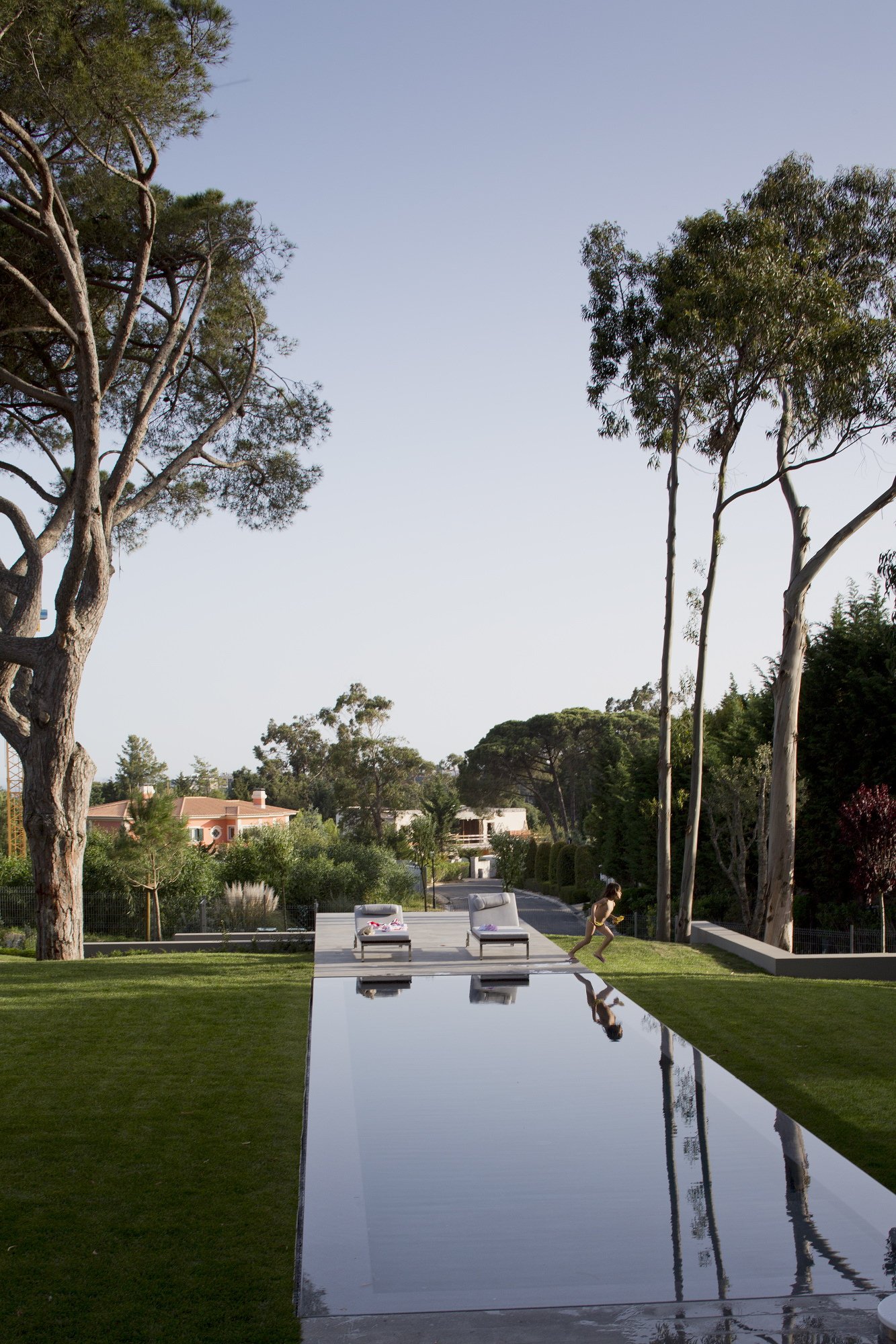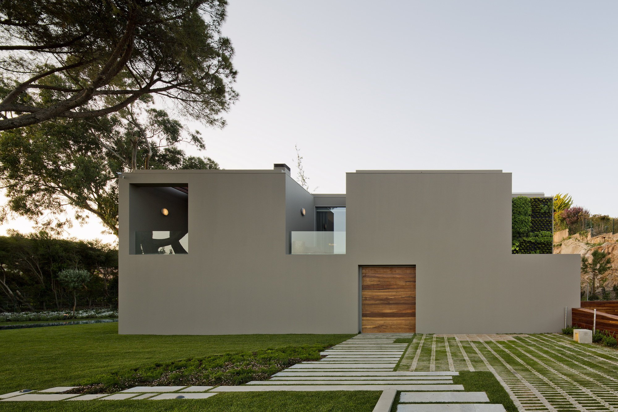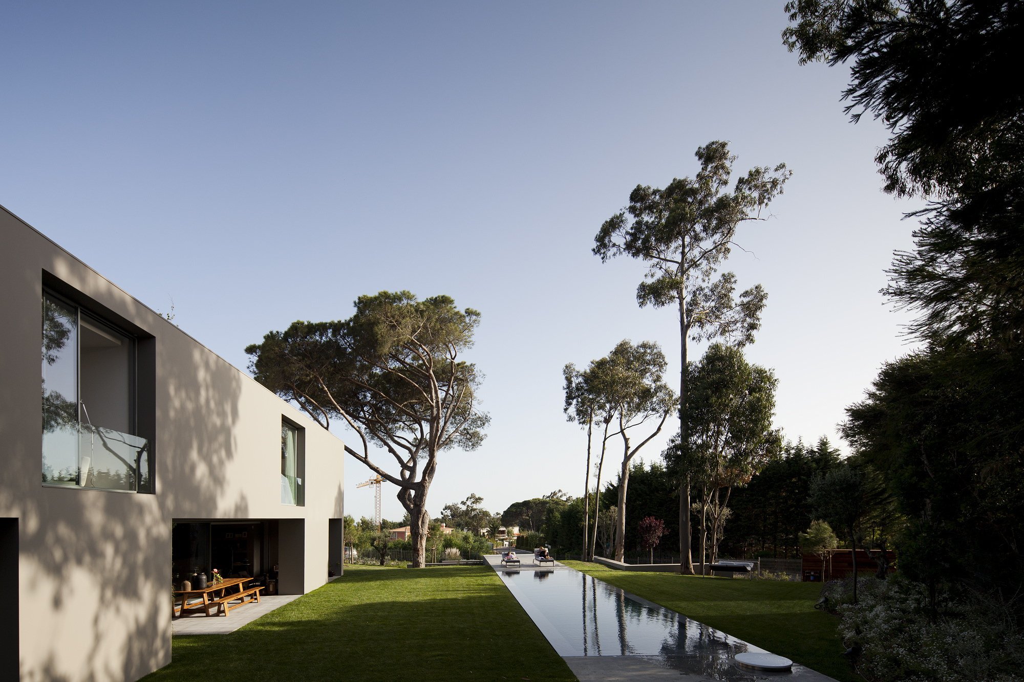 The 7,534-square foot residence that we’re about to describe is located in Quinta Patino, Estoril, Portugal and was designed by Frederico Valsassina Arquitectos in 2012. It boasts a clean, minimalistic exterior design as well as two floors above ground and a basement level. The basement features enough space for five cars and also comprises technical support areas. The parking spaces can be accessed via a ramp that is inserted parallel to the pedestrian entryway.