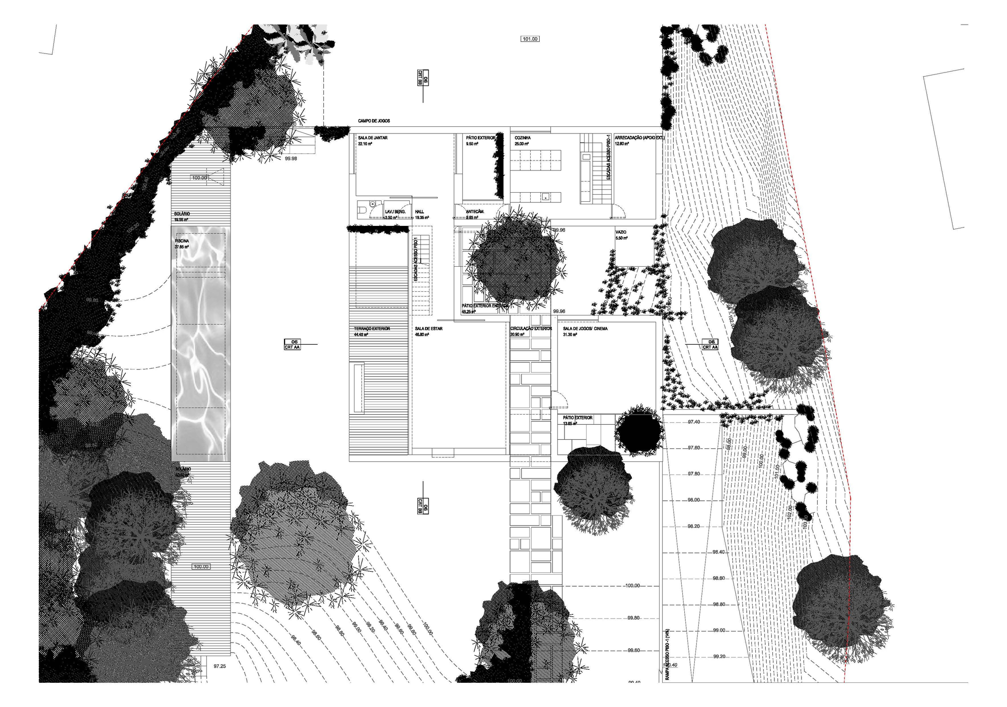 The level 0 combines the social areas of the house. The entrance is from the courtyard exterior finish, opening up a hall to host fully exposed to another outdoor patio overlooking the pool. The hall distributes to the living room, toilet and dining room, allowing access to the upper floor via a flight of stairs. Service areas are developed behind another outdoor patio with a dining room which communicates directly (kitchen and access to the basement). Also on this floor, resulting in autonomous volume of pedestrian crossing, located in room movies and games, more open on a patio.