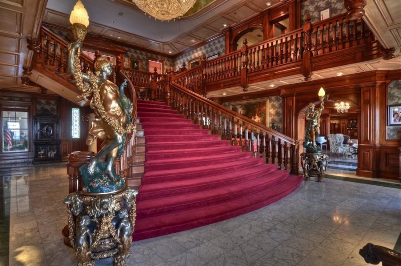 As you step the threshold of the house, you instantly notice the dramatic double staircase that includes imported chandeliers and hand-painted murals.