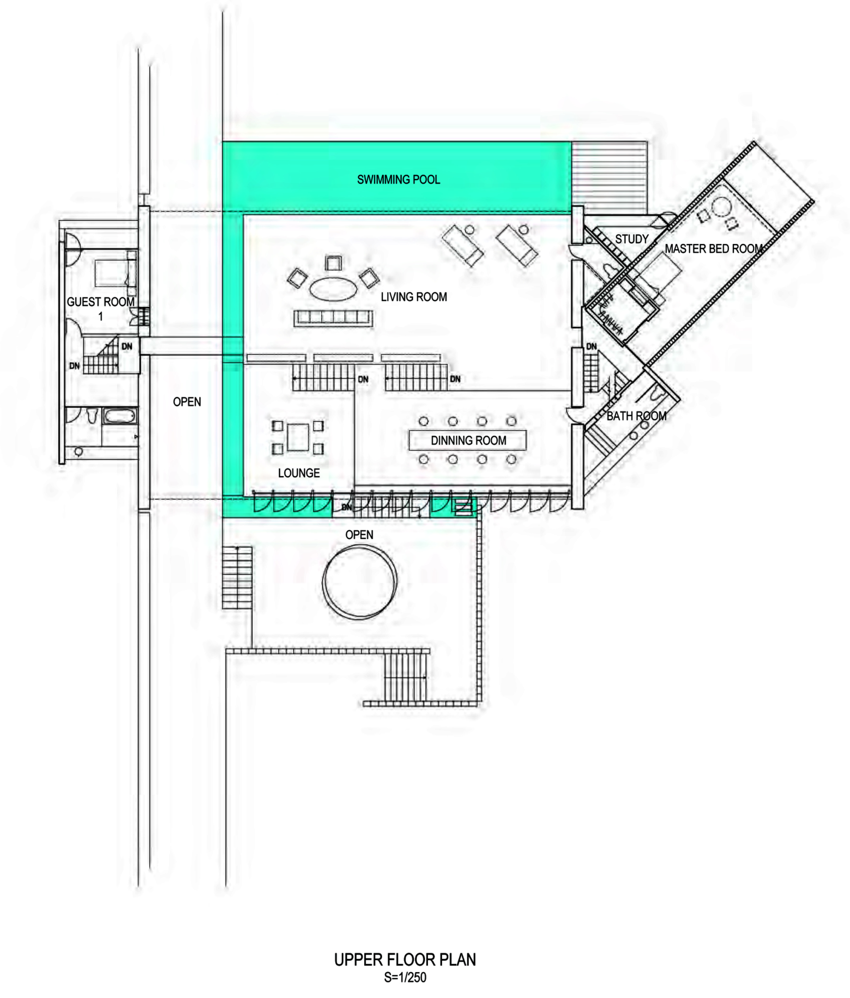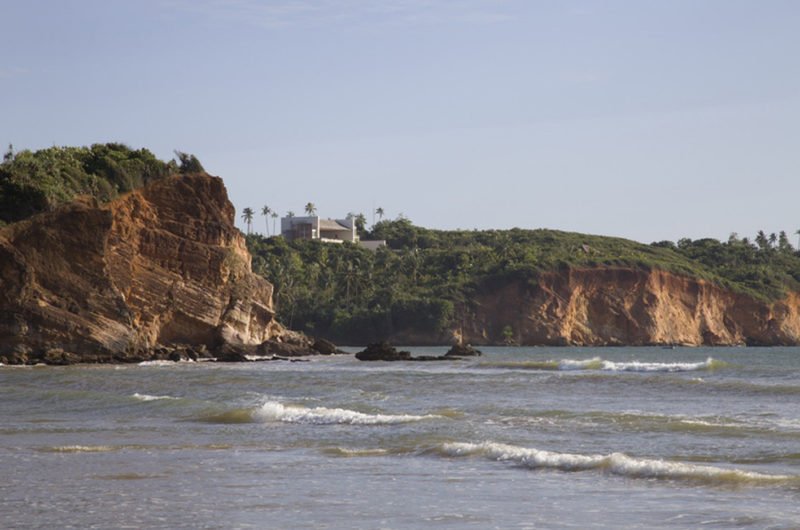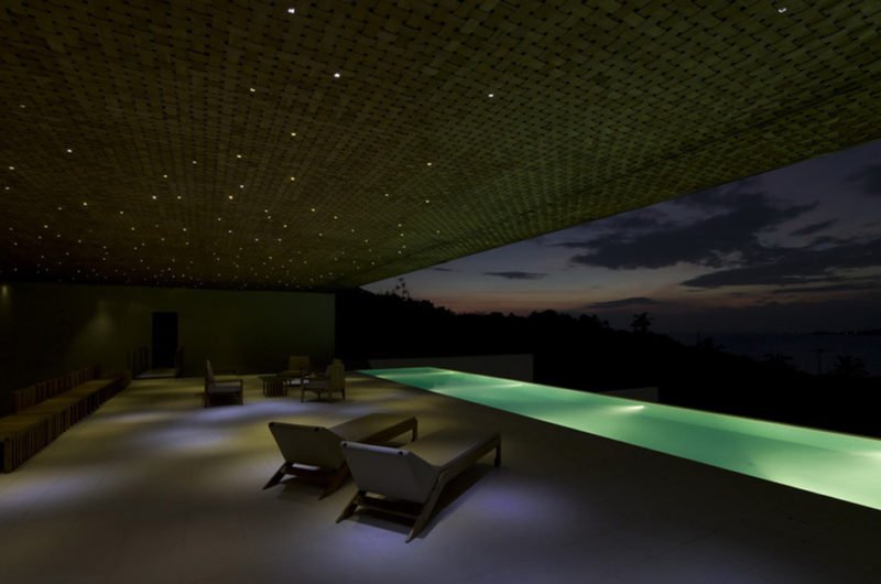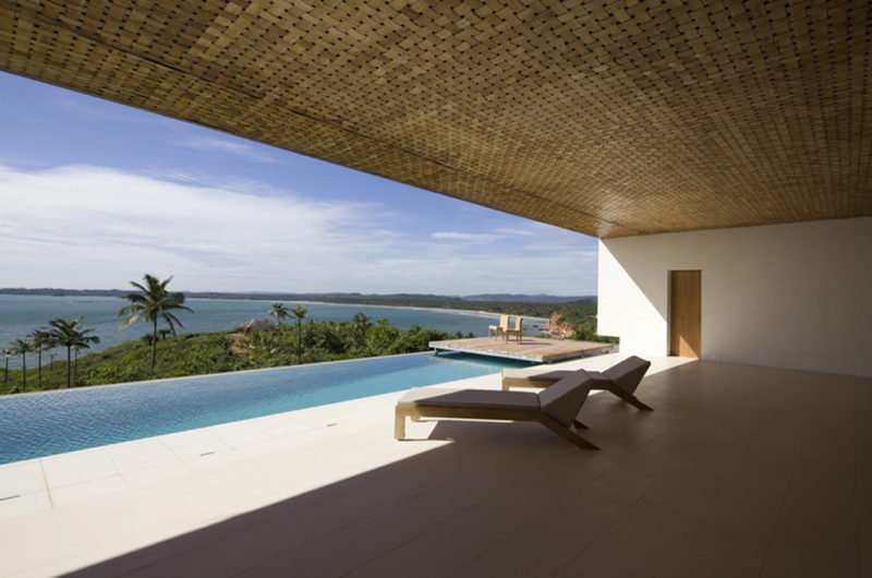 The first is the view of the ocean seen from the jungle in the valley, provided by the external corridor. The second one is the horizontal scenery of the ocean from the hilltop framed by the enormous roof, and the third and last one is the view of the cliff that is viewed through a square frame comprised of 4 m solid wood in the main bedroom.