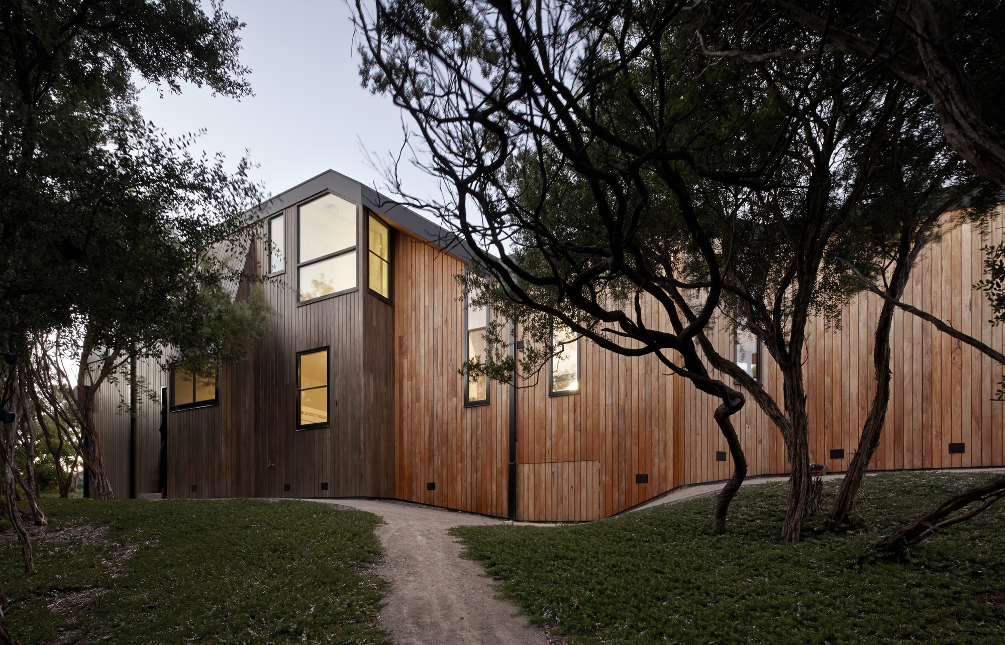 Sleeping areas within the house have been zoned to provide separation between the master bedroom upstairs and the children’s bedrooms below, which step down from the primary living areas towards the low lying, Southern side of the site. The spatial organization in plan and section anticipates changes in family dynamic as the children grow up, and provides a range of views to the surrounding landscape, frommore intimate direct aspects to the surrounding tree trunks and undergrowthat ground level, to more sweeping vistas across the treetops from the master bedroom above. Varying qualities of light and shade were carefully considered in the curation of window openings to enhance varying degrees of privacy and engagement with the surrounds.