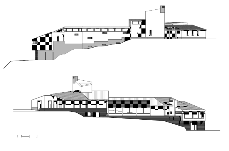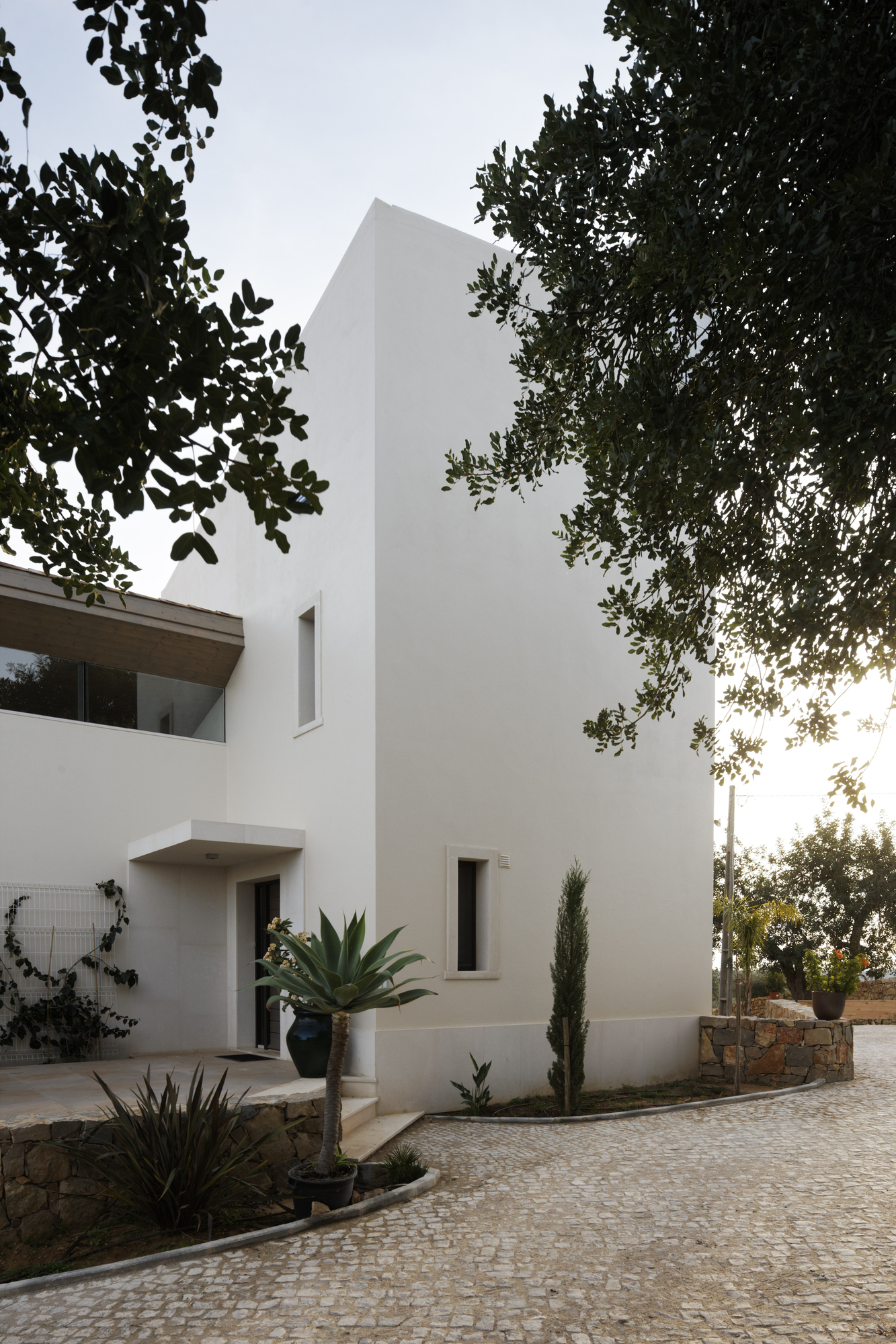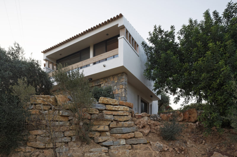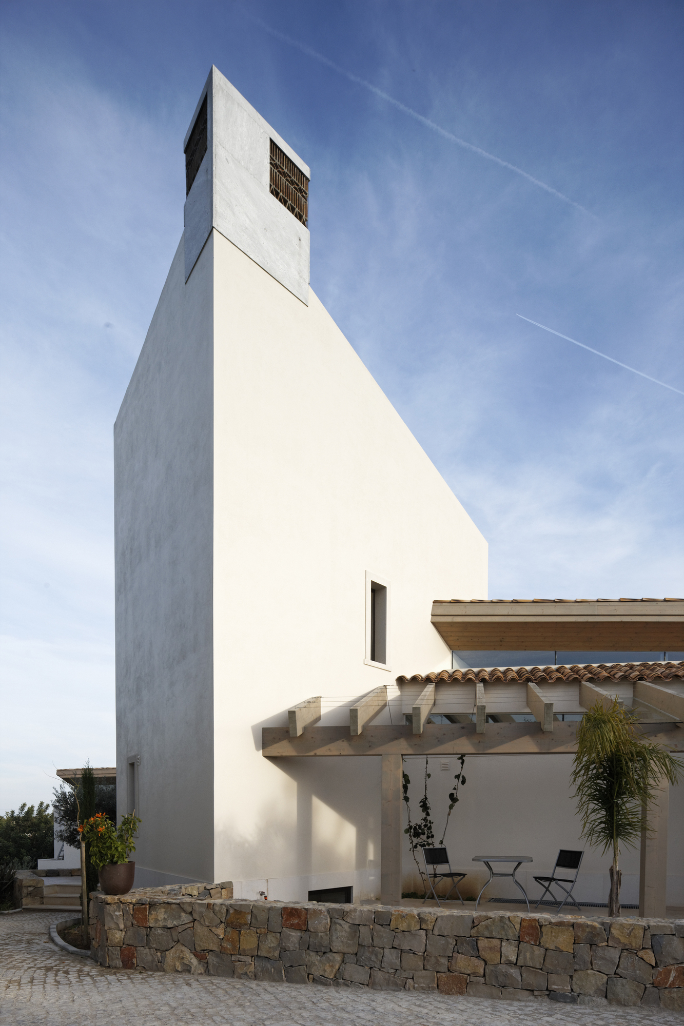 The protection from the cold winter winds and the privacy are provided by the white stucco wall. Behind this wall, the construction opens towards the sun and the landscape.