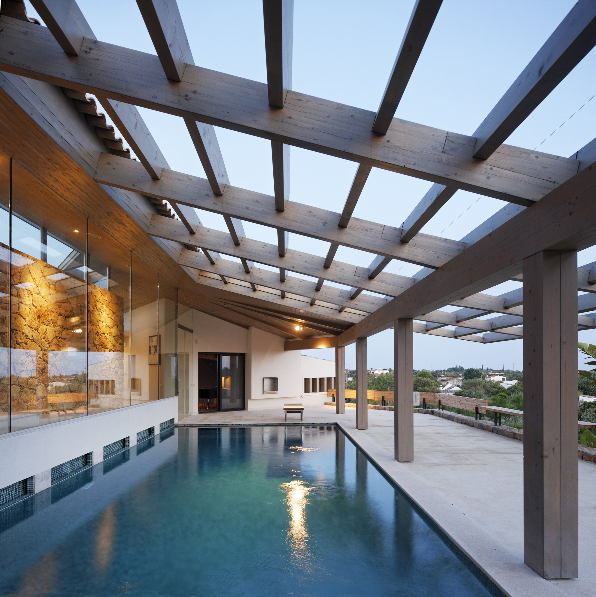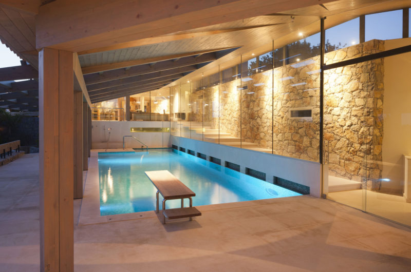 The central point in the building that connects different functions and spaces is the swimming pool with its open roof structure.