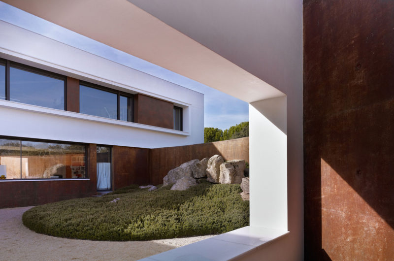 To achieve the desired privacy a circular wall that surrounds the rear of the house has been designed , it creates a series of private patios protected from the public outdoor space, blurring and expanding the actual limits of the plot.