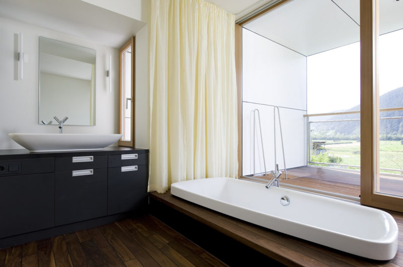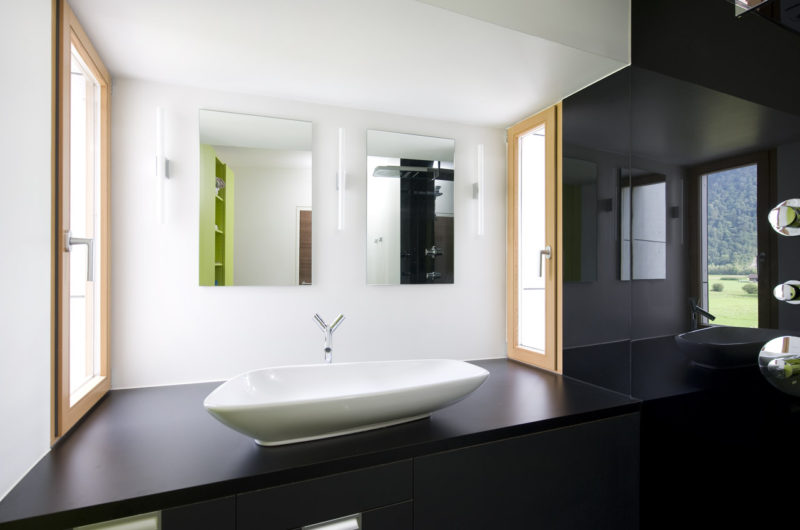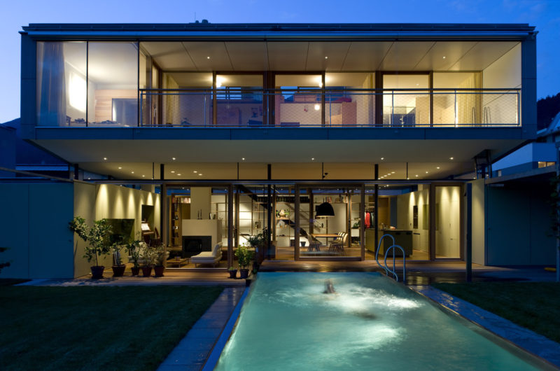 The owners bought the land a couple of years before the construction began, probably impressed by the open landscape and the lovely views it offered over the Inn river meadows and the spectacular Tyrol mountain peaks. The residence boasts a spacious living area that opens itself towards the green garden and the outside swimming pool. Two “boxes” are placed on each side of this area, holding garages and other auxiliary rooms.