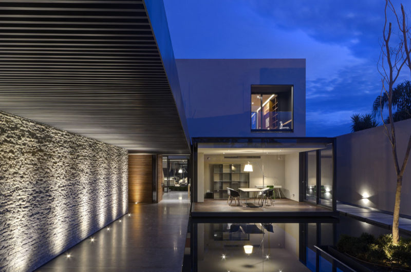Modernism, simplicity and comfort are the main traits that define the LA House – a contemporary residence that was built in 2014 by Elías Rizo Arquitectos. The house can be found in Mexico and offers 10,042 square feet of living space. It flaunts a glazed box that appears to float above a tranquil pond, which can be crossed thanks to a series of stone pavers that lead the way straight into the primary public areas.