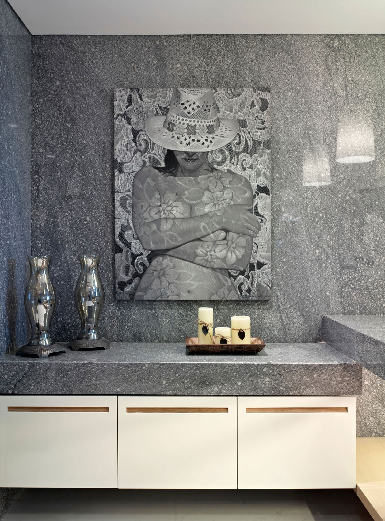 Probably the best views can be admired from the living/dining/kitchen area, which seamlessly continues towards the pool terrace. This, however, is not the only space where huge windows welcome natural light inside. Extensive glazing is present throughout the residence, but thanks to the architects, who chose high performance glass, the greenhouse effect is not a problem.