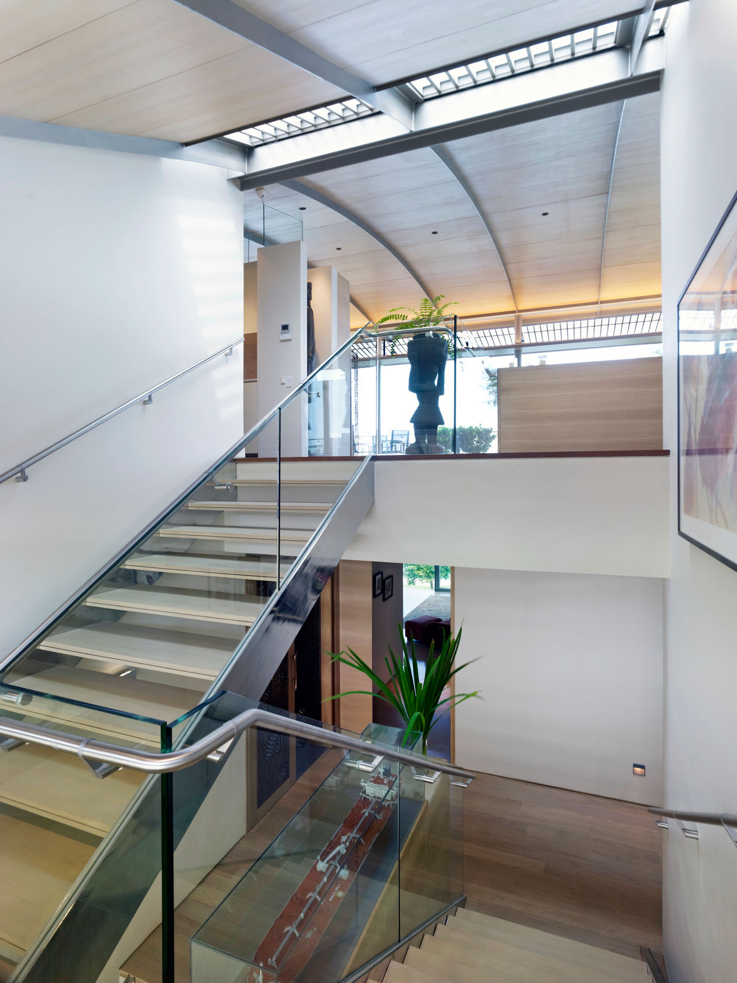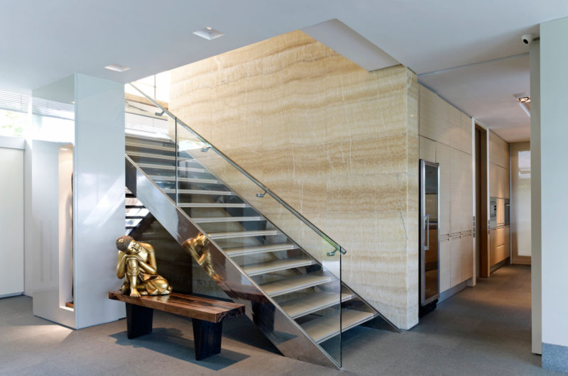 While the house is effectively protected form prying eyes in several key private areas, it is also beautifully open towards the surroundings in the social and entertaining spaces. The inviting living, dining, pool and garden area is permanently hidden from direct sunlight, as the house itself cantilevers over this area.