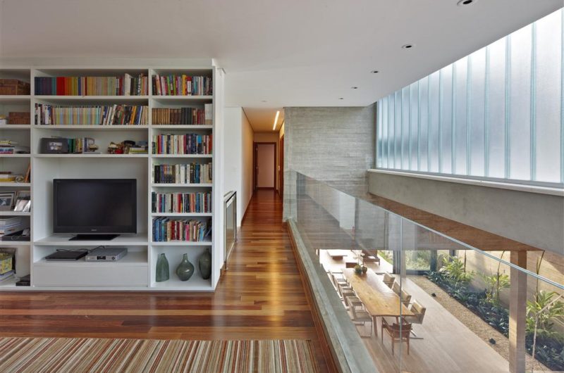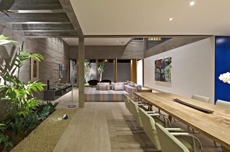 The floor plan is rectangular and compact, stretching till the site’s sidelines. The rooms are illuminated by large doors front and back facades and also by matted glass locking (u-glass that acts as a good thermal insulation due to the existence of an air layer between the glass sheets) between the lagged cover labs. A glass cover over a concrete pergola complements the illumination through an indoor garden. Therefore, the house is flooded by zenithal and indirect natural light that besides avoiding artificial lighting during the day, also avoids excessive heat from direct sunlight. The prevailing wind comes from the street, thus the entering doors work as regulators of wind speed. Totally opened in the summer, praise cross ventilation, or closed in the winter, or even semi opened if little ventilation is desired.
