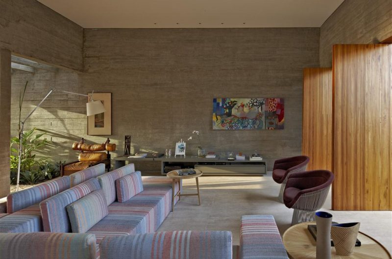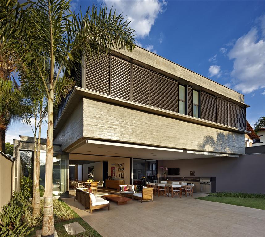 Solar collectors (that meet the house and the pool) occupy the most of the cover slab which prevented the use of this area initially contemplated. Due to the large spans desired, supported by few points of foundation, and also to the large porch swing, the upper walls are concrete beams built by ripped forms of wood left apparent. Its aesthetics comes from a structural option, hence follows that it is not decorative. This structural gymnastics was important, as the support pillars on the porch would be contrary to the intention of integration between interior/exterior desired. The result was a lightweighted residence (despite its aesthetics of exposed concrete), lighted and ventiladed, with pleasant and proportional spaces that puts into to practice the initial desire to the best possible use of external area.
