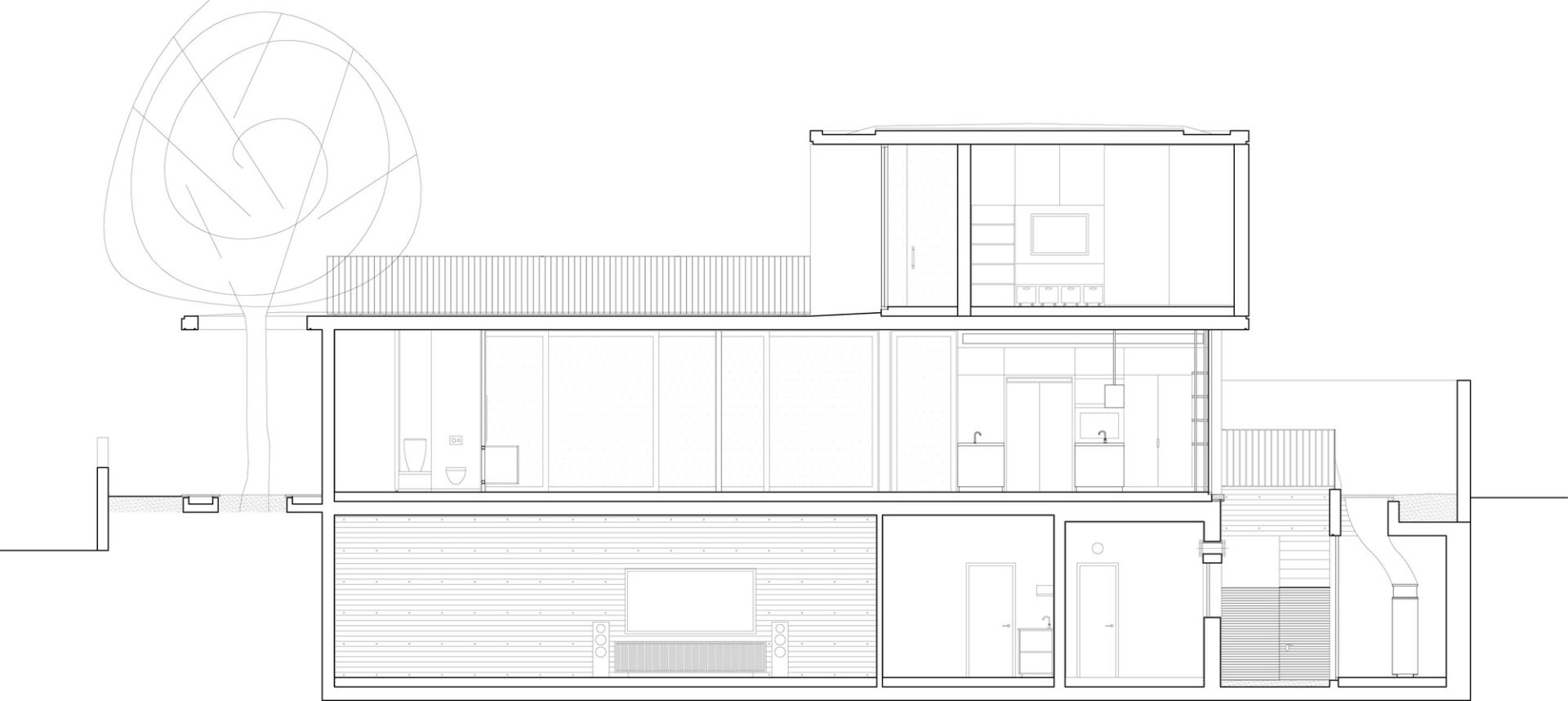 It explores the values of the 50’s American case study houses. It is designed in such a way that all main public spaces (living room, kitchen, movement zone) can be open and function as external covered areas, thus blurring the distinction between in and out. It makes the living experience richer and more free.