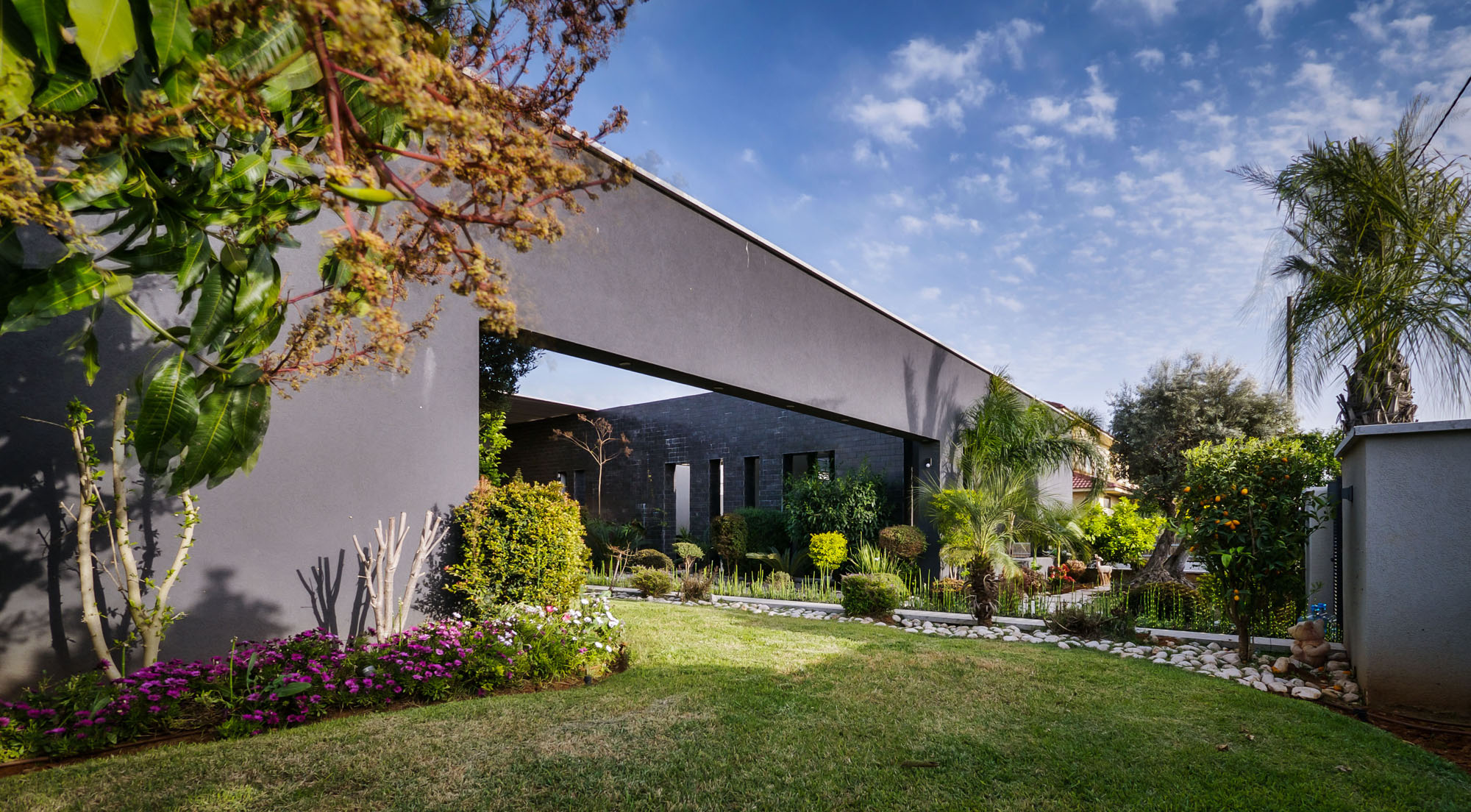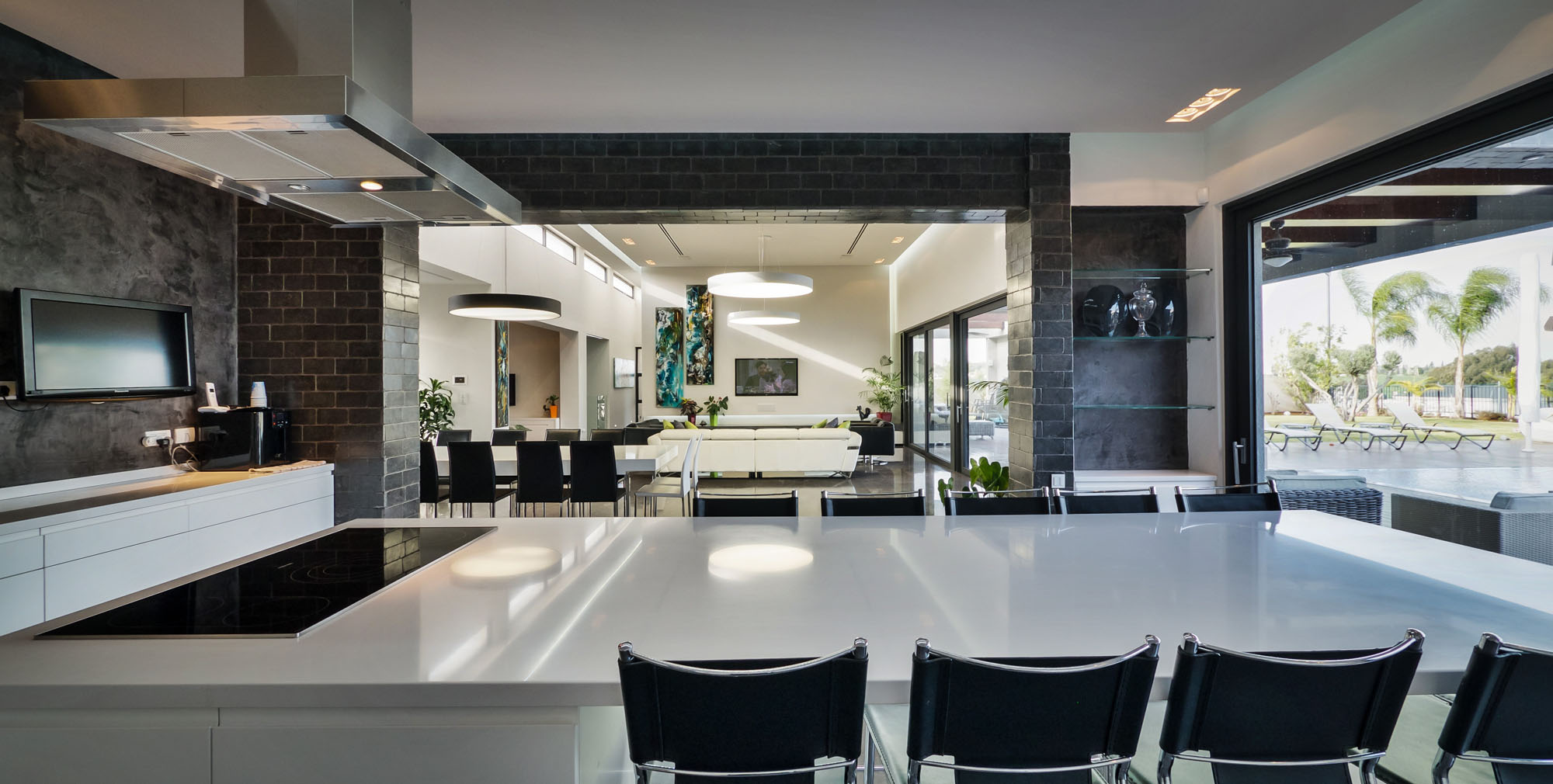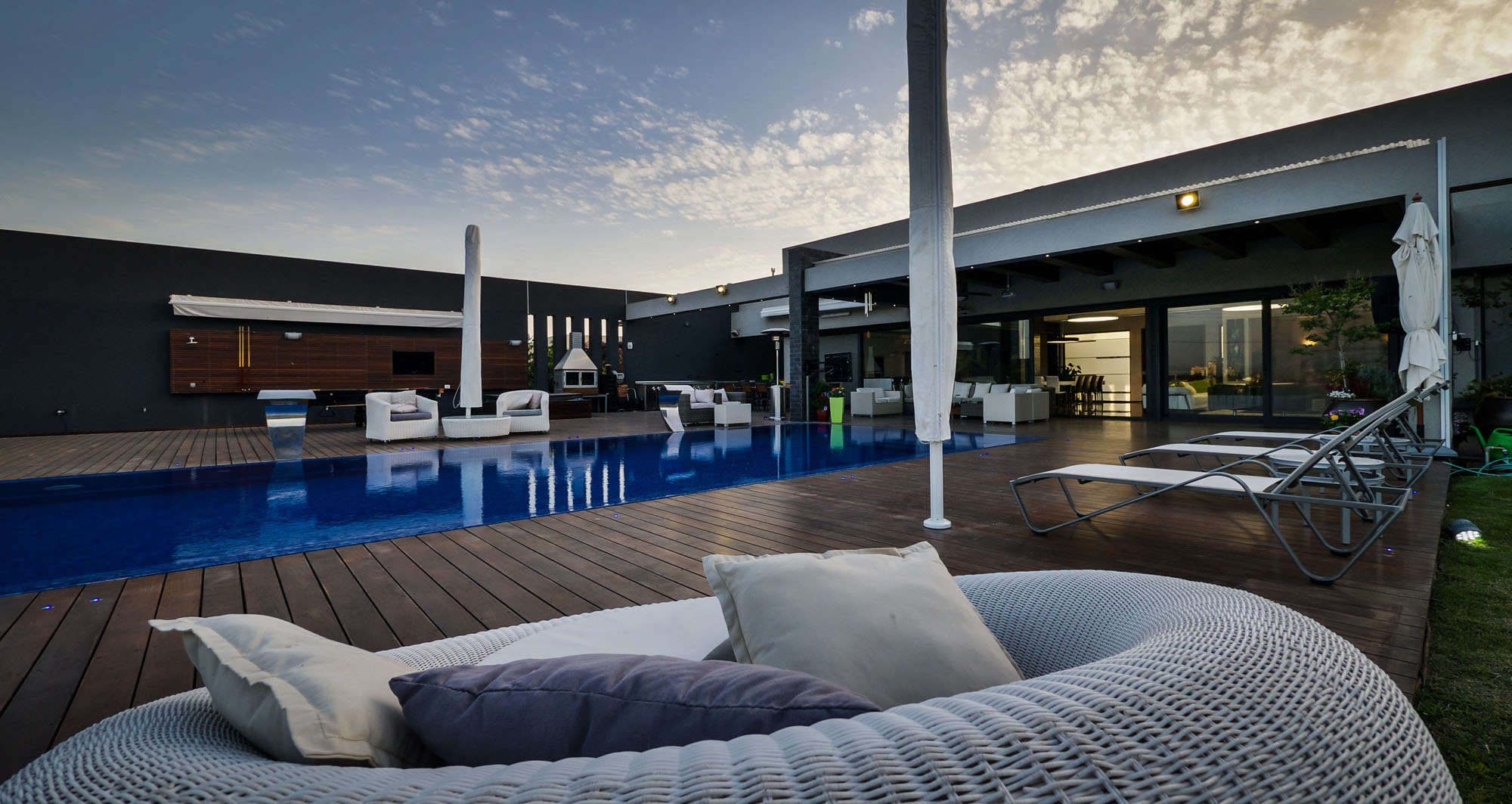 The residence is as modern as they come. It features high quality furnishings, finishes and natural plants that contribute to an ambiance of warmth and coziness. The living room distinguishes itself from the rest of the rooms through its transparency. It boasts large windows and glass doors that ensure uninterrupted views of the rear courtyard while also providing easy access to it. The patio can be used for relaxation and entertainment, as it includes a large swimming pool, lounging areas, barbecuing equipment and a pool table.