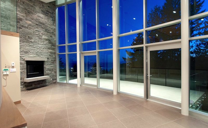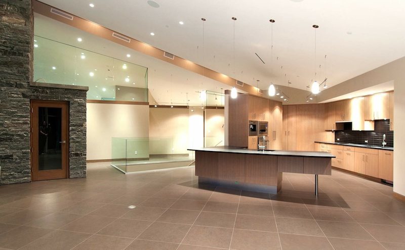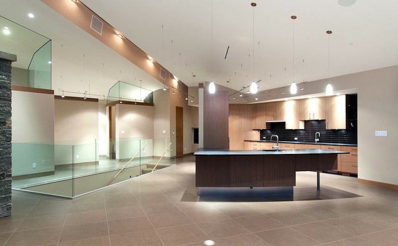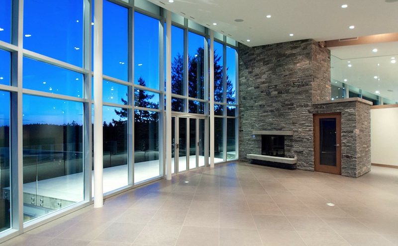 The main floor accommodates the great room which is very elegant and classy due to the double-height granite clad fireplace and custom ceilings, walls of Low-E glazing, the custom gourmet kitchen, the breakfast bar, the master bedroom, the private office and the suspended slab patios.