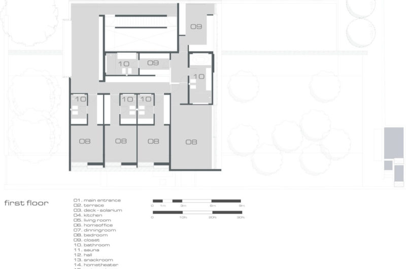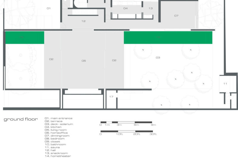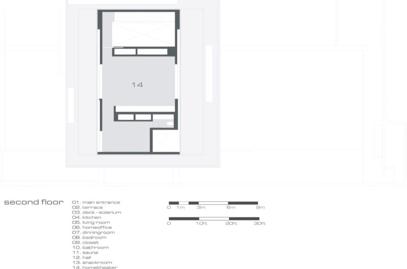 The second floor has thick walls of wood and they hide the bedrooms and bathrooms, private space for the owners. On top of this floor there is a roof terrace limited by glass guard rail.