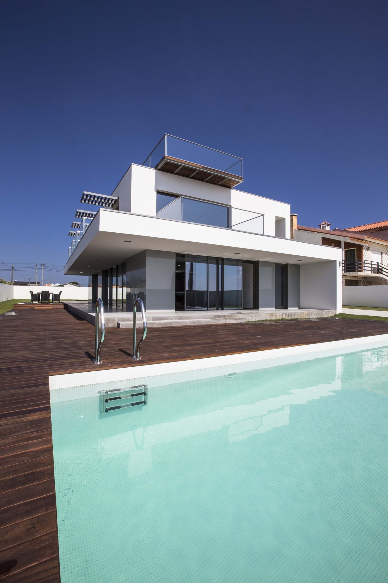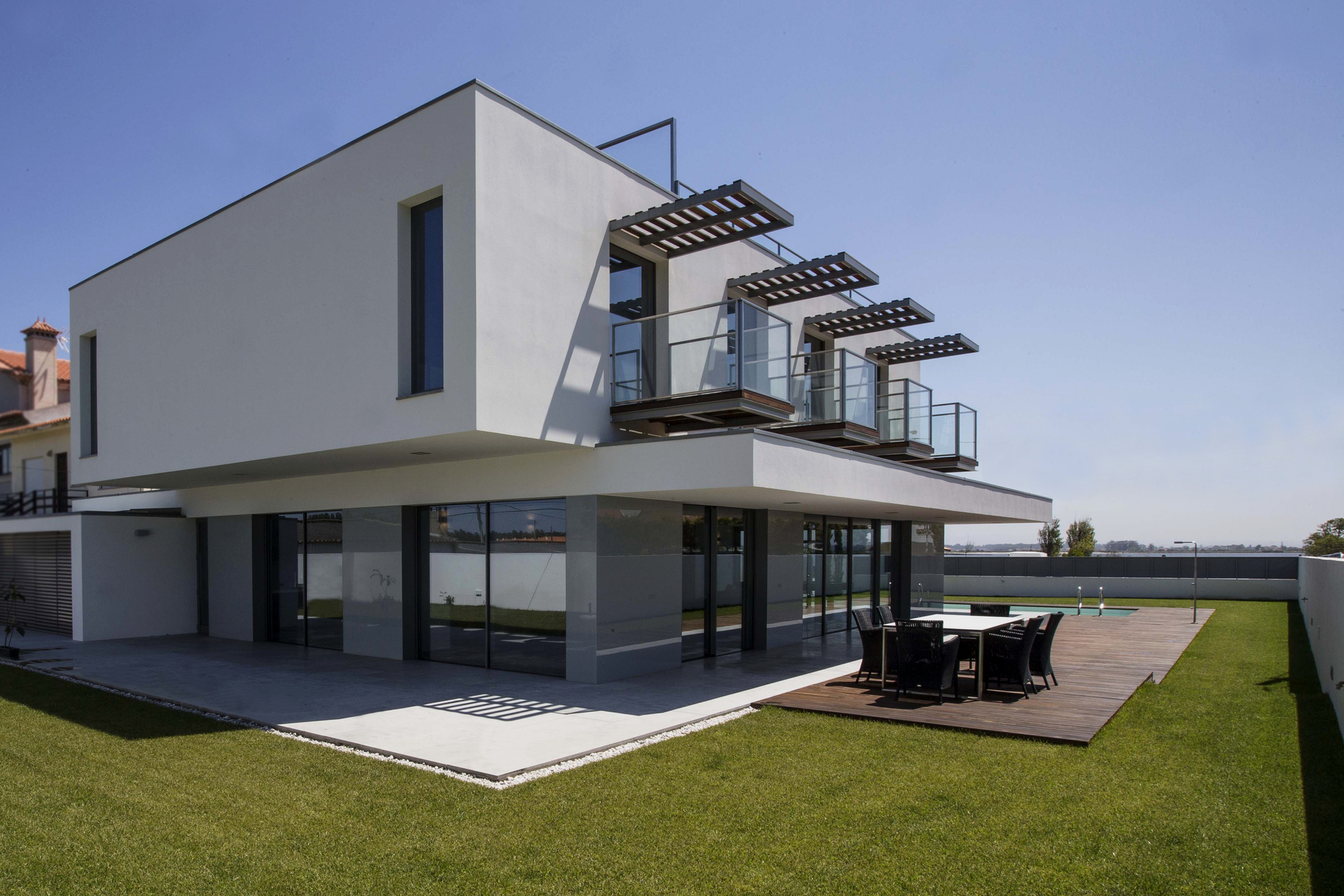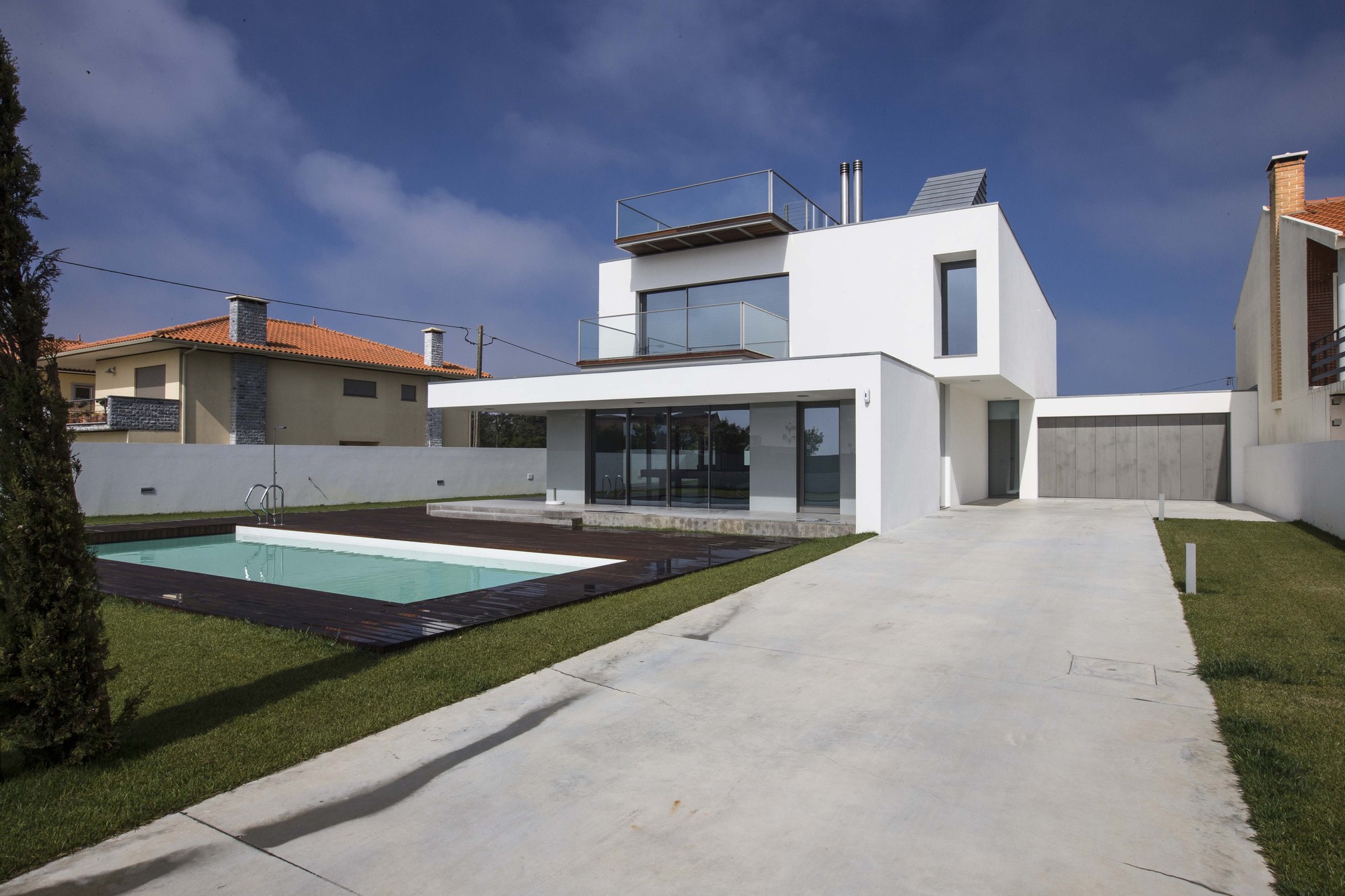 It faces mainly the East and the South, to the Ria and the sun. To the West a courtyard was created to support the kitchen and the laundry.On the ground floor, over viewing the Ria and the pool to the East, and quite open to the South, lies the living room. Next to this, and in direct communication, was located the dining room, which creates a continuous transparency on the outdoor patios from West to East. The kitchen and the laundry are turning to the West courtyard.