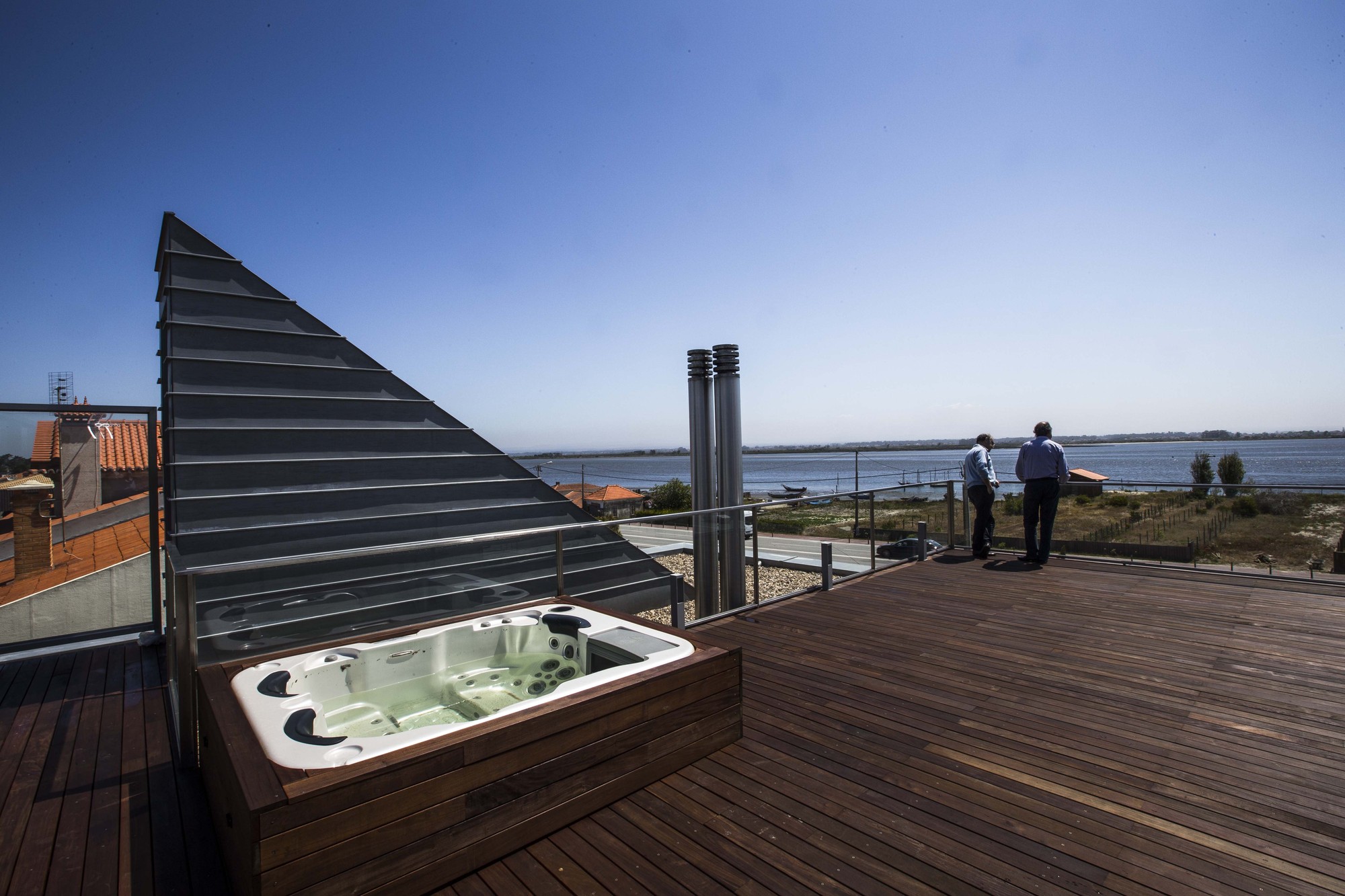 room.It was also created an access to the roof, where you can enjoy the views and a jacuzy placed there. This access is defined by a triangular component along the stairs, forming a sculptural element that seems the sails sailing in the