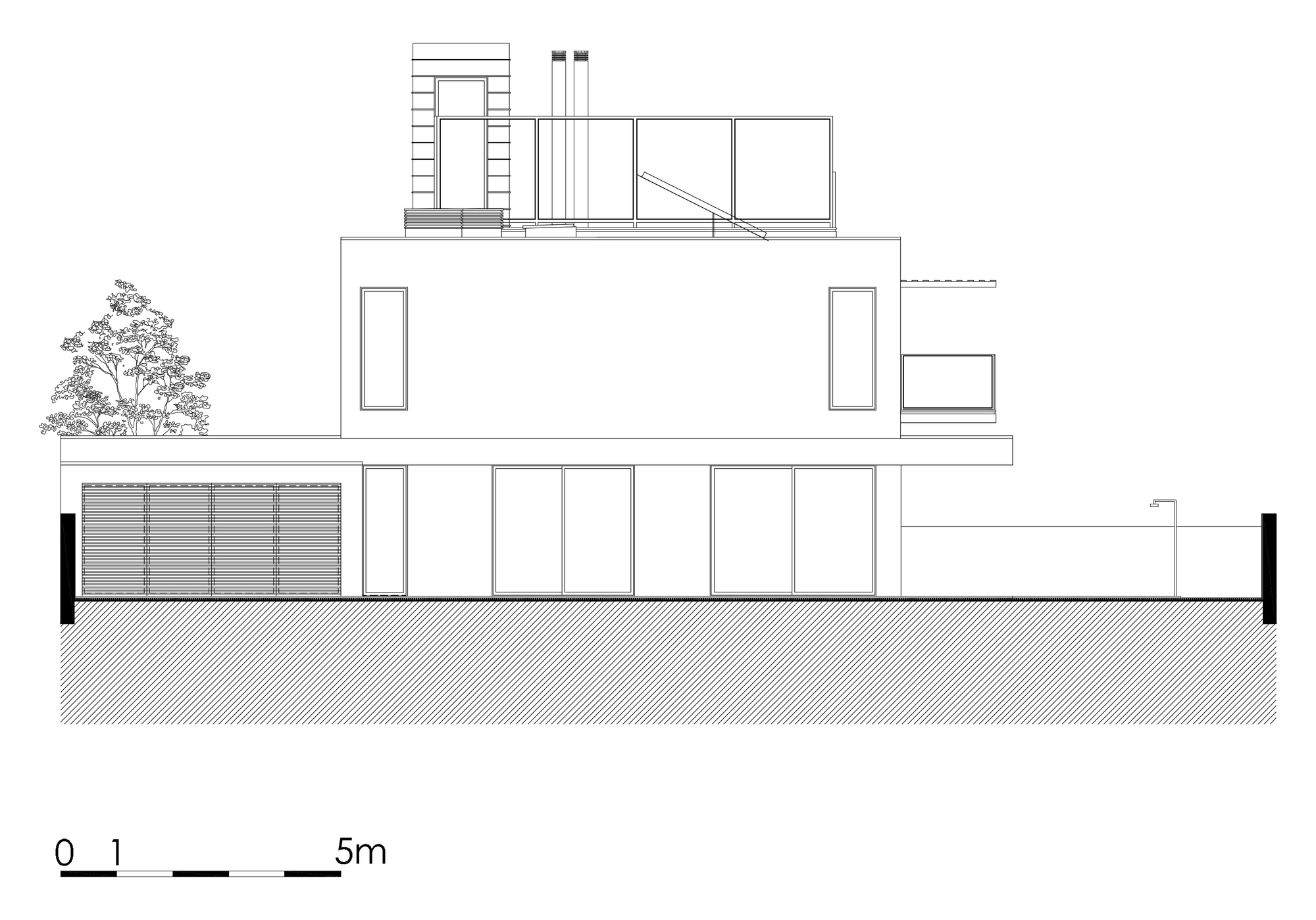 The house emerges with two overlapping structures topped by a triangular element (the stairs leading to the terrace). The lower structure, more transparent and more “fragile”, supports the higher structure, dimmer and containing more rhythmic openings, where small volumes – the balconies – punctuate to the South.