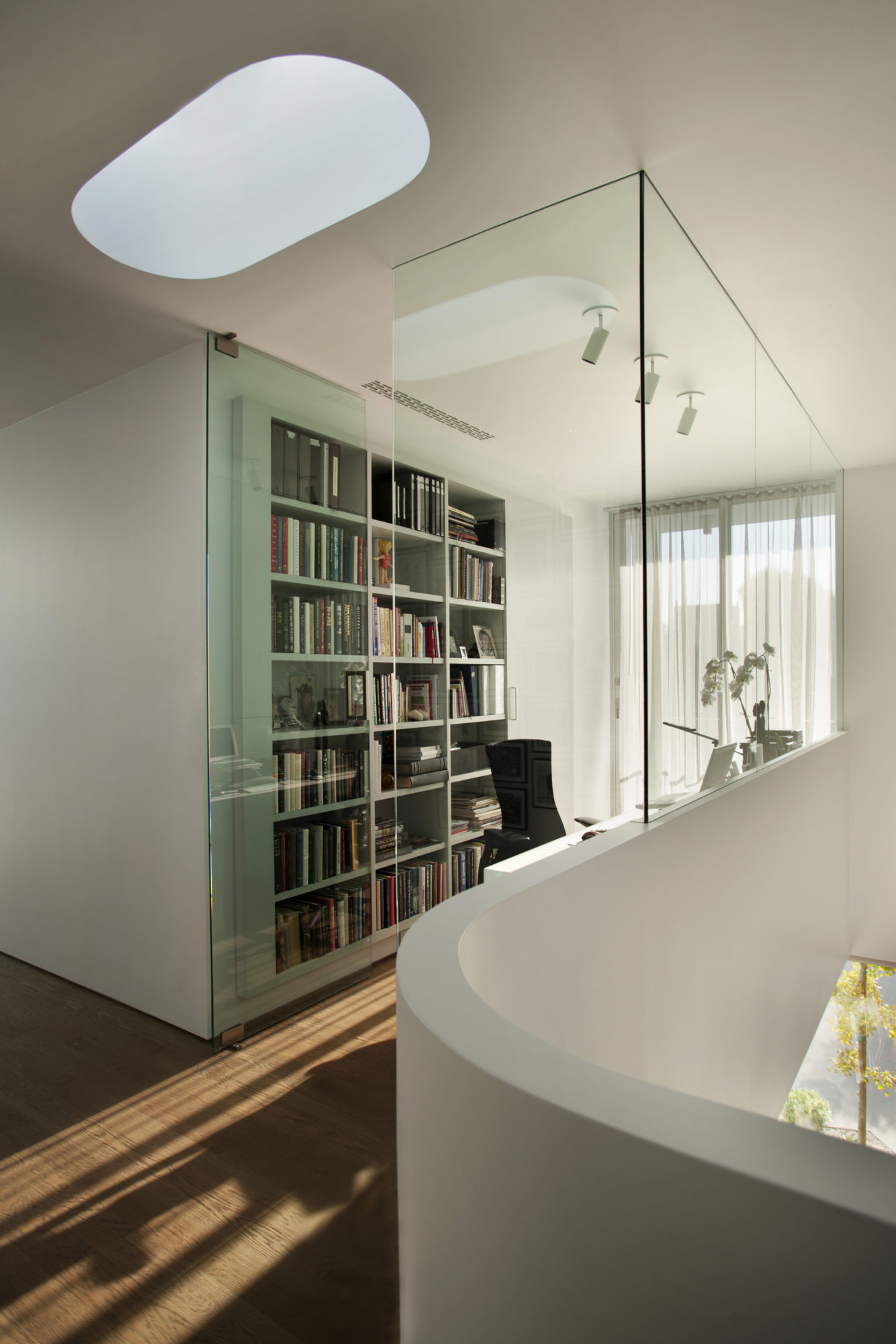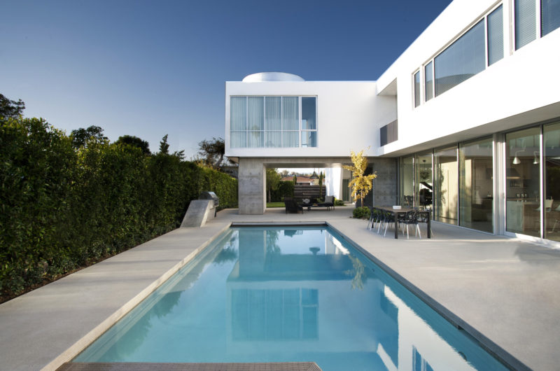 White stucco, glass and metal panel were used for the exterior of the house, and photovoltaic panels installed on the roof provide electricity for the whole residence.