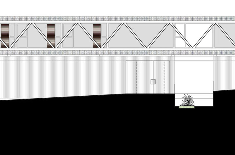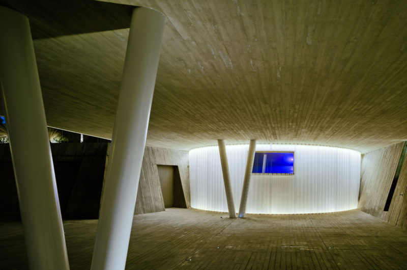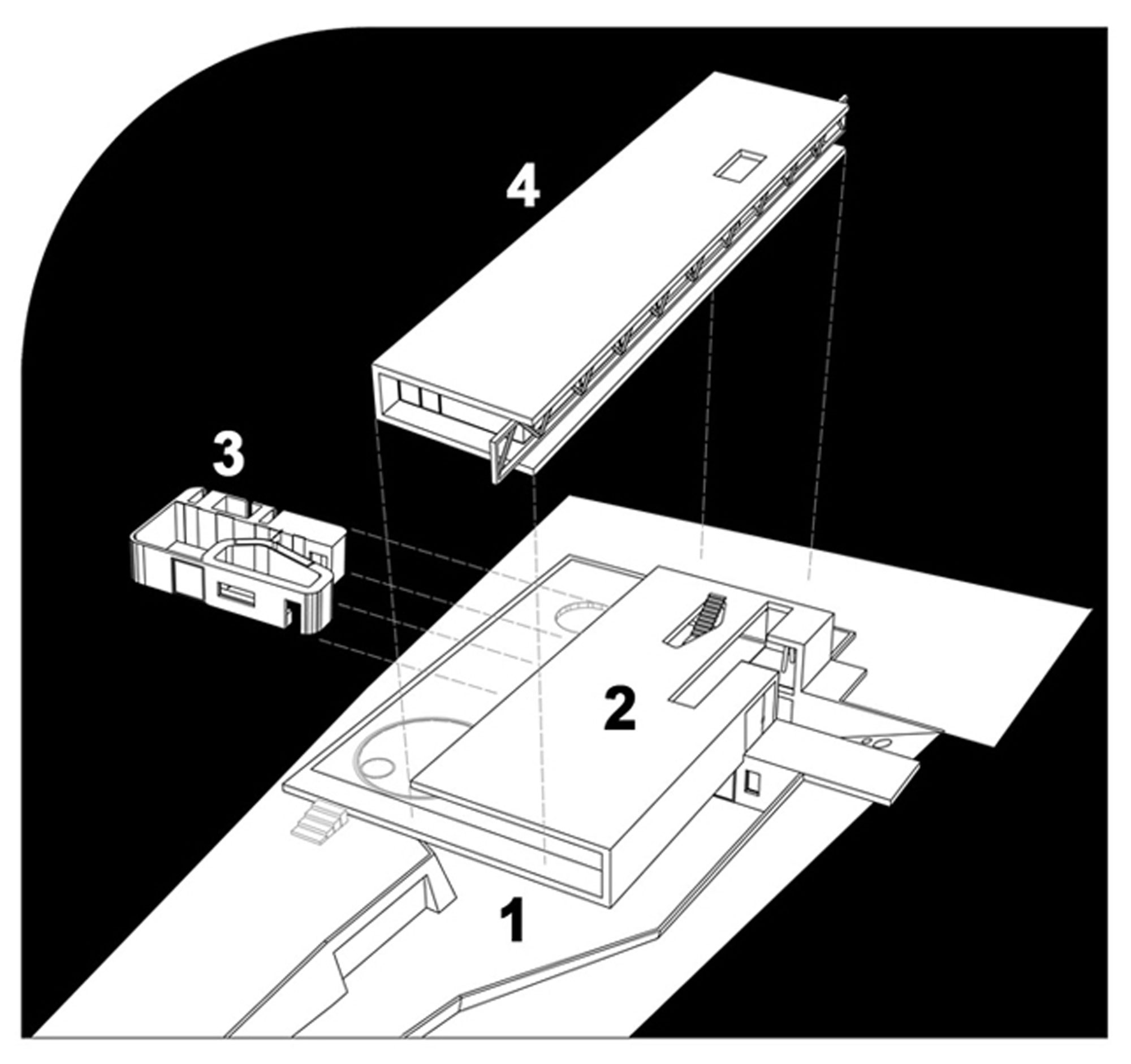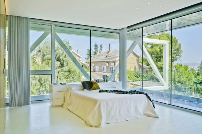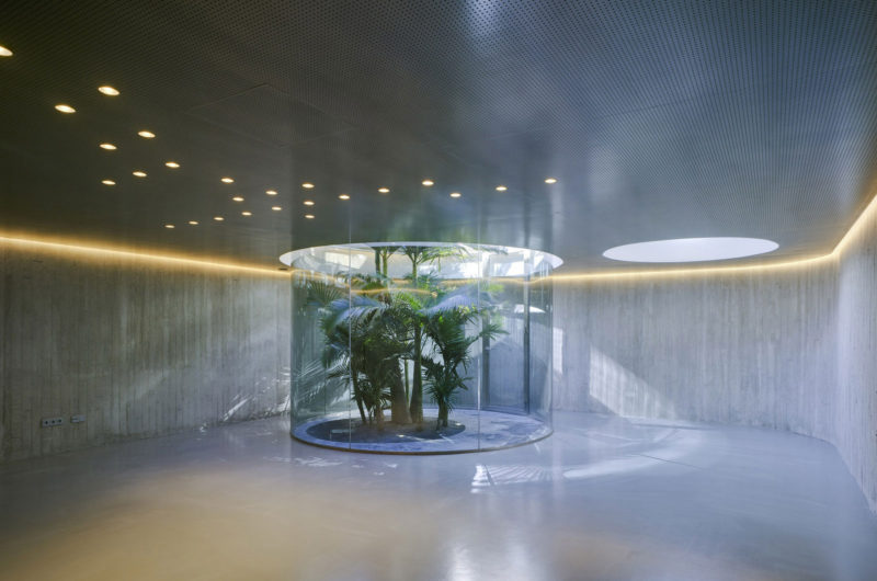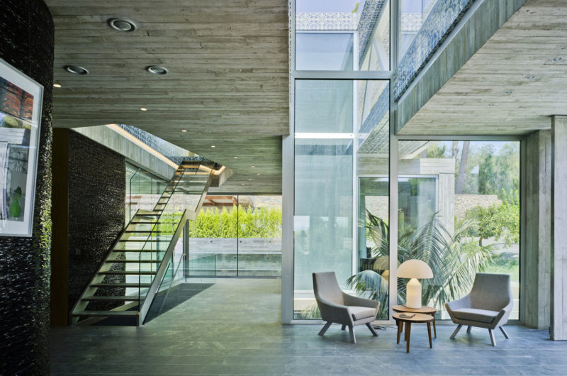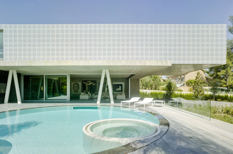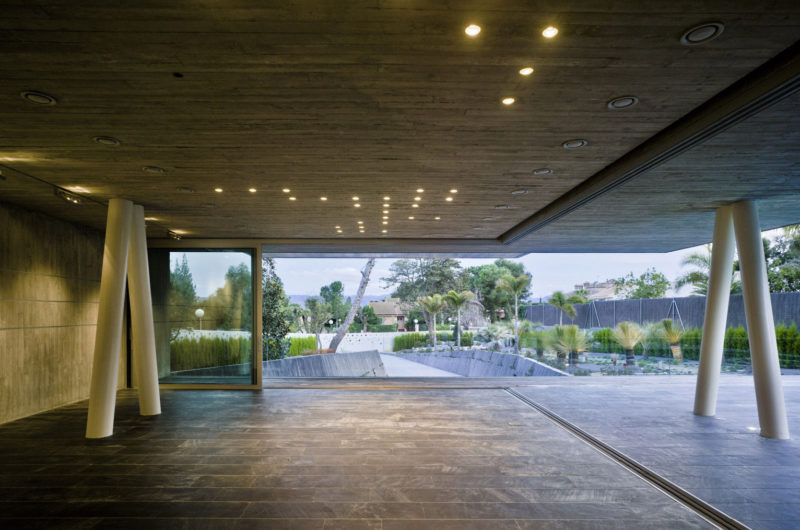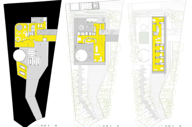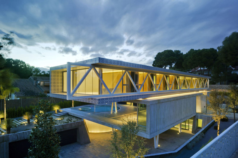 The 4 different sections of the house are categorized according to their purpose: leisure, living, autonomous living and guest living. The leisure areas can be found at the basement levels and include a car park, a swimming pool as well as a series of skylights and patios. The ground floor, with its C-shaped concrete layout comprises the main living areas. A gorgeous cantilevering canopy acts as a buffer between the indoor and outdoor spaces, both of which can be used for relaxation and socialization purposes. A special stacked glass volume acts as the autonomous living area and can be found within the C-shaped concrete piece we mentioned before.