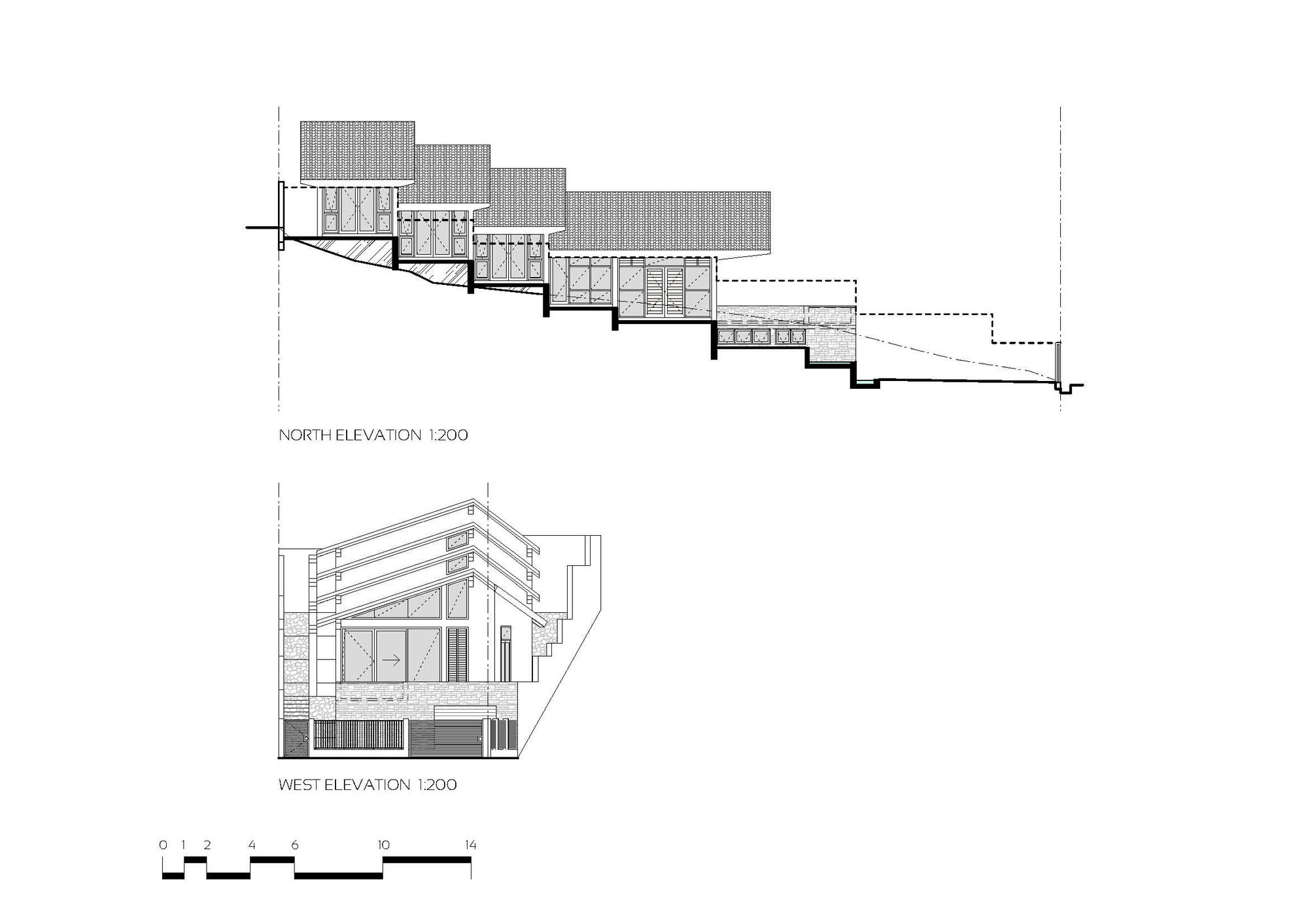 Passive design features were critical to reducing the carbon and energy footprint. The effectiveness of natural ventilation, capturing breezes, cooling perimeter gardens, high ceilings, ground level living, and thermal mass have meant that air conditioning is avoided. Natural cross ventilation is promoted through a highly ‘openable’ skin of doors and windows facing perimeter gardens, and capturing a natural cooling breeze coming down the mountain on the Northern elevation. Spaces stepping up the hill are connected by the linear hallway with high level windows and louvers promoting stack ventilation. The transparent glass elevations, high windows, and skylights permit generous natural daylight, while deep, low eaves reduce direct sun penetration. Electricity consumption is minimised using solar hot water and electricity.
