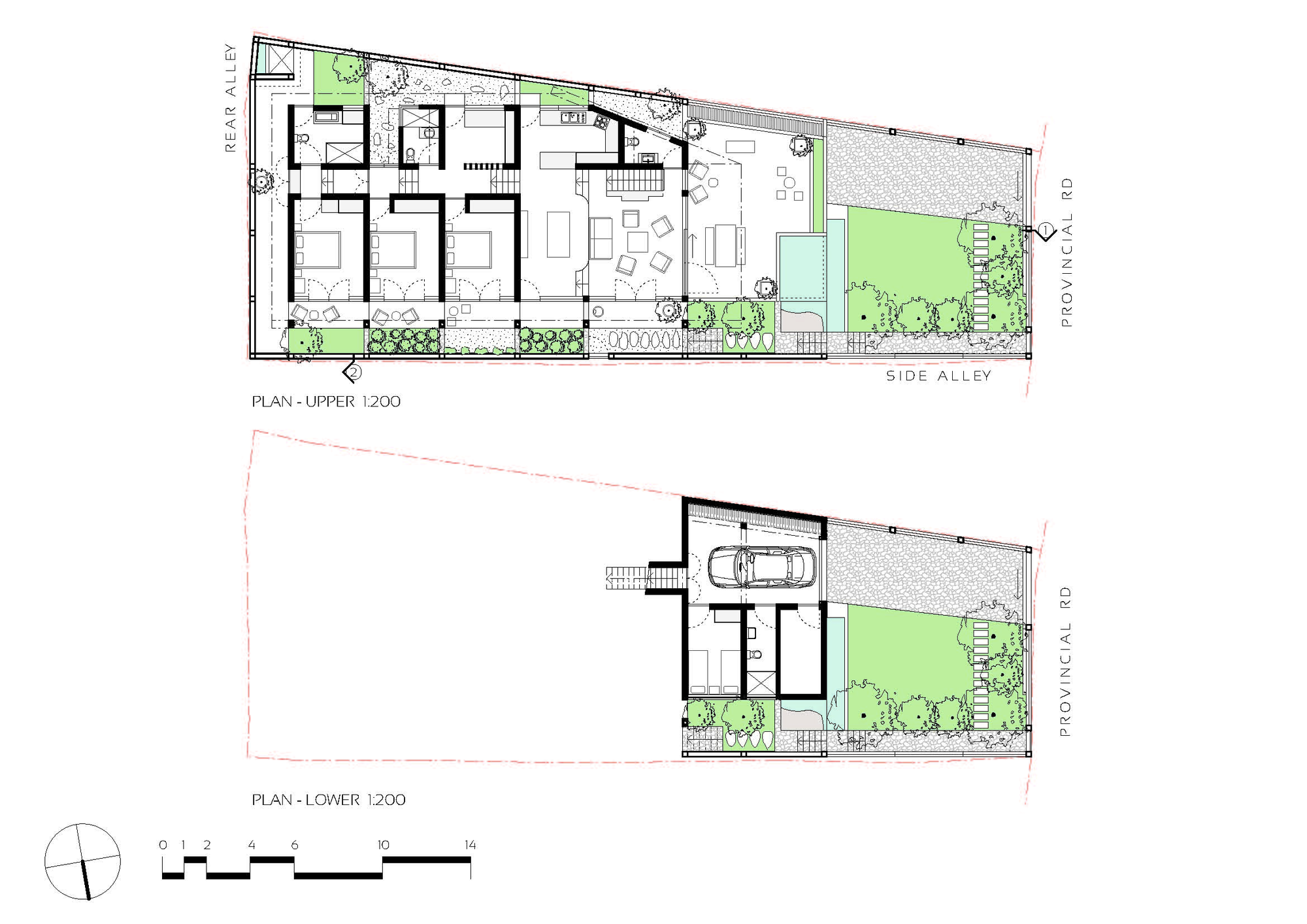 Moving up the hillside and through the villa, a linear sequence of spaces and platforms unfold. There is a transition from the communal front living, dining and entertainment terrace under one generous cantilevering roof to smaller private spaces and intimate gardens connected by the central hallway.