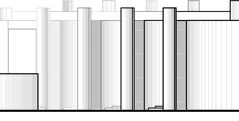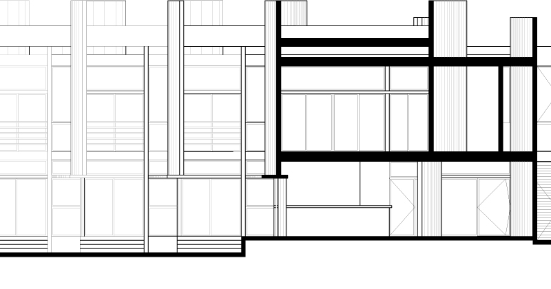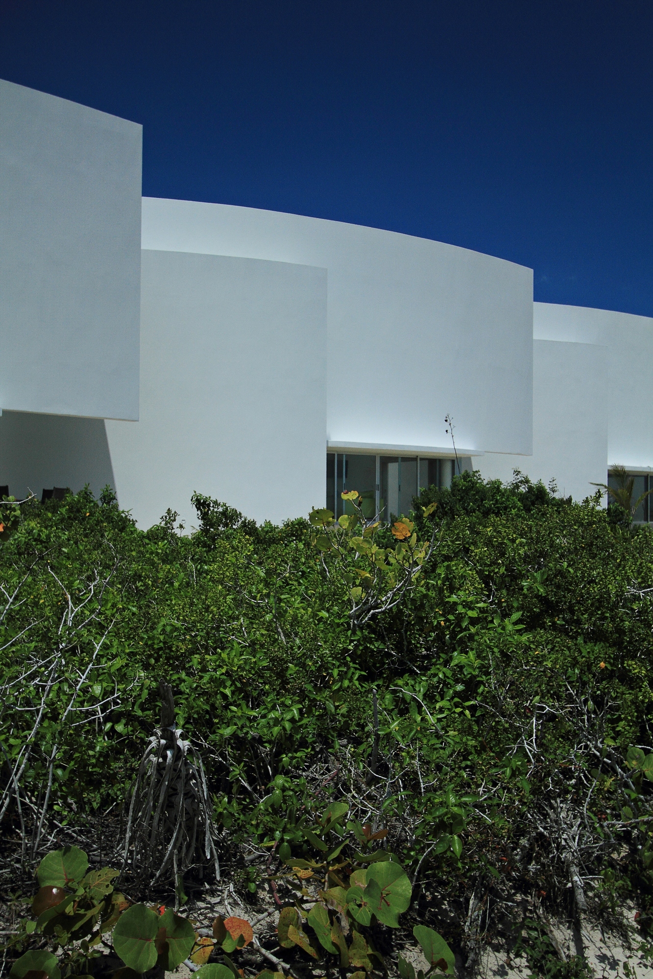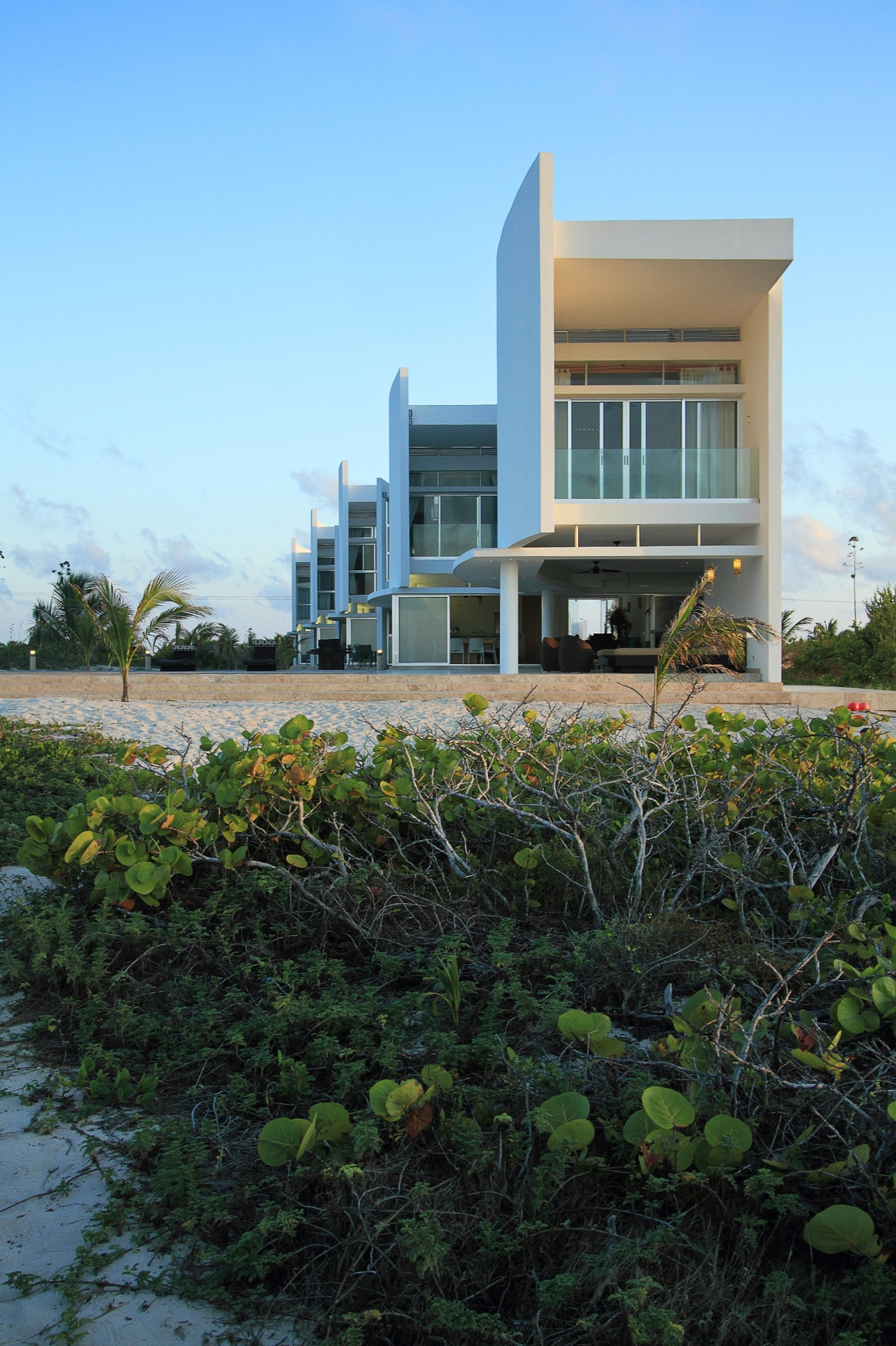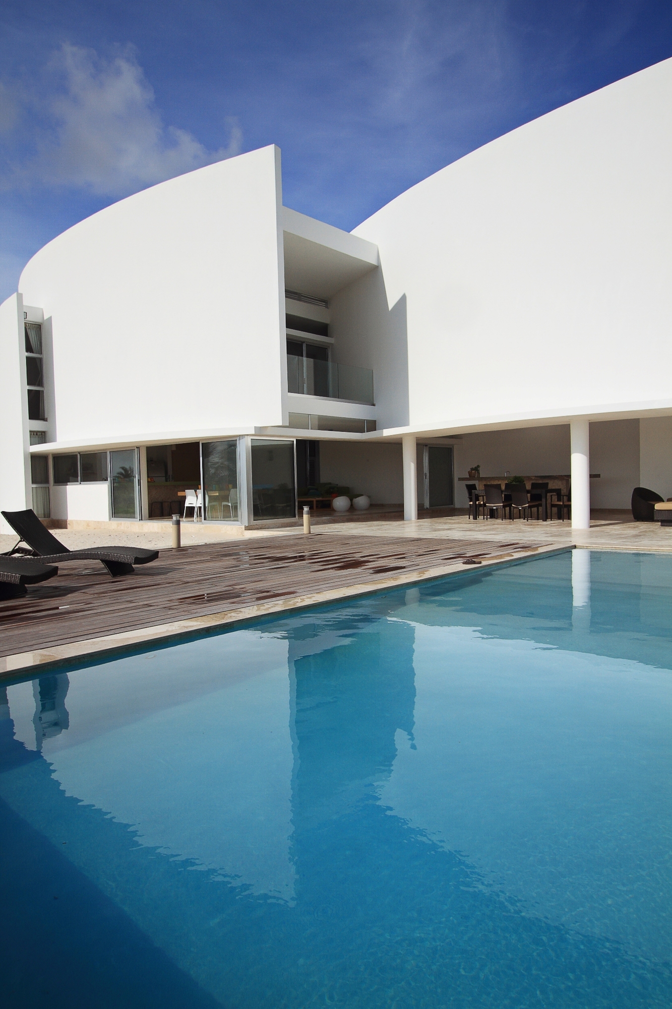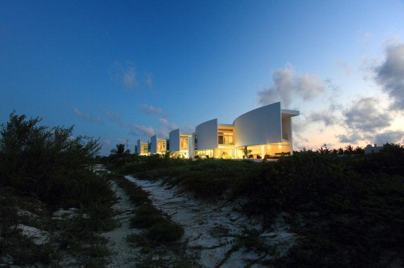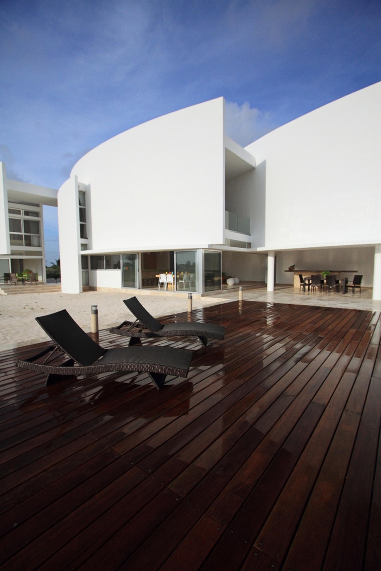 Curved lines create a fluid aspect to the exterior of the houses offering not only a view toward the ocean, but also visual connection to the other rooms. The wood terraces of each building serve as entrances. The great curved walls also have a double purpose: to create a maximum of privacy for each dwelling, as well as very good air flow.