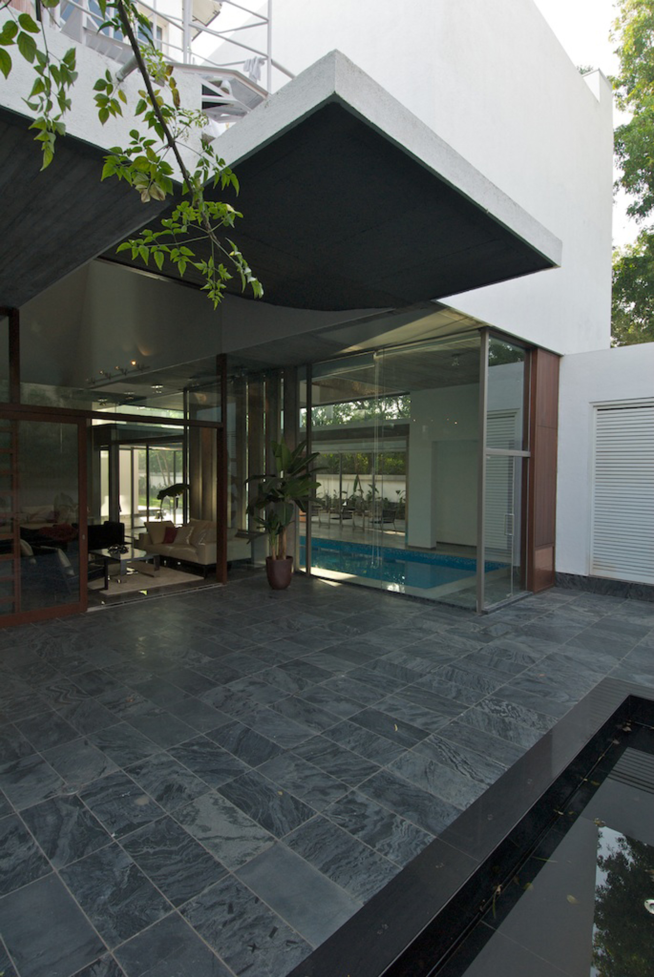 The Poona House was completed in 2008 by Rajiv Saini. It is located in Mumbai, India and was designed as the owner wished. The lounge offers direct visual access of the entire house, the rooms are arranged around the central core, the separation between the entrance lobby and the lounge being made by a suspended double height screen in slatted wood.