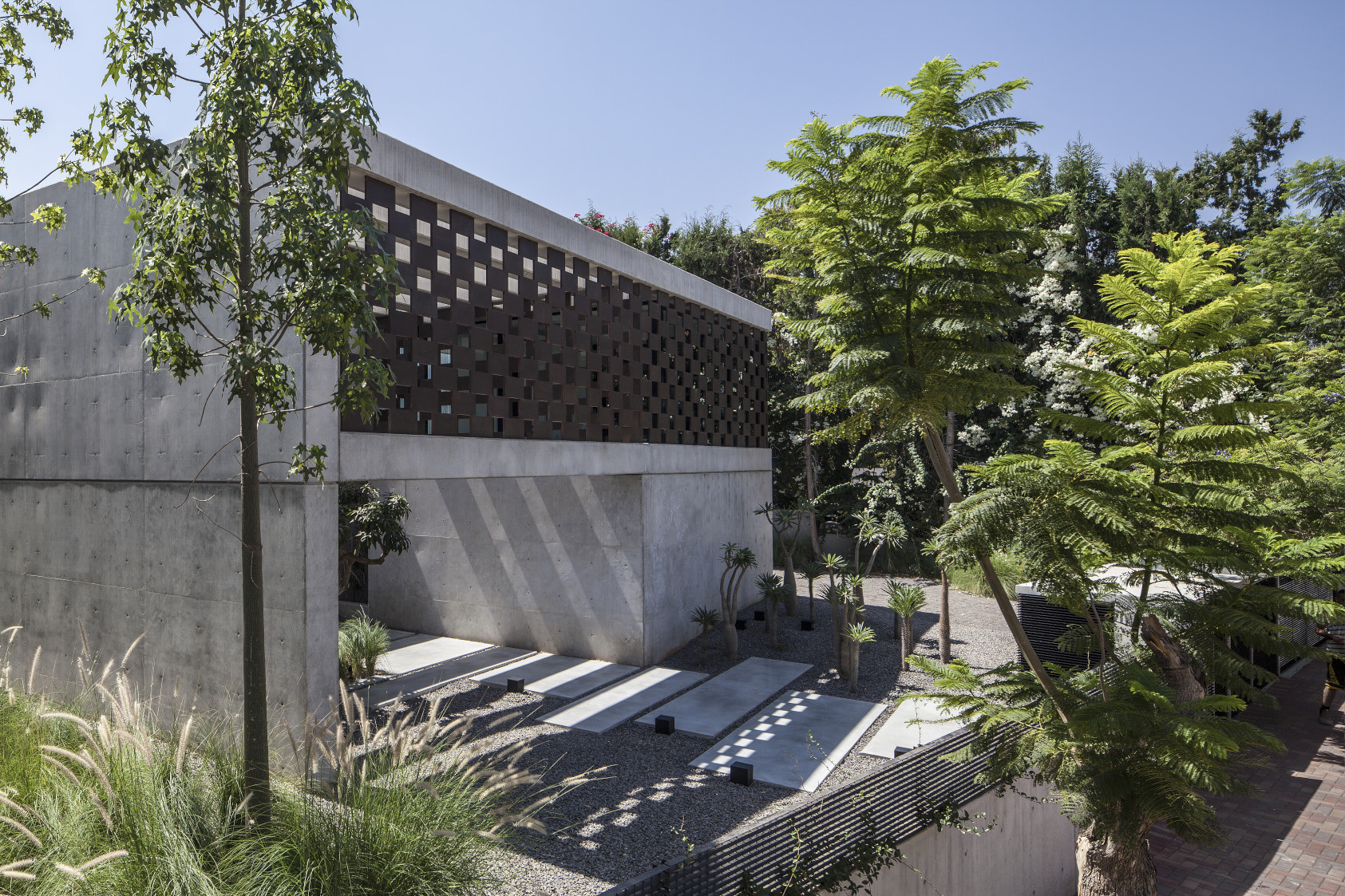 The external area, the weathered steel layer is seen as being two dimensioned from afar but does, in effect, have volume and can be experienced almost as a piece of sculpture or work of art and not just in terms of its function as part of the building’s structure. This same structure creates the building’s most important element, an element that has no physical aspect and takes up no volume or space – the layer of shadow. Shadows projected onto the walls and floor result from the building’s external structure’s early planning that relates to the angle of the suns light on the plot. This early planning allowed the architect to create areas and complete surfaces used as a canvas for the shadows to paint upon. The building is constructed of exposed concrete walls, large and inanimate and, without the movement of light and shade, they appear almost monastic. The shade and shadows moving across the building’s surfaces create a dynamic drama that makes the entire mass seem to be alive and full of movement. Sometimes the shadows and shade create repeating geometric shapes that sometimes stretch the entire length of the wall and sometimes creating unique blends of color and depth on the grey walls.