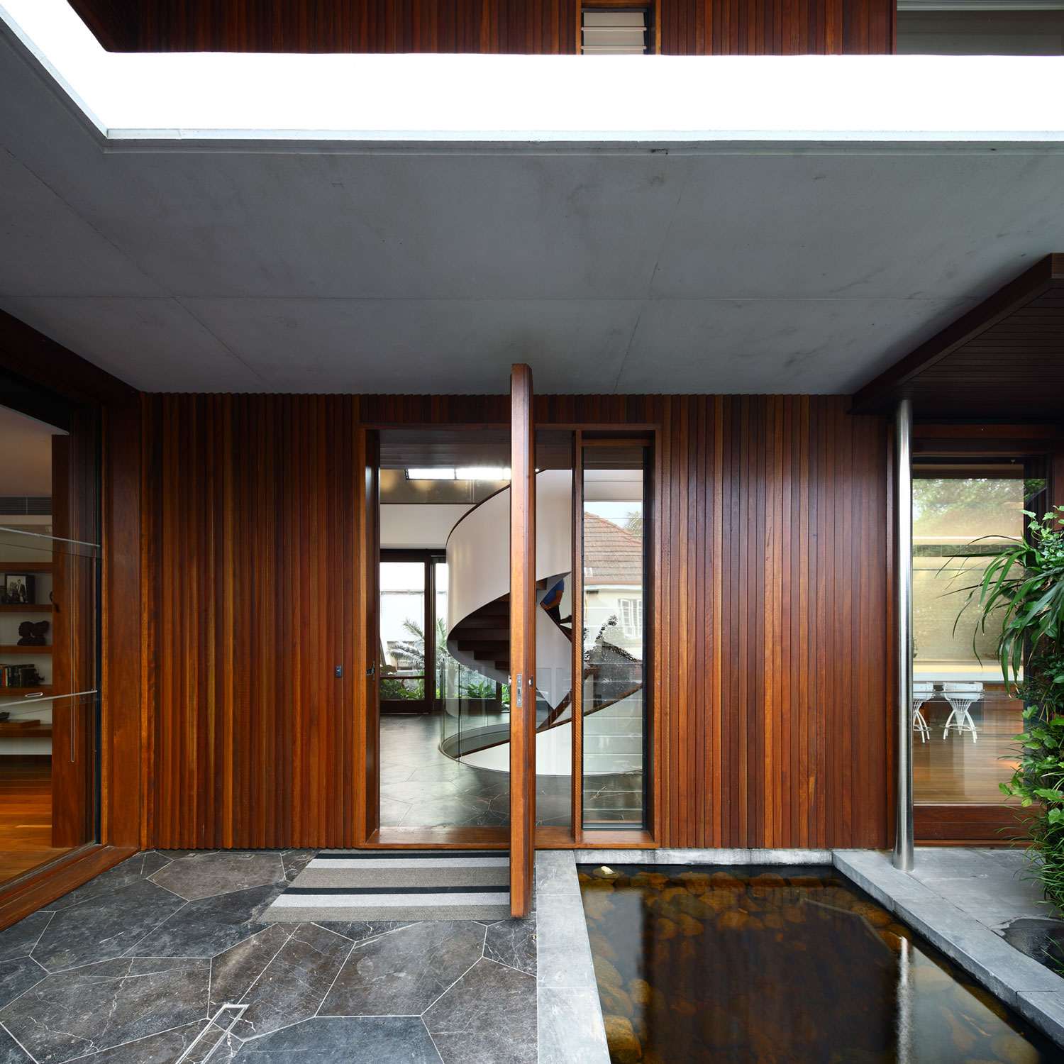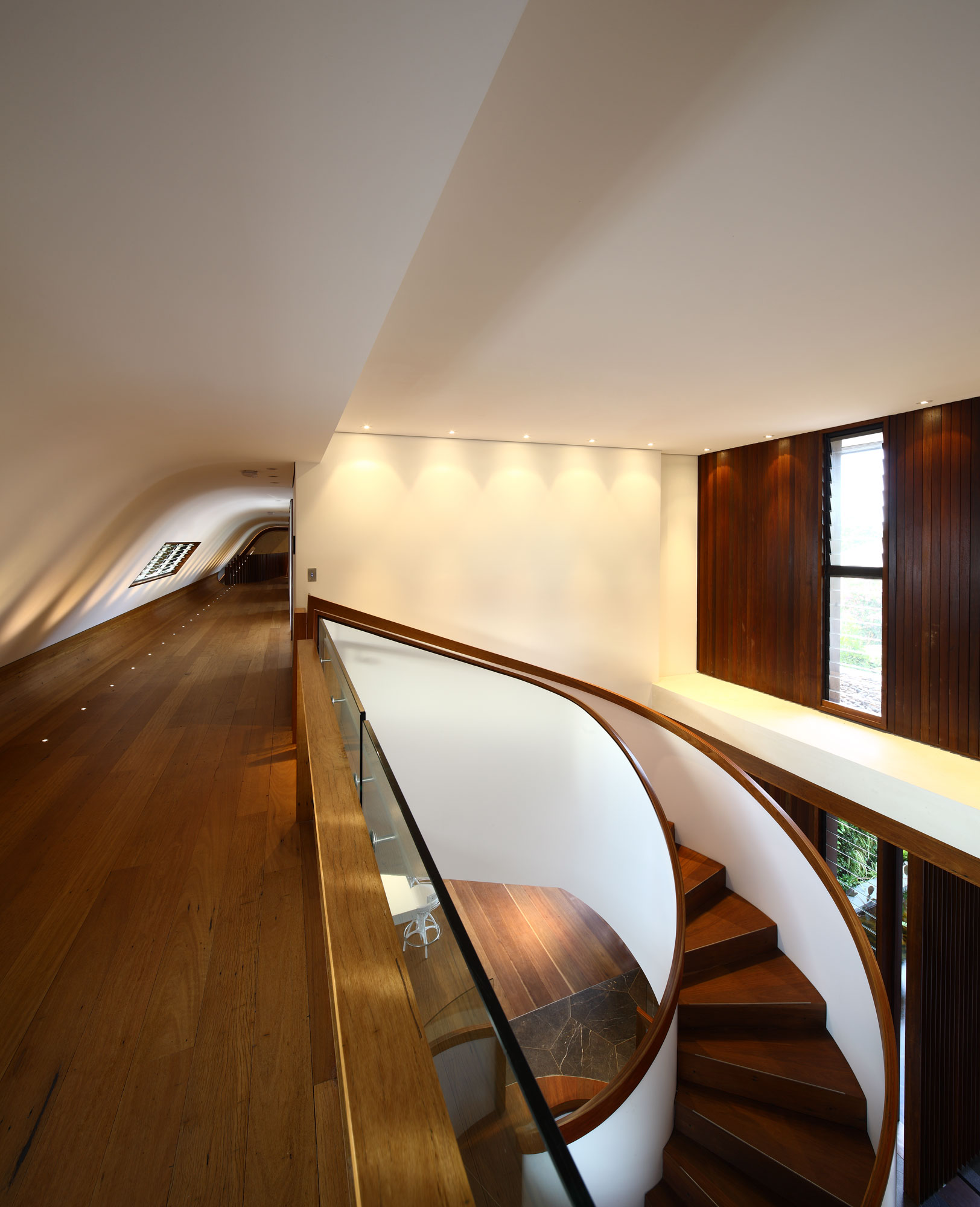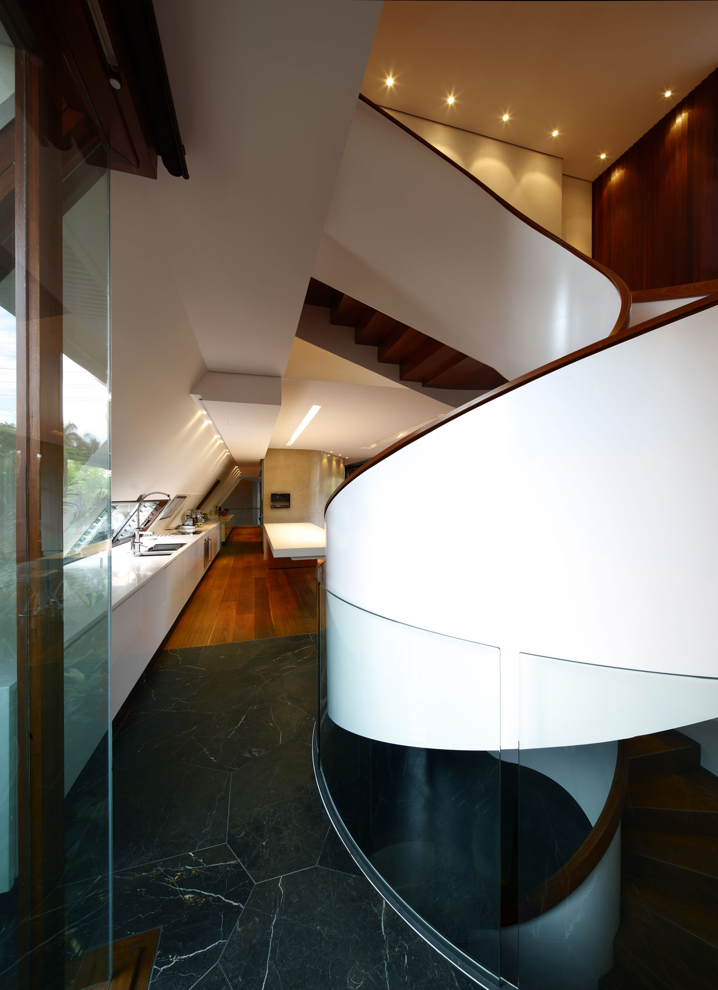 The 3 levels of the Oxlade House are linked by a spectacular spiraling staircase that flaunts contrasting tones of dark brown and pure white.