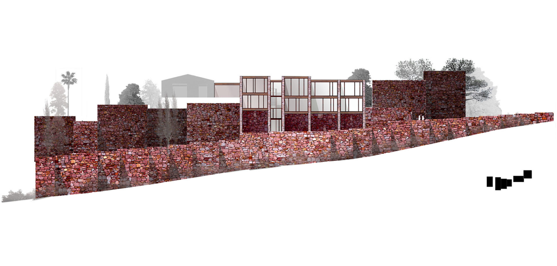 Wide glass panes encloses the stone walls, allowing total transparency between the mountain and the valley and emphasising the massiveness of the walls.