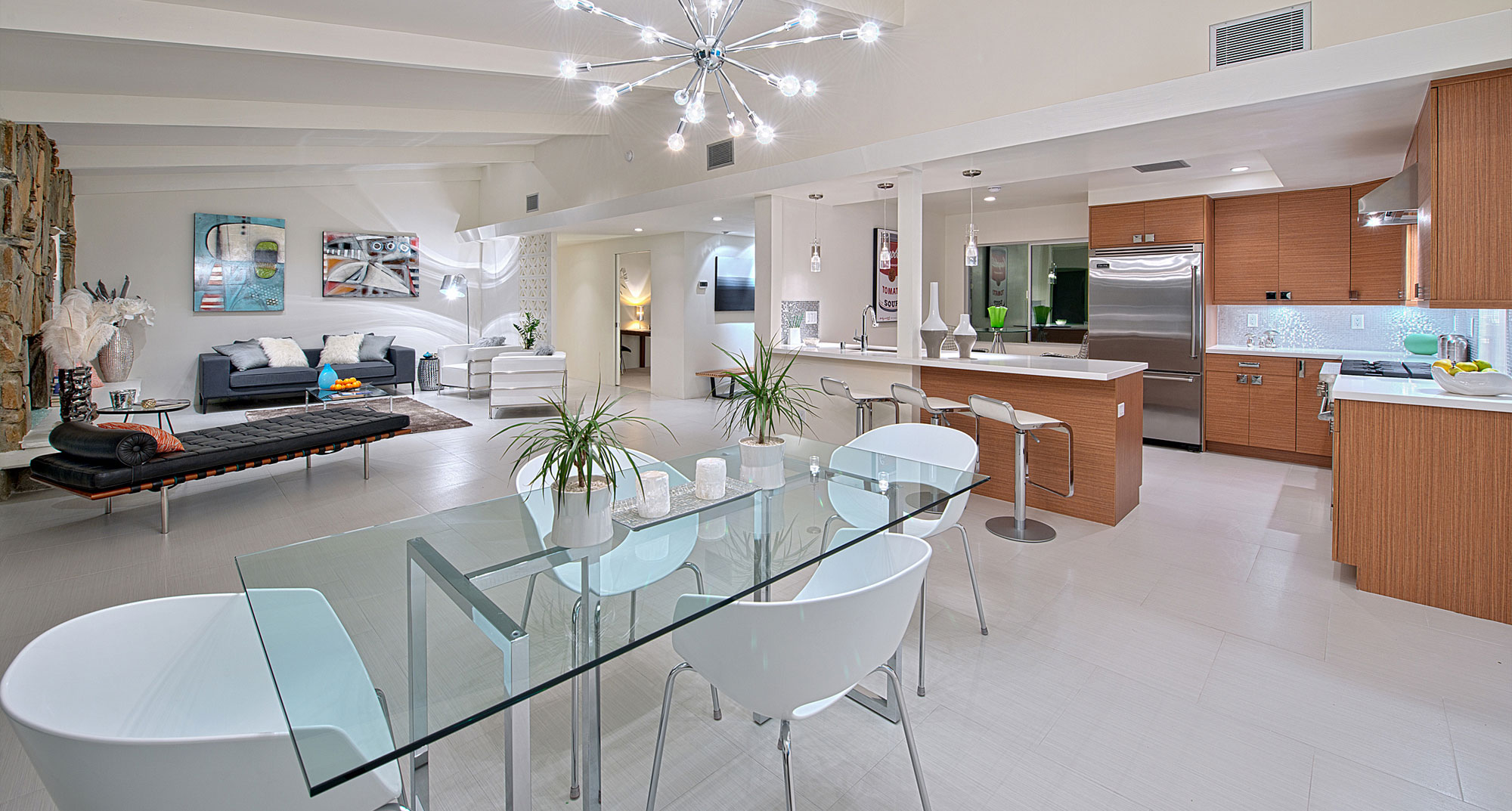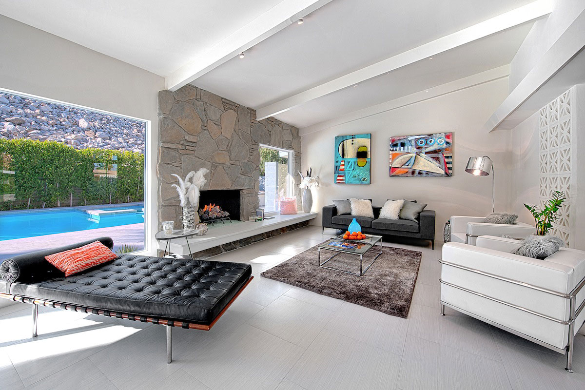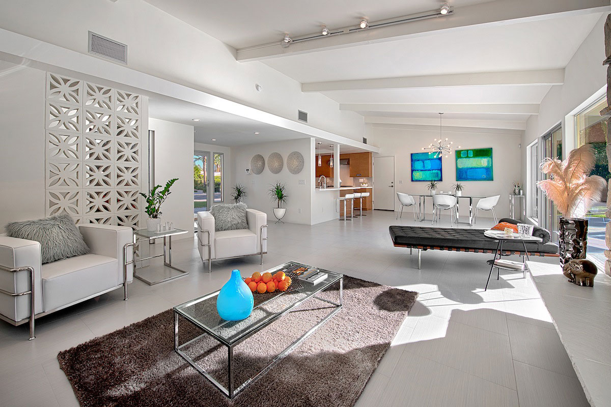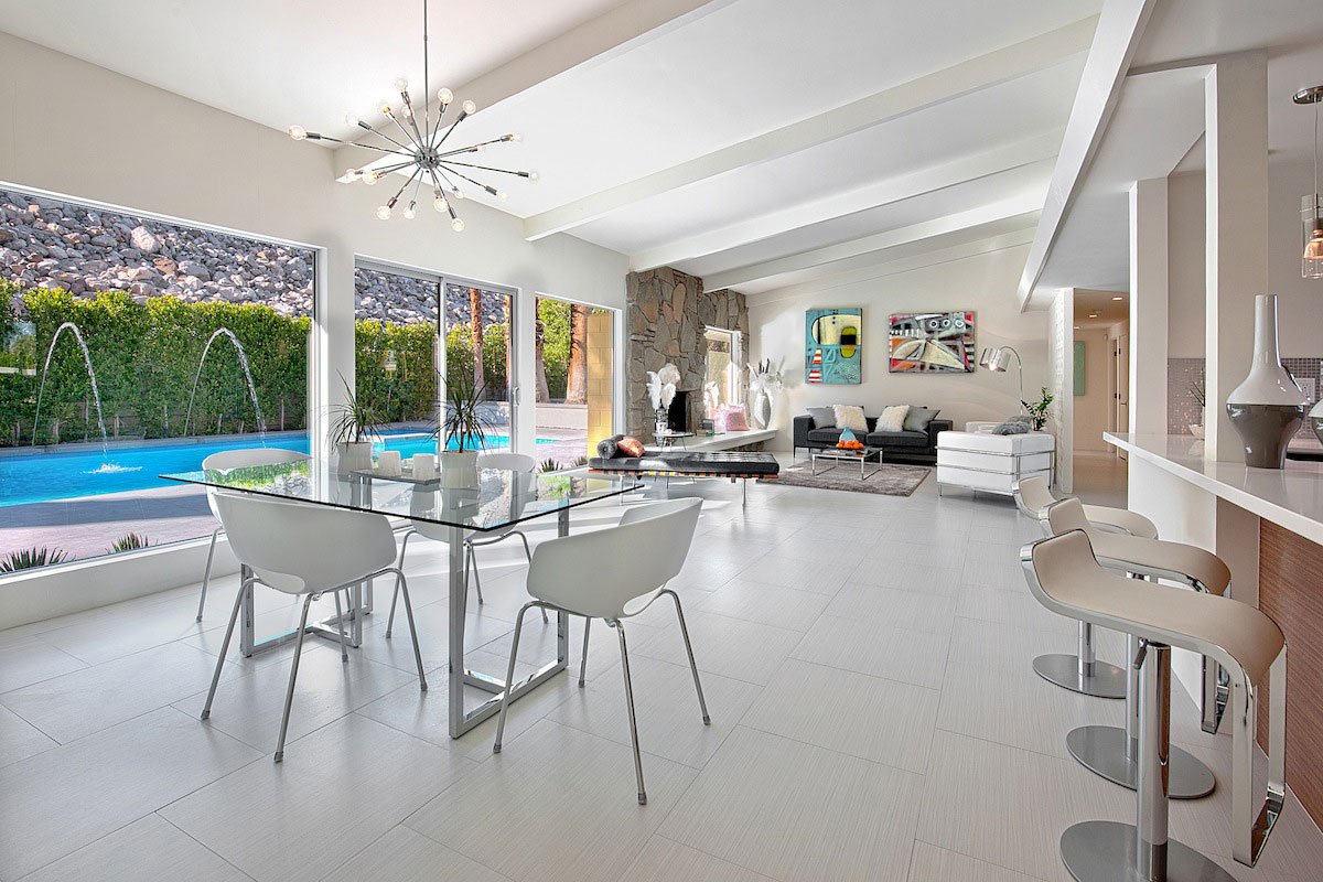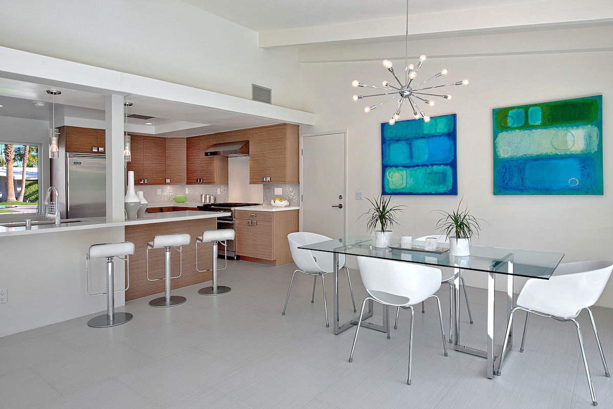 The client saw this as a second or vacation home so we sat down with him to design a dream Palm Springs getaway. Installing all new surfaces though out the house was an instant decision and opening the kitchen for a more modern floor plan was as well. New kitchen cabinets with Cambria counters and Viking appliances really meet today’s standards for such an upscale home. All the bathrooms were completely updated with new tile, vanities and fixtures but the master bathroom was the biggest transformation with incorporation of a walk-in shower and a free standing tub. We retained the large window in the master bath and placed the tub in front of it to take advantage of the sweeping mountain views. We also added clerestory windows in the master bedroom to exaggerate the vaulted ceilings. The furnishings in the house were meant to be a mix of vintage, contemporary and modern to create the ultimate Palm Spring chic getaway.