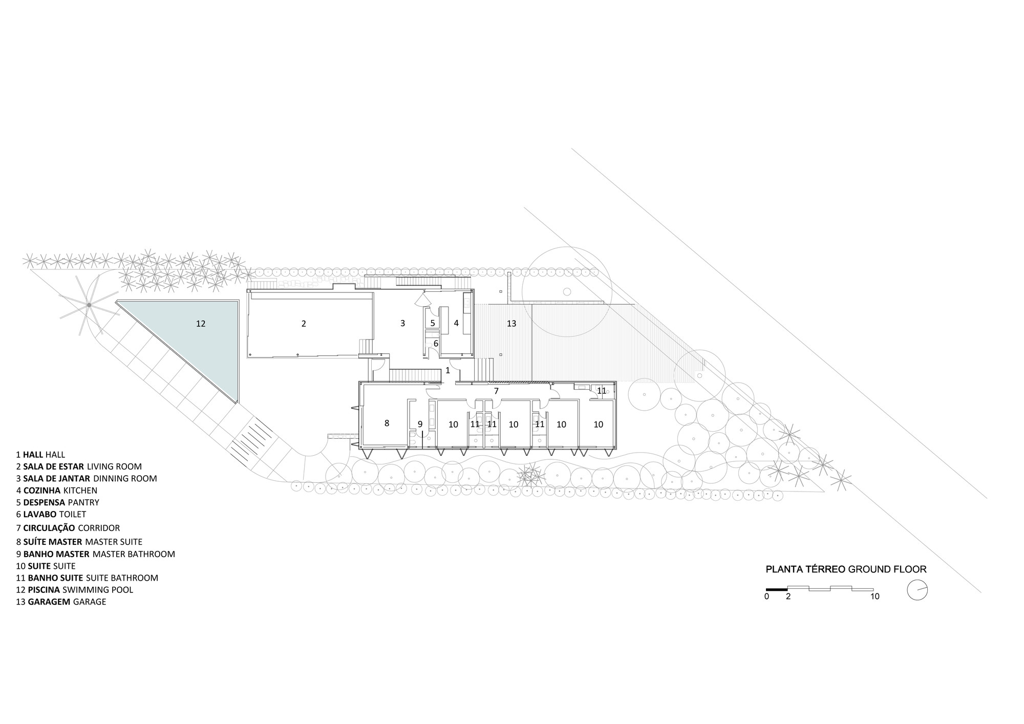 The conceptual aim of this project was to develop a house with two floors that visually appeared buried. For that, we raised the main level of he house 1.5 m, creating a lower, half buried level, yet with natural lighting and ventilation. On this floor are the service and leisure areas, such as home theater, gym and sauna.