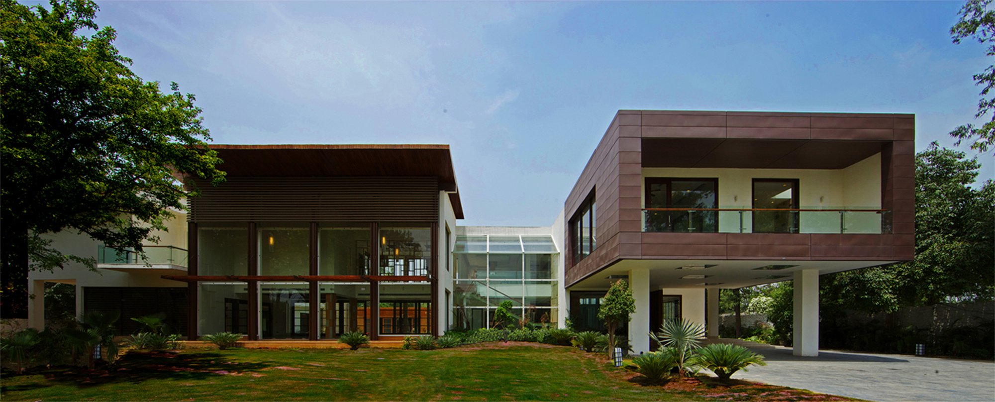 The building, a modern structure, sits at the rear end of the rectangular plot, with a landscaped garden in front. Its geometry is composed of a cluster of perpendicular blocks, with a protruding cantilevered box over the entrance. A pergola casts interesting shadows, which change with the time of the day. Various architectural compositions present themselves, when viewed from different sides. The approach through the driveway provides a view of the cantilevered block, which is clad with zinc from a European company, (for the first time in India), giving it a distinctive character. The rest of the exterior is a combination of glass, and rough tile cladding.