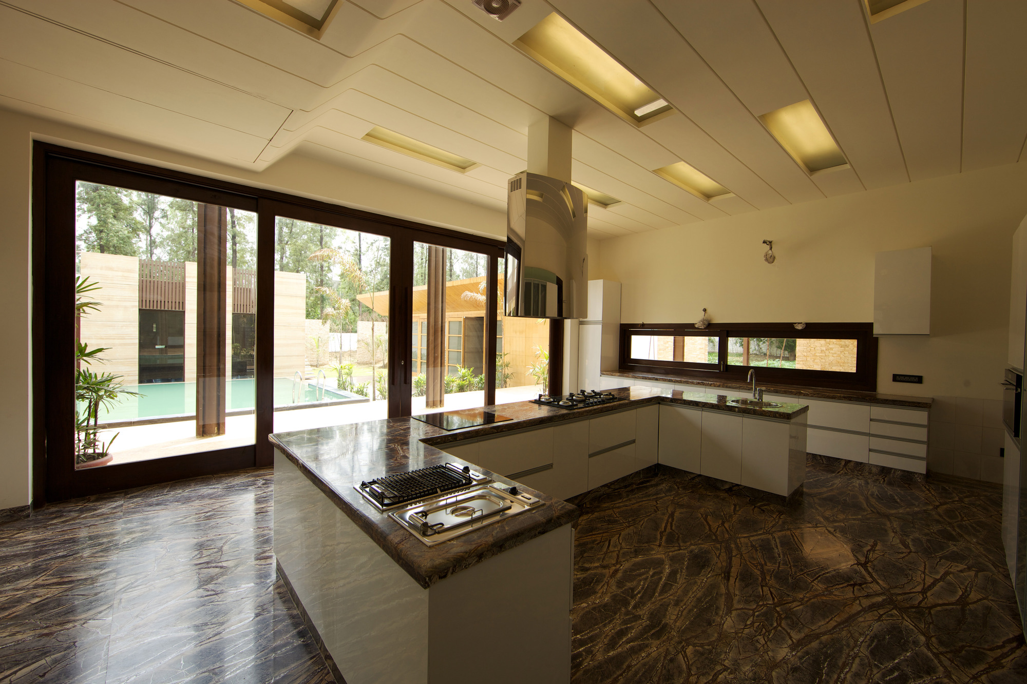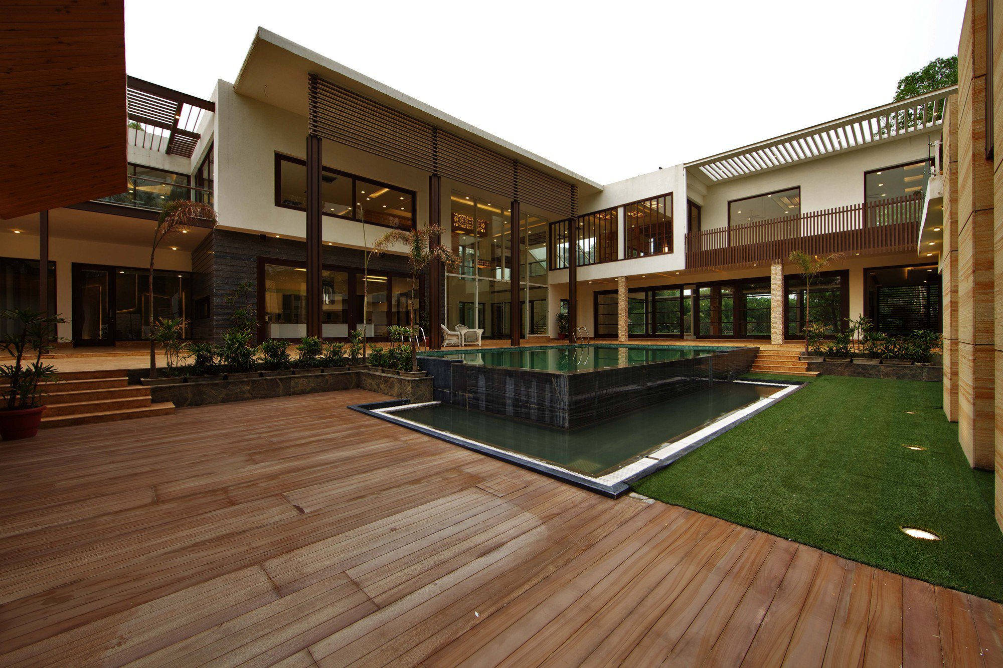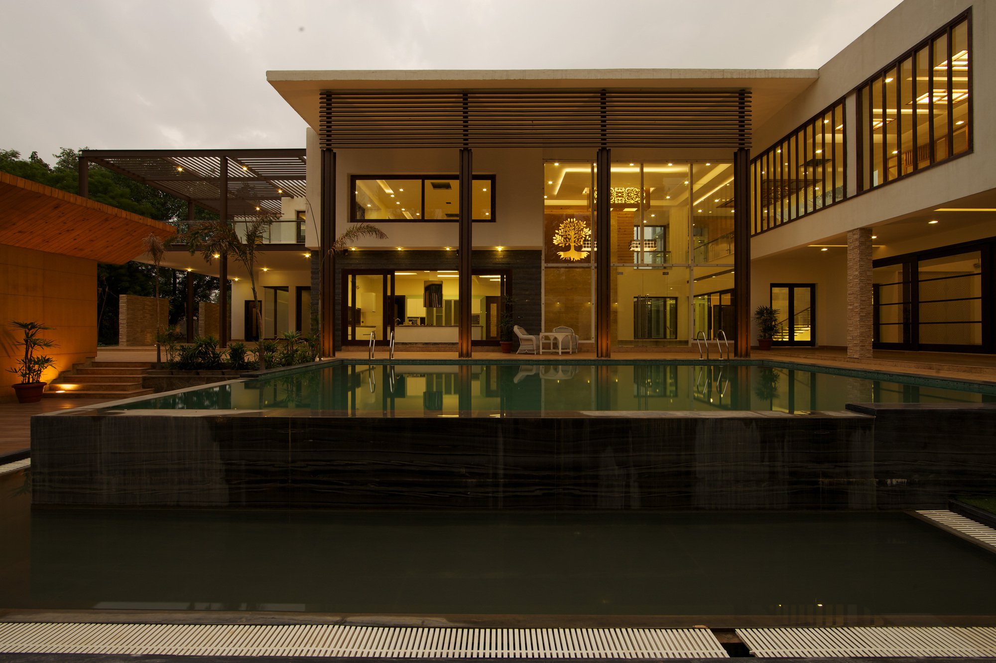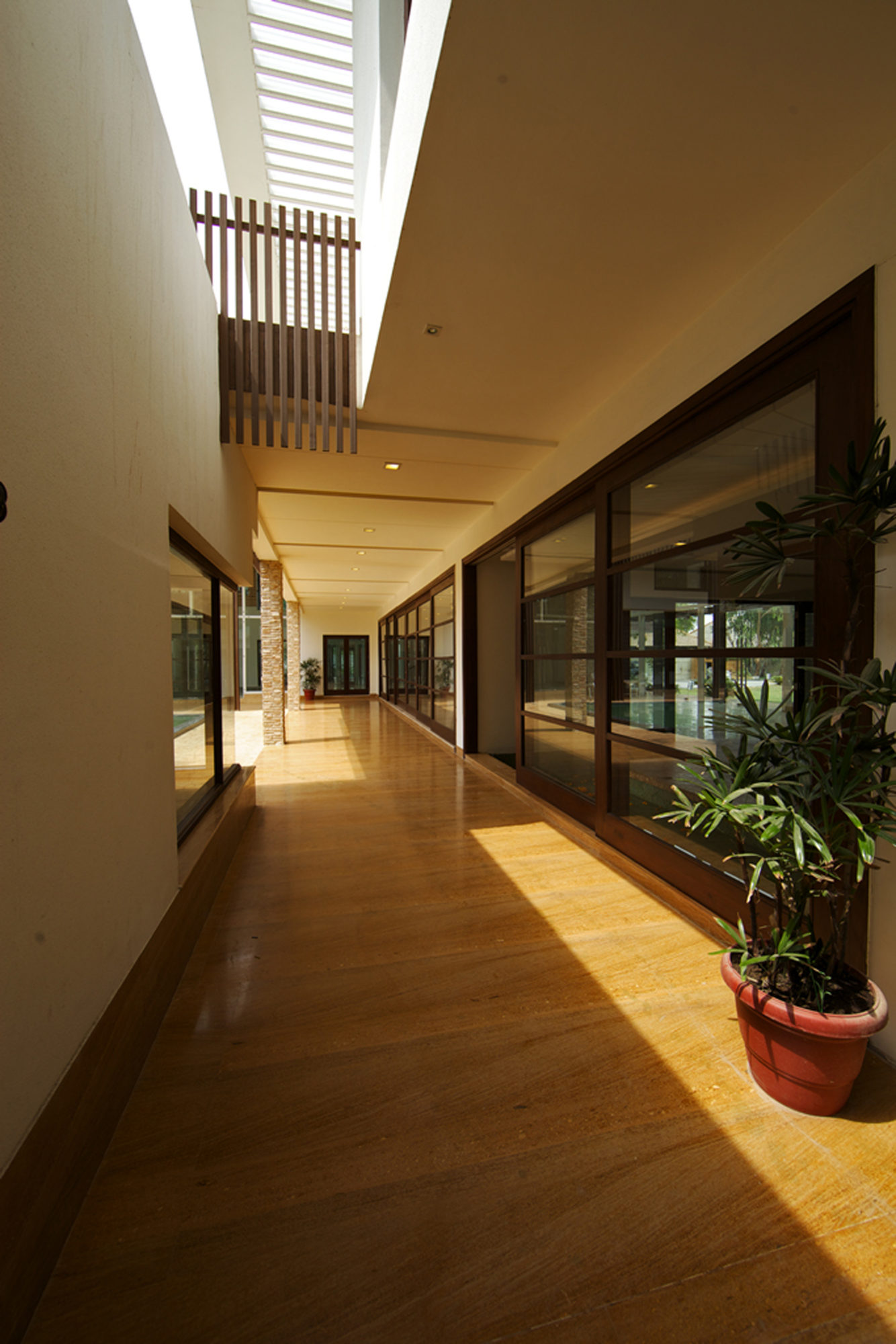The sprawling farmhouse has a built-up area of 20,000 sq ft on a 2.5 acre site. With a contemporary vocabulary enhanced by attention to detailing, the layout of the structure ensures views of the pool or the lawn from all parts of the house.