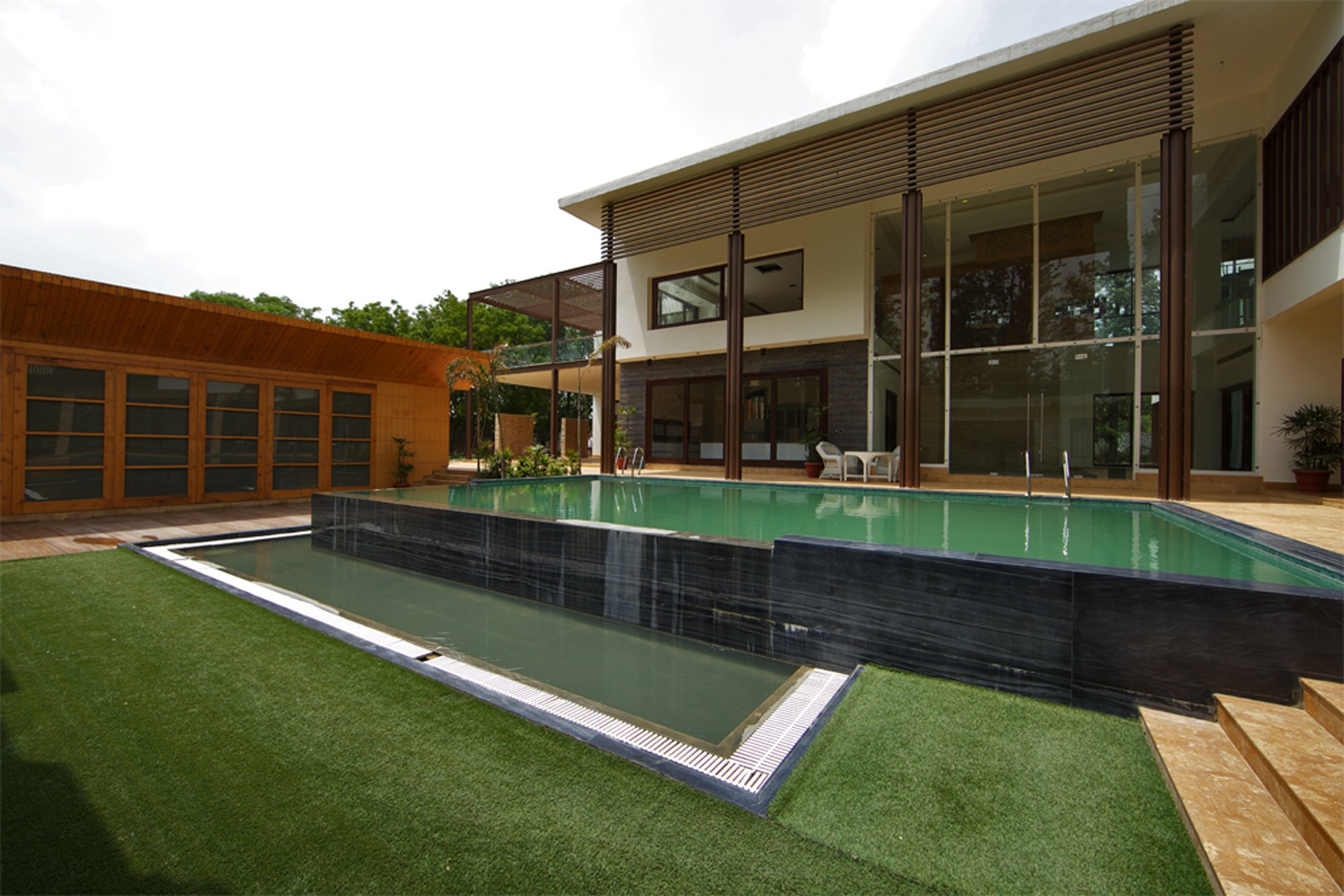 Farmhouse is certainly a euphemism for this home. ‘Mansion’ or ‘luxury hotel’ might be more appropriate word to define the design. Enormous rooms and bathrooms, Jacuzzis, sunken bathtubs, steam rooms, a card room and a spa are all par for the course.The geometry of the structure is composed of a cluster of perpendicular blocks, with a zinc- clad protruding cantilevered box over the entrance various architectural compositions present themselves, when viewed from different sides. A ‘fire room’ to house a fireplace for those cold days in Delhi, has a water body on its periphery. This unusual twist combines the dual imagery of fire and water.