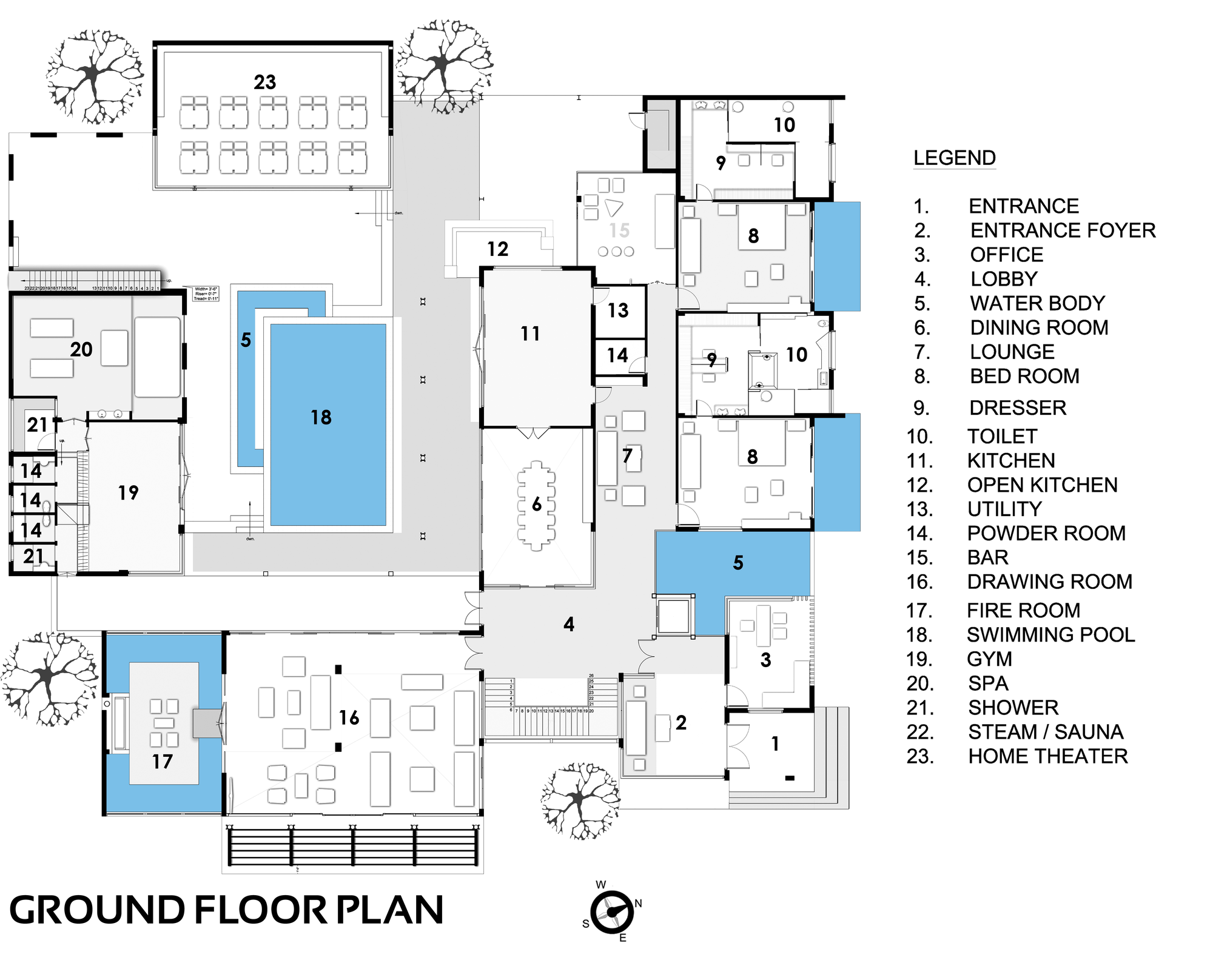Two storeys house the private and semi private areas. There are two units- guest space which face the gardens, and the main areas which overlook the poolside. The ground floor has the lobby, drawing and dining rooms, two bedrooms and a bar area, whereas the upper floor has three bedrooms with a master bedroom. At the pool side, at right angles to the drawing room, is the home theatre and gym. The spa is at right angles to the dining room, creating a closed, private space. Special attention has been paid to the treatment of the ceilings in every room, offering a fresh design and lighting option everywhere.