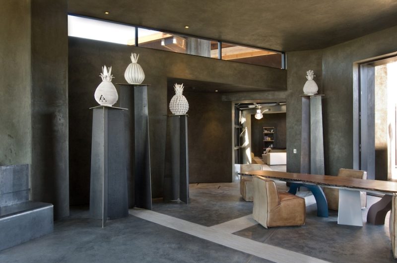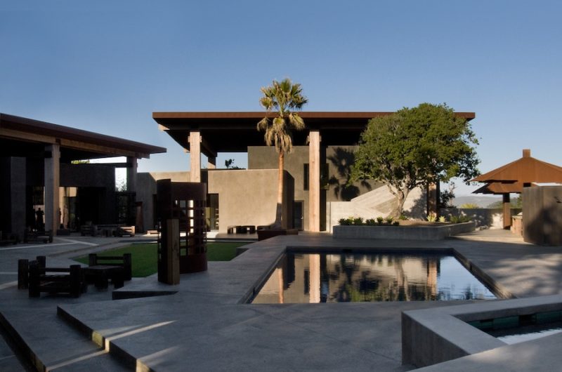 Tres Paraguas are, in fact, three enormous rectangular roofs of Corrugated Corten Steel roofs assembled on 30 x 30 square columns of Douglas Fir Columns 26 feet high, standing free of the five constructions below, which are self-roofed, heavily stuccoed in earth tones, with 18 foot walls and large 12 foot sliding glass walls.