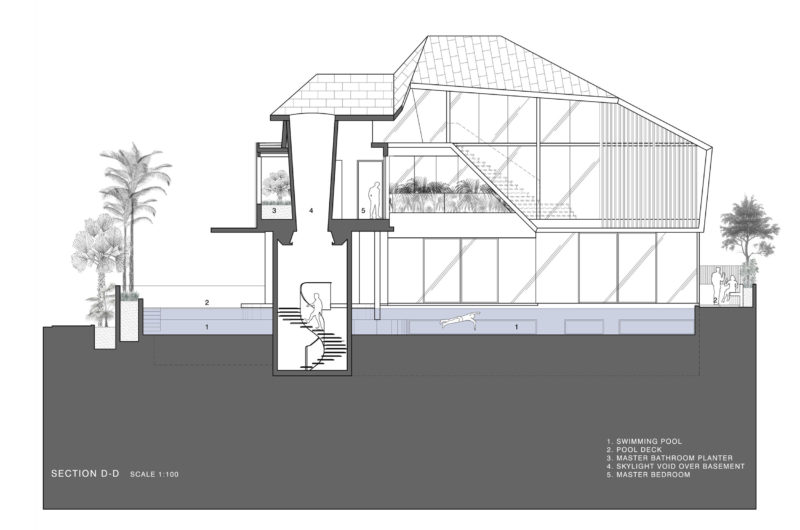 Transparency and communication are an important part of this entire home, and so is the connection with the outdoor spaces. Sliding floor-to-ceiling doors facilitate a seamless transition from inside the house to the outside living space and swimming pool. We really appreciate the entire concept of the house and the way it was brought into existence by Formwerkz Architects.