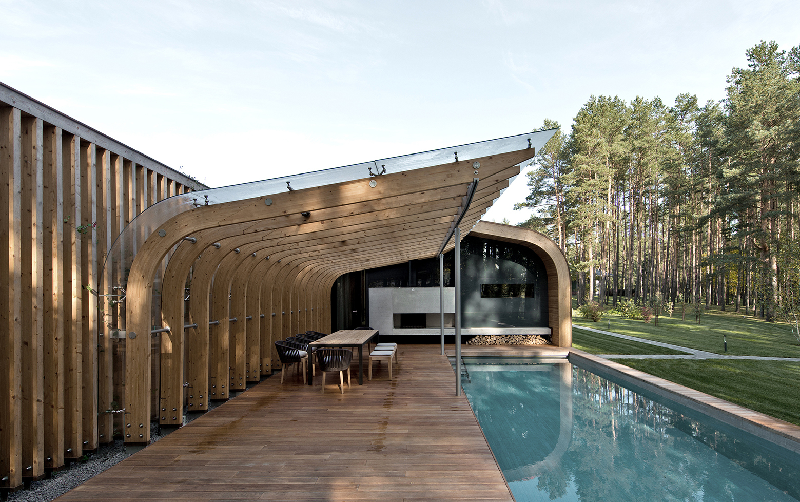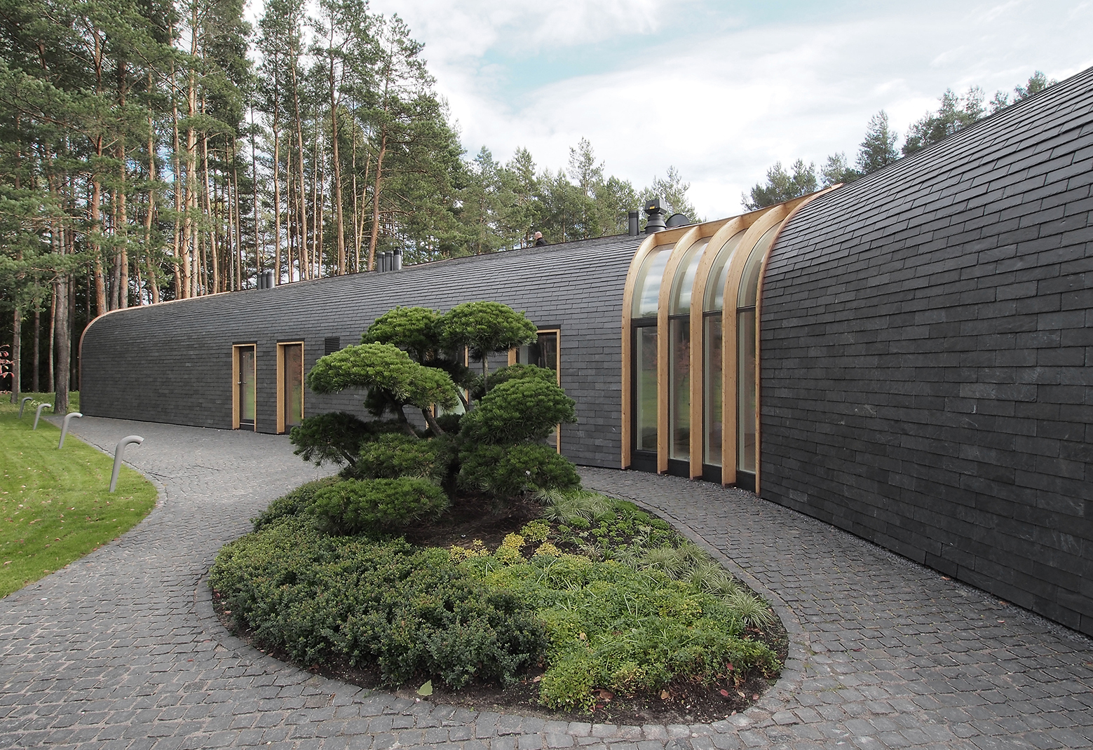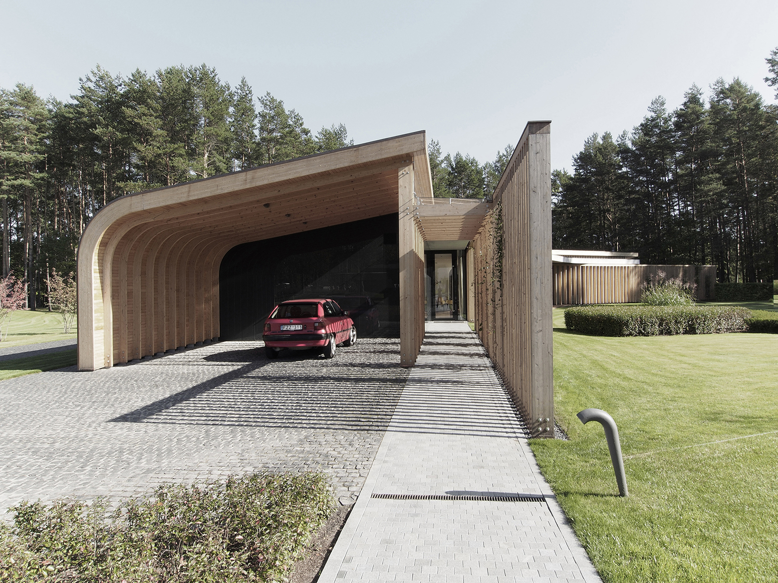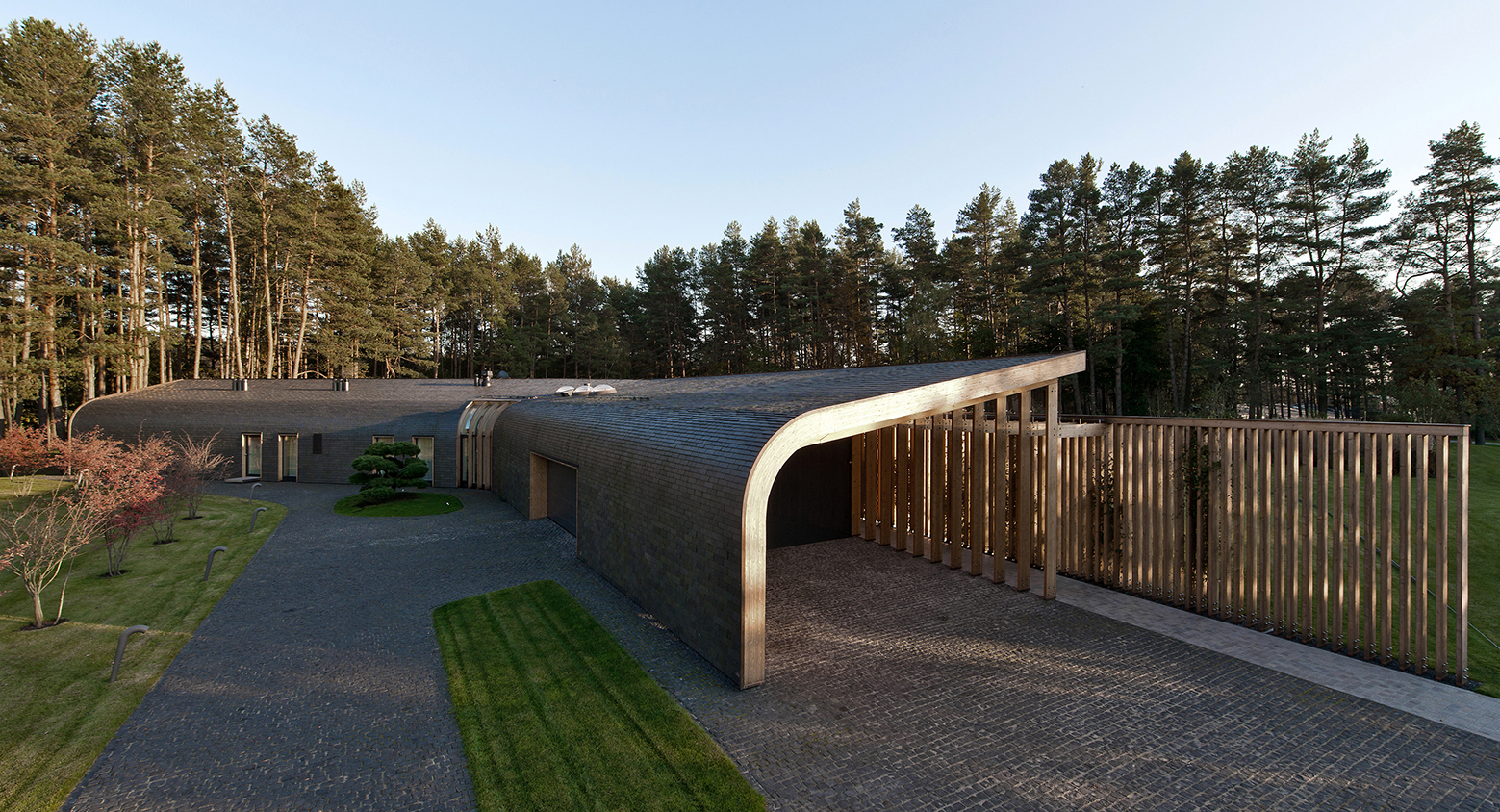 The main architectural idea was provided by its siting in the Pavilniai Regional Park : the house has to dissolve in the landscape. Curved roofs all the way to the ground, and fluid forms extended by timber pergolas, are the most important architectural means achieving this effect.