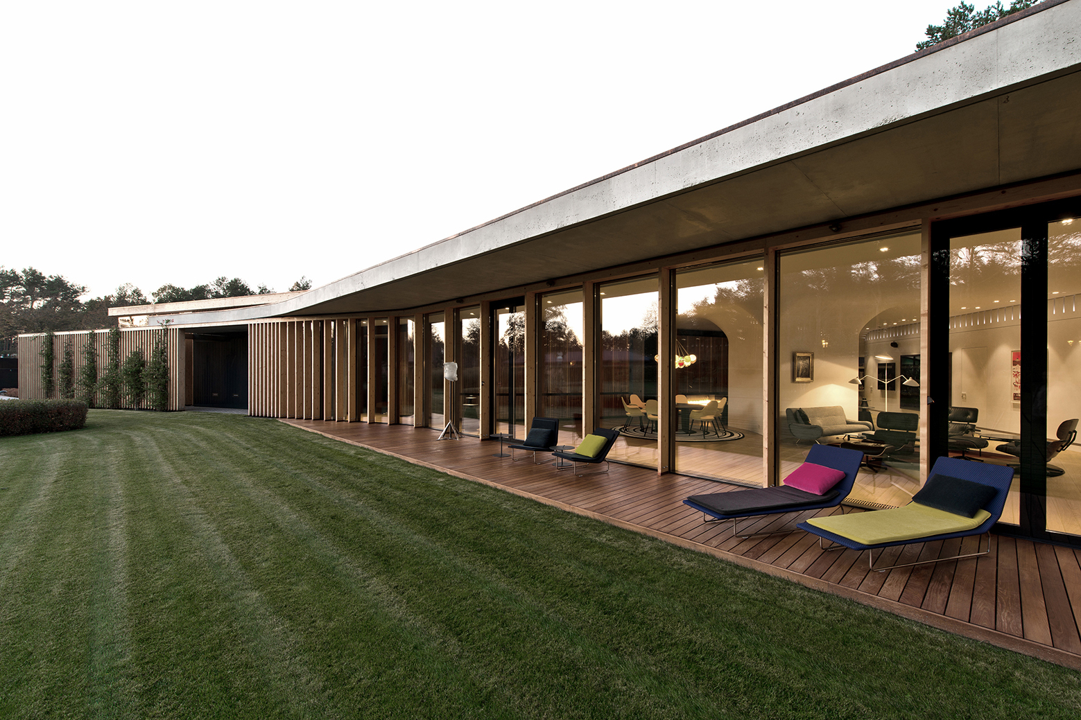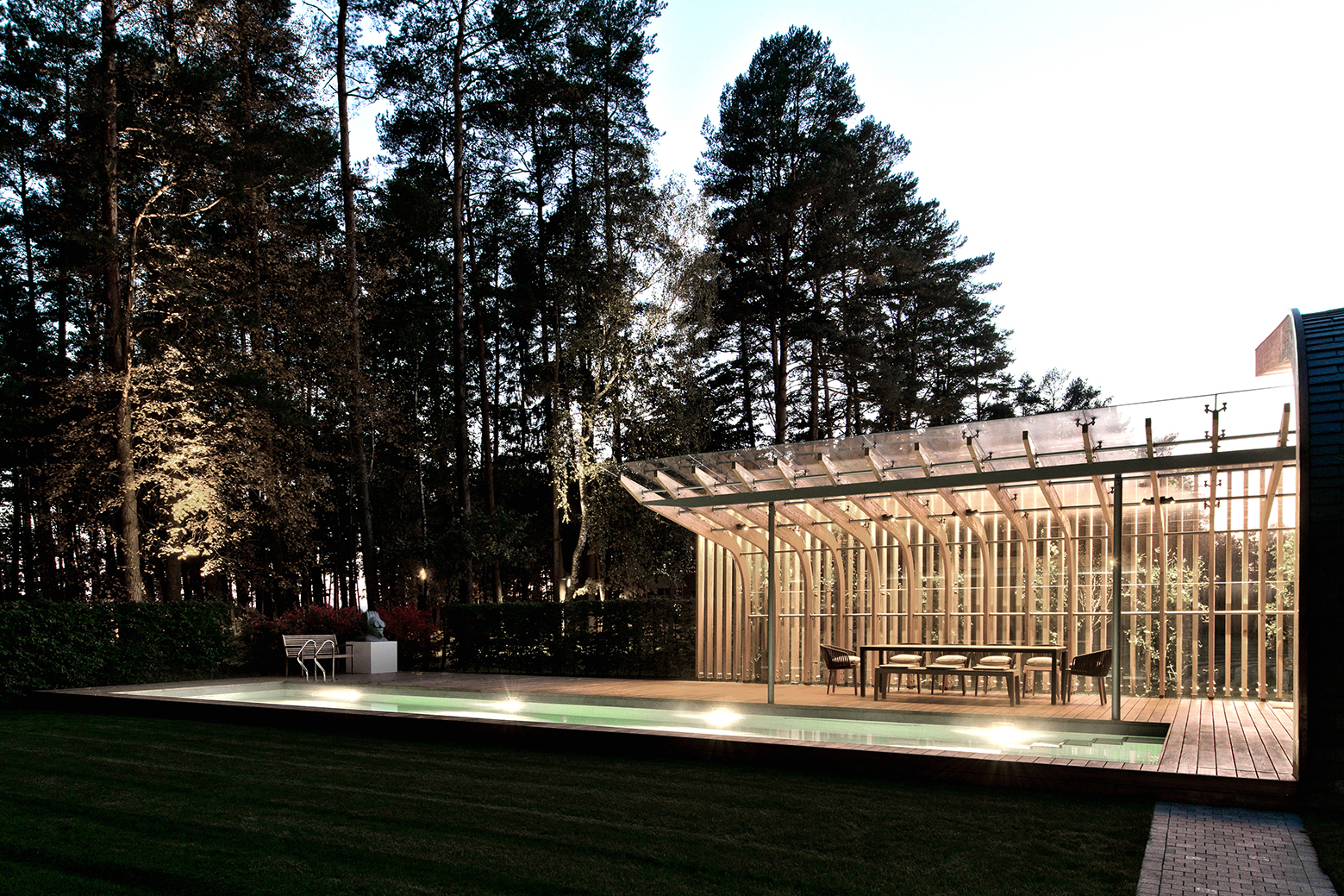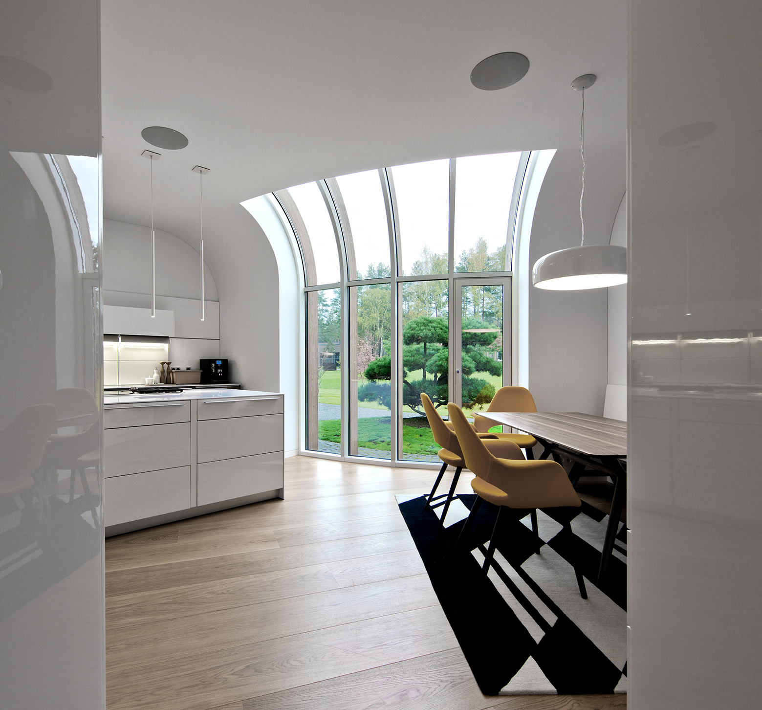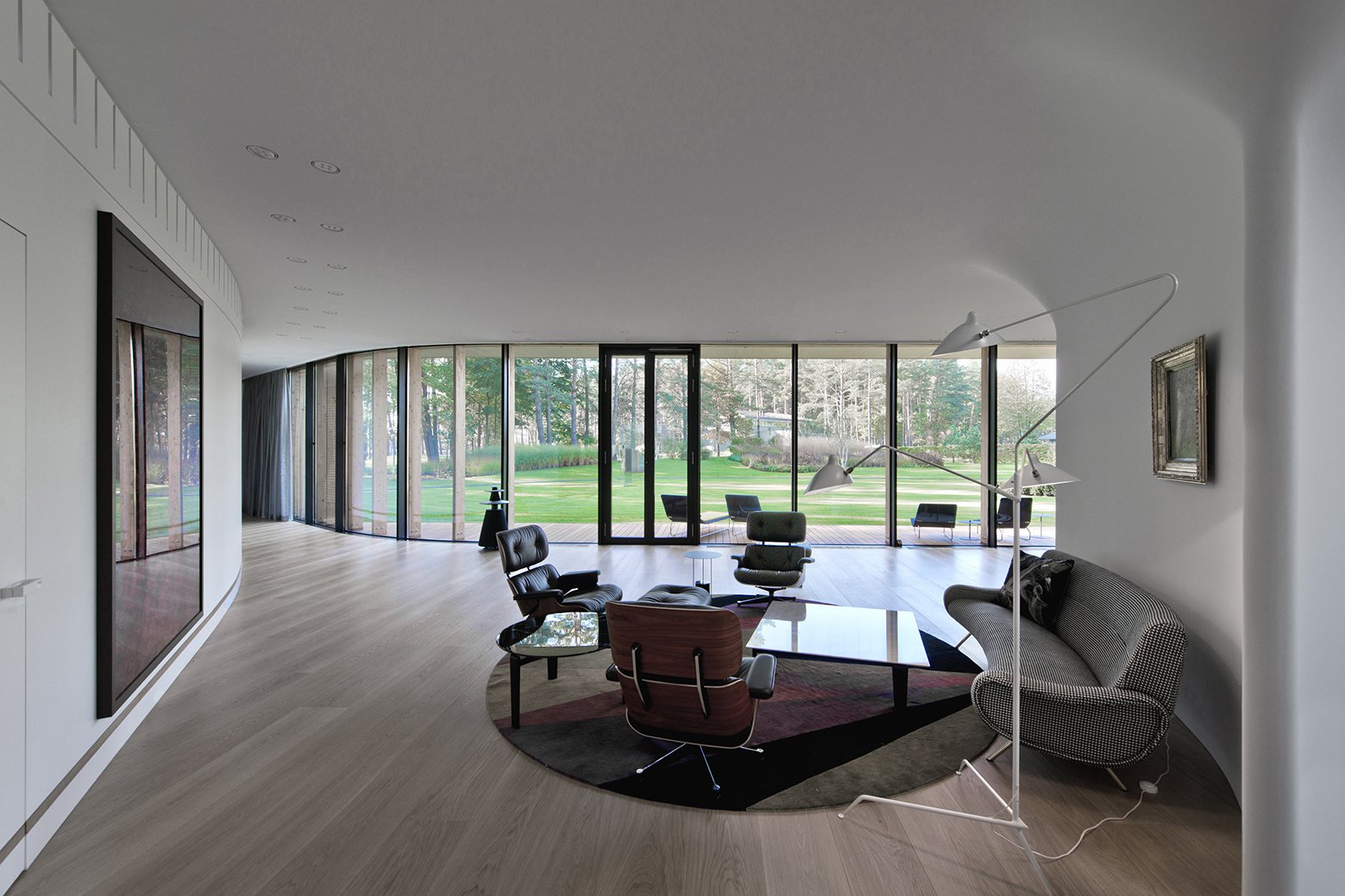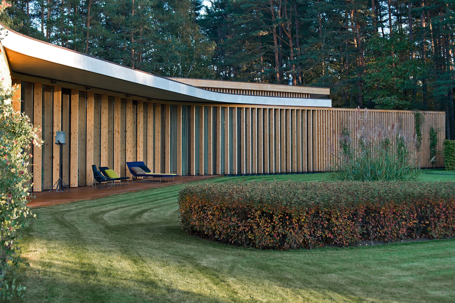 The main architectural idea was provided by its siting in the Pavilniai Regional Park : the house has to dissolve in the landscape. Curved roofs all the way to the ground, and fluid forms extended by timber pergolas, are the most important architectural means achieving this effect.