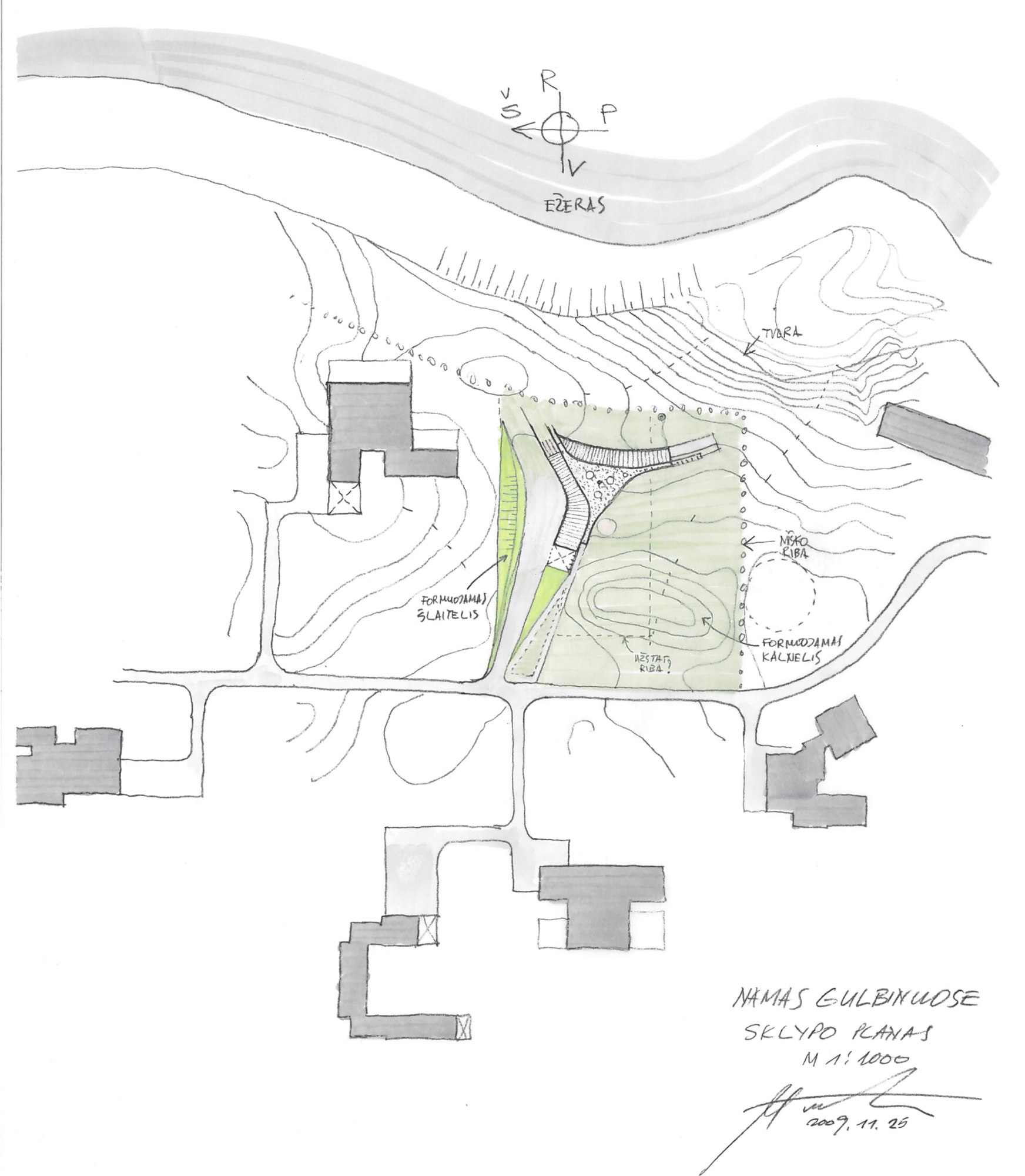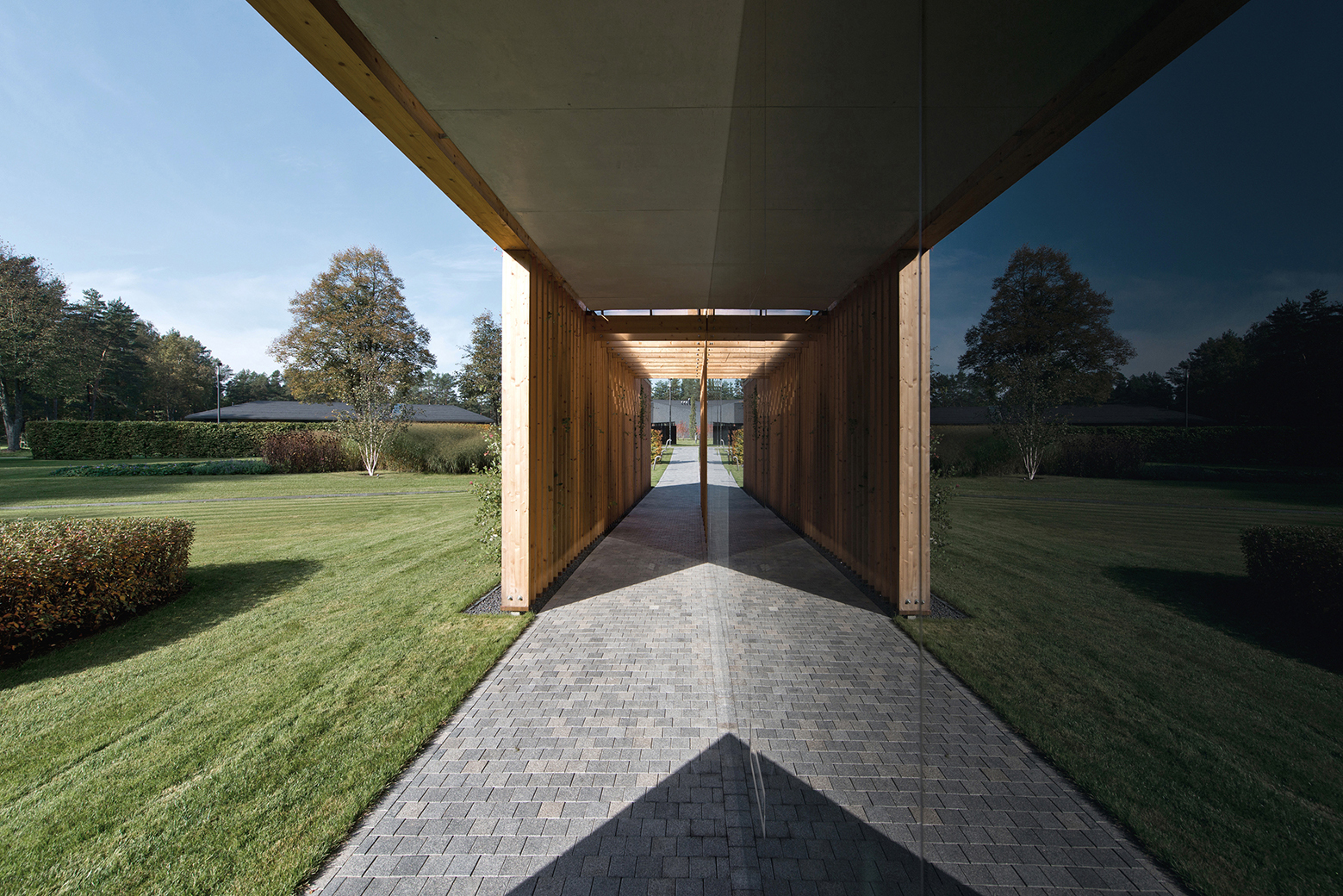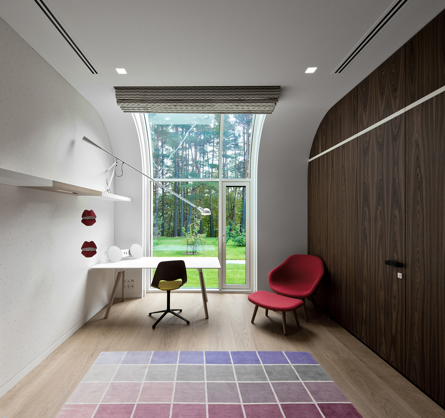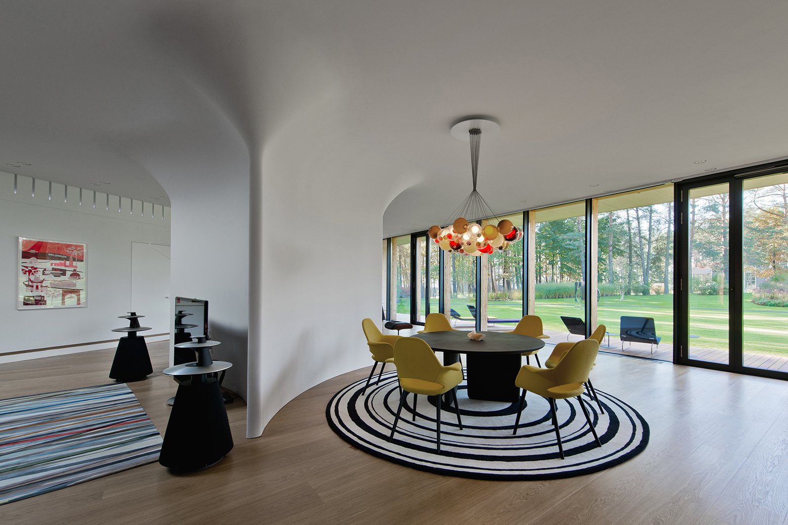 The main architectural idea was provided by its siting in the Pavilniai Regional Park : the house has to dissolve in the landscape. Curved roofs all the way to the ground, and fluid forms extended by timber pergolas, are the most important architectural means achieving this effect.