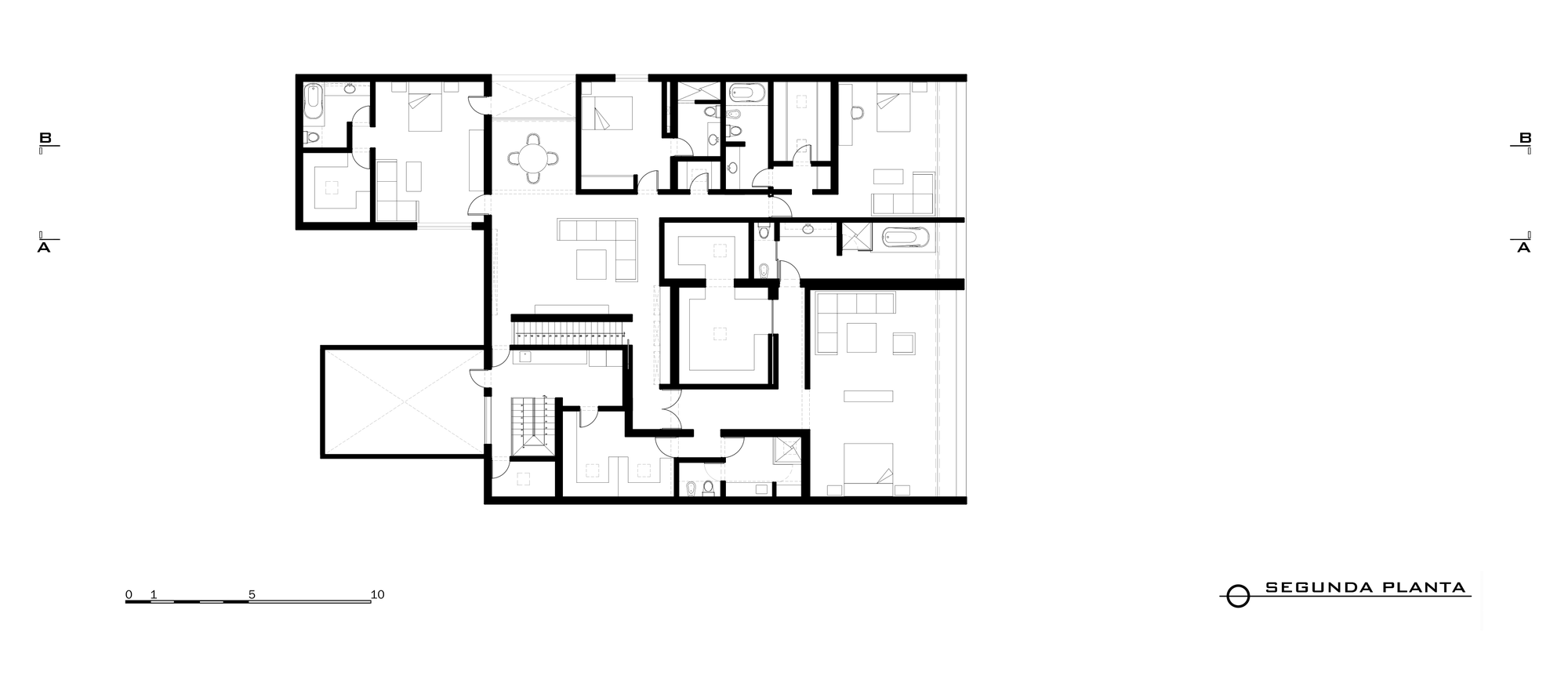 To gain more garden space the house was developed as a three level structure; the study, play room parking, and service area were built underground, while on the ground floor the living room, dinning, kitchen and office open up in search of views of the landscape. On the second floor of the house you find the private spaces around a family room, controlling the views and maintaining its privacy.